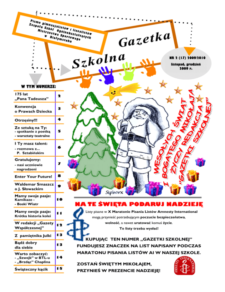 Pism o gim Zesp nazj ołu Szkó al istów i l ł Mist rzos Ogólnok icealistó twa szta łcąc w Sp w B ych iałym ortoweg o stok u Sz a k t e Ga z a n l o k NR 2 (17) 2009/2010 listopad, grudzień 2009 r. W TYM NUMERZE: 175 lat ,,Pana Tadeusza” 2 Konwencja o Prawach Dziecka 3 Otrzęsiny!!! 4 Ze sztuką na Ty: - spotkanie z poetką - warsztaty teatralne 5 I Ty masz talent: - rozmowa z... P. Sztabińskim 6 Gratulujemy: - nasi uczniowie nagrodzeni 7 Enter Your Future! 8 Waldemar Smaszcz 9 o J. Słowackim Mamy swoje pasje: Kamikaze - Boski Wiatr Mamy swoje pasje: Krótka historia kolei 10 NA TE ŚWIĘTA PODARUJ NADZIEJĘ 11 Listy pisane w X Maratonie Pisania Listów Amnesty International mogą przynieść potrzebującym poczucie bezpieczeństwa, W redakcji ,,Gazety 12 Współczesnej” Z pamiętnika Julki 13 Bądź dobry dla siebie 13 wolność, a nawet uratować komuś Ŝycie. Te listy trzeba wysłać! KUPUJĄC TEN NUMER „GAZETKI SZKOLNEJ” FUNDUJESZ ZNACZEK NA LIST NAPISANY PODCZAS MARATONU PISANIA LISTÓW AI W NASZEJ SZKOLE. Warto zobaczyć: - ,,Szwejk” w BTL-u - ,,Brzdąc” Chaplina 14 Świąteczny kącik 15 ZOSTAŃ ŚWIĘTYM MIKOŁAJEM, PRZYNIEŚ W PREZENCIE NADZIEJĘ! PISMO GIMNAZJALISTÓW I LICEALISTÓW ZSOMS W BIAŁYMSTOKU Zdarzyło się... 5 listopada 1901 r. Otwarcie Filharmonii Warszawskiej 9 listopada 1989 r. Upadek muru berlińskiego 13.08.1961 r. Berlin został przez władze NRD podzielony murem. Podczas prób nielegalnego przekraczania muru zginęło 128 osób. W XIX w. tworzył Fryderyk Chopin i Stanisław Moniuszko. Popularność ich muzyki sprawiła, Ŝe w 1901 r. w Warszawie powstała filharmonia, do dziś pełniąca funkcję Filharmonii Narodowej. Koncert inauguracyjny w nowym gmachu miał miejsce 5.11.1901 r. Dopiero 9.11.1989 r. otwarto granicę między Berlinem Wschodnim a Zachodnim. Mur runął. Dziś jego części są sprzedawane jako pamiątki lub stoją jako pomniki, m.in. w Watykanie i siedzibie Parlamentu Europejskiego. 23 grudnia 1977 r. Wybudowanie Centralnej Magistrali Kolejowej Trudno uwierzyć, Ŝe linia kolejowa o parametrach pozwalających jeŜdŜącym po niej pociągom osiągać prędkość nawet do 250 km/h powstała w naszym kraju wcześniej niŜ we Francji. A jednak to prawda - Centralna Magistrala Kolejowa budowana była juŜ wówczas, kiedy francuska linia dla superszybkich pociągów z ParyŜa do Lyonu znajdowała się dopiero w fazie projektów. Oprac. Kamila Golc I Gb 1 7 5 lat ,, Pa n a Ta d e u s z a ” w Ŝyciu naszego narodu. Prelegent tak mówił o dziele Mickiewicza: ,,Jest to list do przyszłych pokoleń wyrzucony w zalakowanej butelce z ginącej Atlantydy. Społeczność, która doczekała się swojej epopei jest juŜ zawsze bezpieczna, bo pamięć o niej przetrwa. Niewiele narodów ma swoją epopeję, my mamy”. Widać, Ŝe wciąŜ jest ona dla nas waŜna - w auli nie było wolnych miejsc. MłodzieŜ chętnie oglądała widowisko i słuchała pieśni w wykonaniu Chóru Miejskiego pod kierunkiem Anny Stankiewicz (wystąpiła w nim równieŜ Ewa Tobiaszewska uczennica klasy III Le naszej szkoły). 175 lat temu w ParyŜu po raz pierwszy wydano ,,Pana Tadeusza” autorstwa Adama Mickiewicza. śeby uczcić pamięć tamtego wydarzenia Urząd Miasta Białegostoku zorganizował uroczystość we wspaniałej Auli Magna w Pałacu Branickich. Uczniowie białostockich gimnazjów mogli przenieść się w świat ,,Pana Tadeusza”. 26 października 2009 r. członkowie redakcji ,,Gazetki Szkolnej” równieŜ uczestniczyli w obchodach rocznicy wydania naszej epopei narodowej. Uczniowie z I, VII i VIII LO w Białymstoku przygotowali dla widzów kilka scen z dzieła Mickiewicza. Zobaczyliśmy pierwsze spotkanie Zosi i Tadeusza, ucztę na zamku Horeszków i oświadczyny młodego Soplicy. W klimat epoki wprowadziły nas przepiękne kostiumy i dobra gra aktorów. Historyk literatury, Waldemar Smaszcz, przybliŜył nam historię powstania ,,Pana Tadeusza” i jego rolę Str. 2 Z niecierpliwością czekamy na kolejną wizytę w Auli Magna Pałacu Branickich, Ŝeby dowiedzieć się więcej na temat innych wielkich Polaków i ich dzieł. Marta Modzelewska, Gabriela Kostecka, Natalia Wojno I Gb GAZETKA SZKOLNA NR 2(17) 2009/2010 (LISTOPAD, GRUDZIEŃ) KONWENCJA O PRAWACH DZIECKA MA JUś DWADZIEŚIA LAT 20 listopada 1989 r. Zgromadzenie Ogólne Narodów Zjednoczonych przyjęło Konwencję o Prawach Dziecka - dokument nazywany światową konstytucją praw dziecka. Konwencja weszła w Ŝycie w 1990 r., Polska ratyfikowała ją w 1991r. Prawa dziecka przysługują kaŜdemu dziecku i Ŝadnego nie moŜna ich pozbawić. Dzieci nie są w stanie same w pełni o siebie zadbać, dlatego naleŜy im się szczególna opieka i ochrona - takŜe prawna. Wraz z urodzeniem kaŜdy człowiek zyskuje swoje prawa, nie trzeba na nie zasłuŜyć poprzez spełnianie jakichś wymagań czy wykonywanie obowiązków. Prawa i obowiązki to dwie całkowicie niezaleŜne od siebie rzeczy. Oto najwaŜniejsze prawa zapisane w Konwencji o Prawach Dziecka: I Prawo do korzystania z wszystkich praw zawartych w Konwencji dla dzieci, czyli osób do ukończenia 18 roku Ŝycia, niezaleŜnie od narodowości, wyznania, płci i zamoŜności ( Artykuły 1, 2 Konwencji…) II Prawo do tego, by państwo czuwało nad przestrzeganiem praw dziecka ( Artykuły 3, 4 Konwencji…) III Prawo do Ŝycia i toŜsamości ( Artykuły 6, 7, 8 Konwencji…) VIII Dobro dziecka celem najwyŜszym ( Artykuły 21, 22, 23, 25 Konwencji…) IX Prawo do godziwych warunków socjalnych ( Artykuły 24, 26, 27 Konwencji…) X Prawo do edukacji ( Artykuły 28, 29, 30 Konwencji…) XI Prawo do odpoczynku ( Artykuł 31 Konwencji…) XII Prawo do ochrony przed przemocą ( Artykuły 19, 32, 33, 34, 35, 36, 39 Konwencji…) XIII Prawo do ochrony przed konfliktem zbrojnym ( Artykuł 38 Konwencji…) XIV Prawo do ochrony w procesie karnym ( Artykuły 37, 40 Konwencji…) IV Prawo do wychowywania w rodzinie ( Artykuły 5, 9, 10, 11, 18, 2