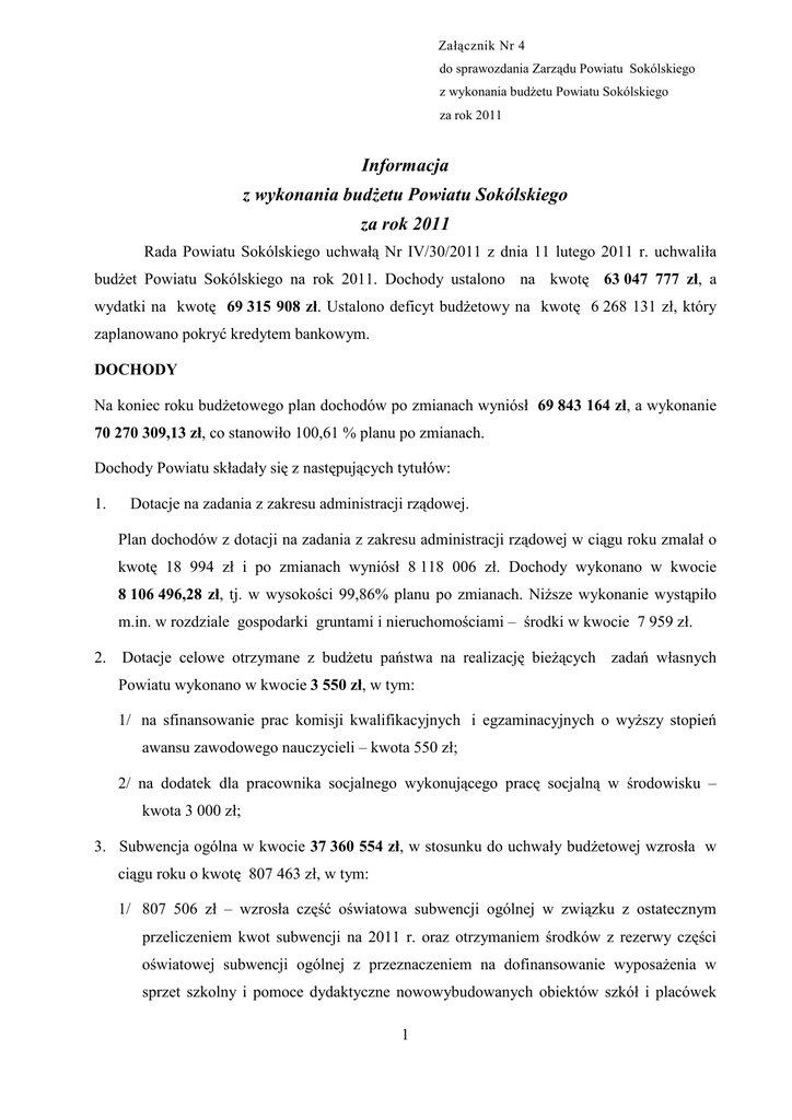 Załącznik Nr 4 do sprawozdania Zarządu Powiatu Sokólskiego z wykonania budżetu Powiatu Sokólskiego za rok 2011 Informacja z wykonania budżetu Powiatu Sokólskiego za rok 2011 Rada Powiatu Sokólskiego uchwałą Nr IV/30/2011 z dnia 11 lutego 2011 r. uchwaliła budżet Powiatu Sokólskiego na rok 2011. Dochody ustalono na kwotę 63 047 777 zł, a wydatki na kwotę 69 315 908 zł. Ustalono deficyt budżetowy na kwotę 6 268 131 zł, który zaplanowano pokryć kredytem bankowym. DOCHODY Na koniec roku budżetowego plan dochodów po zmianach wyniósł 69 843 164 zł, a wykonanie 70 270 309,13 zł, co stanowiło 100,61 % planu po zmianach. Dochody Powiatu składały się z następujących tytułów: 1. Dotacje na zadania z zakresu administracji rządowej. Plan dochodów z dotacji na zadania z zakresu administracji rządowej w ciągu roku zmalał o kwotę 18 994 zł i po zmianach wyniósł 8 118 006 zł. Dochody wykonano w kwocie 8 106 496,28 zł, tj. w wysokości 99,86% planu po zmianach. Niższe wykonanie wystąpiło m.in. w rozdziale gospodarki gruntami i nieruchomościami – środki w kwocie 7 959 zł. 2. Dotacje celowe otrzymane z budżetu państwa na realizację bieżących zadań własnych Powiatu wykonano w kwocie 3 550 zł, w tym: 1/ na sfinansowanie prac komisji kwalifikacyjnych i egzaminacyjnych o wyższy stopień awansu zawodowego nauczycieli – kwota 550 zł; 2/ na dodatek dla pracownika socjalnego wykonującego pracę socjalną w środowisku – kwota 3 000 zł; 3. Subwencja ogólna w kwocie 37 360 554 zł, w stosunku do uchwały budżetowej wzrosła w ciągu roku o kwotę 807 463 zł, w tym: 1/ 807 506 zł – wzrosła część oświatowa subwencji ogólnej w związku z ostatecznym przeliczeniem kwot subwencji na 2011 r. oraz otrzymaniem środków z rezerwy części oświatowej subwencji ogólnej z przeznaczeniem na dofinansowanie wyposażenia w sprzet szkolny i pomoce dydaktyczne nowowybudowanych obiektów szkół i placówek 1 oświatowych oraz nowych pomieszczeń do nauki, 2/ 43 zł – zmalała część równoważąca w związku z ostatecznym przeliczeniem kwot subwencji na 2011 r; 4. Udział Powiatu w podatkach stanowiących dochód budżetu państwa - otrzymano 5 164 421,30 zł na plan 4 964 002 zł, co stanowi 104,04%, w tym: 1/ udział w podatku dochodowym od osób fizycznych – 5 048 637 zł; 2/ udział w podatku dochodowym od osób prawnych – 5. Dotacja celowa otrzymana 115 784,30 zł; z tytułu pomocy finansowej udzielanej między jednostkami samorządu terytorialnego na dofinansowanie własnych zadań bieżących wyniosły 279 217,80 zł, w tym: 1/ 229 693,80 zł – środki na modernizacje dróg pozyskane od gmin: Sokółka, Szudziałowo, Janów; 2/ 34 524 zł – dofinansowanie działalności warsztatów terapii zajęciowej w Sokółce i Dąbrowie Białostockiej przez Gminy: Dąbrowa Białostocka, Sidra, Kuźnica, Suchowola, Nowy Dwór i Powiat Augustowski; 3/ 10 000 zł – środki pozyskane od Gminy Suchowola na dofinansowanie działalności Powiatowej Młodzieżowej Orkiestry Dętej w ZS Suchowoli; 4/ 5 000 zł - środki pozyskane od Gminy Suchowola na zorganizowanie wyjazdu uczniów na zawody sportowe; 6. Dotacja celowa otrzymana z tytułu pomocy finansowej udzielanej między jednostkami samorządu terytorialnego na dofinansowanie własnych zadań inwestycyjnych i zakupów inwestycyjnych wyniosły 4 812 809,20 zł, w tym: 1/ środki na inwestycje drogowe – 4 001 629zł, z tego na: - opracowanie dokumentacji i przebudowę drogi powiatowej nr 1321B na odcinku od drogi wojewódzkiej nr 670 Bagny – Jałówka – Kopciówka – Połomin – Krasne – Trofimówka w kwocie 2 694 612 zł, pozyskane od Gmin: Suchowola – 1 577 844,80 zł, Janów – 250 000,40 zł, Dąbrowa Białostocka – 866 766,80 zł, - przebudowę mostu dwuprzęsłowego na drodze powiatowej nr 1337B przez rzekę Brzozówkę k/m Karpowicze o dł. 32 m. wraz z dojazdami - kwota 778 202 zł przekazana przez Gminę Suchowola, - opracowanie dokumentacji na przebudowę mostu na przepust w km. 4+000 na drodze 2 nr 1245B Harasimowicze – Wielki Staw k/m Wielki Staw wraz z dojazdami – kwota 32 595 zł przekazana przez Gminę Dąbrowa Białostocka,, - opracowanie skróconej dokumentacji na przebudowę dróg nr 1313B (od drogi nr 8 do Milewszczyzny), 1316B (Milewszczyzna – Przystawka) – kwota 35 260 zł pozyskana od Gmin: Korycin i Janów, - “Przebudowa ciągu komunikacyjnego dróg powiatowych nr 1257B Kuźnica – Litwiniki – Bienasze – Śniczany, drogi powiatowej nr 1261B Śniczany – Jurasze – Sidra i drogi powiatowej nr 1252B Sidra – Słomianka – do drogi wojewódzkiej nr 673 jako usprawnienie połączenia do przejścia granicznego w Kuźnicy” oraz aktualizacja stadium i dokumentacji - kwota 4 920 zł otrzymana od Gmin Sidra i Kuźnica, - opracowanie skróconej dokumentacji na przebudowę drogi nr 1307B Przystawka – Długi Ług – Ostra Góra – Łosiniec – granica Powiatu – kwota 42 640 zł pozyskana od Gmin: Janów i Korycin, - przebudowa drogi powiatowej nr 1324B na odcinku Wasilówka – Marchelówka na dł ok. 1,06 km – Janów – kwota 184 584 zł pozyskana od Gminy Janów, - integracja dróg lokalnych z drogą krajową Nr 8 Nr 1318B Korycin – Zakale, nr 1315B Dzięciołówka – Długi Ług – Białousy, nr 1319B Mielewszczyzna – droga powiatowa nr 1318B, nr 1313B Korycin – Rudka – Dzięciołówka – Nowinka – Ostra Góra – kwota 228 816 zł pozyskana od Gminy Janów, 2/ środki na budowę hali sportowej przy Zespole Szkół w Dabrowie Białostockiej – kwota 800 000 zł otrzymana z PFRON na podstawie porozumienia z Marszałkiem Województwa Podlaskiego, 3/ środki na zakup i wymianę drzwi wejściowych na oddział dziecięcy w SP ZOZ w Sokółce w kwocie 9 180,20 zł pozyskane od Gminy Sokółka, 4/ środki na zakup sprzętu medycznego na oddział opieki długoterminowej SP ZOZ w Sokółce w kwocie 2 000 zł pozyskane od Gminy Kuźn