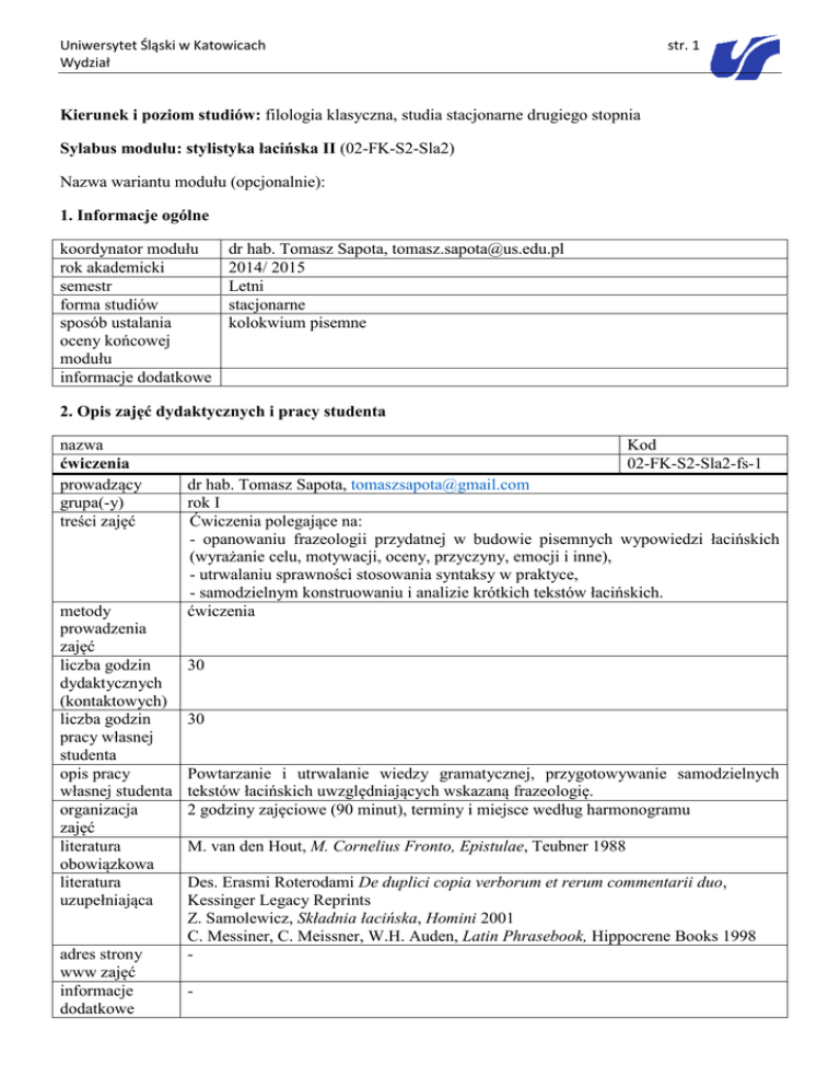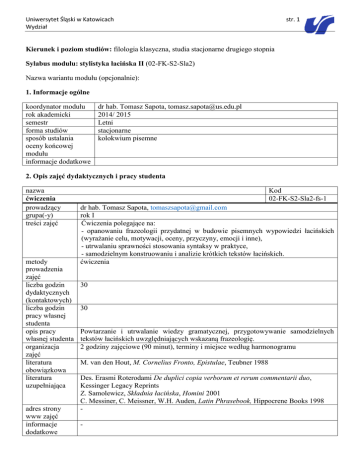 Uniwersytet Śląski w Katowicach Wydział str. 1 Kierunek i poziom studiów: filologia klasyczna, studia stacjonarne drugiego stopnia Sylabus modułu: stylistyka łacińska II (02-FK-S2-Sla2) Nazwa wariantu modułu (opcjonalnie): 1. Informacje ogólne koordynator modułu rok akademicki semestr forma studiów sposób ustalania oceny końcowej modułu informacje dodatkowe dr hab. Tomasz Sapota, [email protected] 2014/ 2015 Letni stacjonarne kolokwium pisemne 2. Opis zajęć dydaktycznych i pracy studenta nazwa ćwiczenia prowadzący grupa(-y) treści zajęć metody prowadzenia zajęć liczba godzin dydaktycznych (kontaktowych) liczba godzin pracy własnej studenta opis pracy własnej studenta organizacja zajęć literatura obowiązkowa literatura uzupełniająca adres strony www zajęć informacje dodatkowe Kod 02-FK-S2-Sla2-fs-1 dr hab. Tomasz Sapota, [email protected] rok I Ćwiczenia polegające na: - opanowaniu frazeologii przydatnej w budowie pisemnych wypowiedzi łacińskich (wyrażanie celu, motywacji, oceny, przyczyny, emocji i inne), - utrwalaniu sprawności stosowania syntaksy w praktyce, - samodzielnym konstruowaniu i analizie krótkich tekstów łacińskich. ćwiczenia 30 30 Powtarzanie i utrwalanie wiedzy gramatycznej, przygotowywanie samodzielnych tekstów łacińskich uwzględniających wskazaną frazeologię. 2 godziny zajęciowe (90 minut), terminy i miejsce według harmonogramu M. van den Hout, M. Cornelius Fronto, Epistulae, Teubner 1988 Des. Erasmi Roterodami De duplici copia verborum et rerum commentarii duo, Kessinger Legacy Reprints Z. Samolewicz, Składnia łacińska, Homini 2001 C. Messiner, C. Meissner, W.H. Auden, Latin Phrasebook, Hippocrene Books 1998 - Uniwersytet Śląski w Katowicach Wydział str. 2 3. Opis sposobów weryfikacji efektów kształcenia modułu Nazwa kod 02-FK-S2-Sla2-w-1 Kolokwium pisemne kod(-y) zajęć 02-FK-S2-Sla2-fs-1 osoba(-y) jak w tabeli 2 przeprowadzająca(e) weryfikację grupa(-y) rok I wymagania Umiejętność sprawnego posługiwania się łacińską fleksją i składnią, pamięciowe merytoryczne opanowanie frazeologii analizowanej podczas zajęć. kryteria oceny Ocena sprawdzianu pisemnego. przebieg procesu Kolokwium pisemne na ostatnich zajęciach w semestrze. weryfikacji informacje dodatkowe