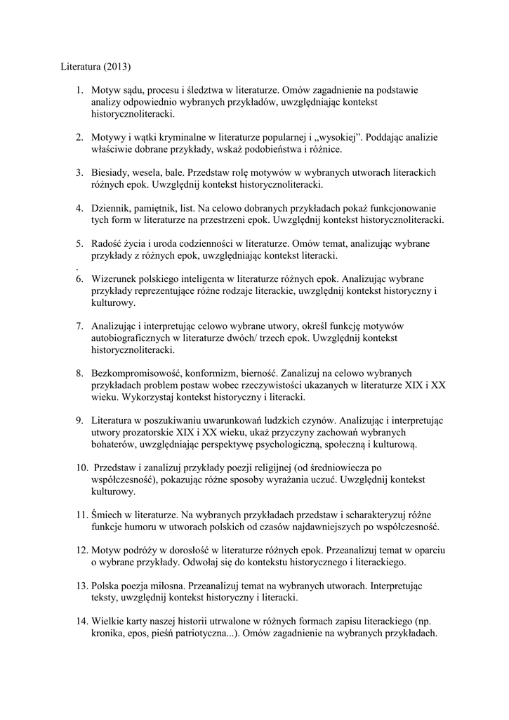 Literatura (2013) 1. Motyw sądu, procesu i śledztwa w literaturze. Omów zagadnienie na podstawie analizy odpowiednio wybranych przykładów, uwzględniając kontekst historycznoliteracki. 2. Motywy i wątki kryminalne w literaturze popularnej i „wysokiej”. Poddając analizie właściwie dobrane przykłady, wskaż podobieństwa i różnice. 3. Biesiady, wesela, bale. Przedstaw rolę motywów w wybranych utworach literackich różnych epok. Uwzględnij kontekst historycznoliteracki. 4. Dziennik, pamiętnik, list. Na celowo dobranych przykładach pokaż funkcjonowanie tych form w literaturze na przestrzeni epok. Uwzględnij kontekst historycznoliteracki. 5. Radość życia i uroda codzienności w literaturze. Omów temat, analizując wybrane przykłady z różnych epok, uwzględniając kontekst literacki. . 6. Wizerunek polskiego inteligenta w literaturze różnych epok. Analizując wybrane przykłady reprezentujące różne rodzaje literackie, uwzględnij kontekst historyczny i kulturowy. 7. Analizując i interpretując celowo wybrane utwory, określ funkcję motywów autobiograficznych w literaturze dwóch/ trzech epok. Uwzględnij kontekst historycznoliteracki. 8. Bezkompromisowość, konformizm, bierność. Zanalizuj na celowo wybranych przykładach problem postaw wobec rzeczywistości ukazanych w literaturze XIX i XX wieku. Wykorzystaj kontekst historyczny i literacki. 9. Literatura w poszukiwaniu uwarunkowań ludzkich czynów. Analizując i interpretując utwory prozatorskie XIX i XX wieku, ukaż przyczyny zachowań wybranych bohaterów, uwzględniając perspektywę psychologiczną, społeczną i kulturową. 10. Przedstaw i zanalizuj przykłady poezji religijnej (od średniowiecza po współczesność), pokazując różne sposoby wyrażania uczuć. Uwzględnij kontekst kulturowy. 11. Śmiech w literaturze. Na wybranych przykładach przedstaw i scharakteryzuj różne funkcje humoru w utworach polskich od czasów najdawniejszych po współczesność. 12. Motyw podróży w dorosłość w literaturze różnych epok. Przeanalizuj temat w oparciu o wybrane przykłady. Odwołaj się do kontekstu historycznego i literackiego. 13. Polska poezja miłosna. Przeanalizuj temat na wybranych utworach. Interpretując teksty, uwzględnij kontekst historyczny i literacki. 14. Wielkie karty naszej historii utrwalone w różnych formach zapisu literackiego (np. kronika, epos, pieśń patriotyczna...). Omów zagadnienie na wybranych przykładach. 15. Problemy, niepokoje i dążenia człowieka w polskiej liryce współczesnej. Poddaj analizie i interpretacji wybrane utwory. 16. Rola i doświadczenie obcowania z naturą w literaturze różnych epok. Przedstaw problem, odwołując się do wybranych utworów. Uwzględnij kontekst historycznoliteracki. 17. Historia jako temat i jako pretekst w polskiej literaturze XIX i XX wieku. Przeanalizuj wybrane utwory, uwzględniając kontekst kulturowy. 18. Romans w literaturze „wysokiej” i popularnej. Na podstawie analizy celowo wybranych przykładów omów różne sposoby funkcjonowania tego schematu fabularnego. 19. Obowiązki literatury. Jak pisarze różnych epok interpretowali zagadnienie własnej powinności wobec narodu, społeczeństwa, człowieka? Przedstaw problem, analizując wybrane przykłady i uwzględniając kontekst historycznoliteracki. 20. Motyw brzydoty i jego funkcja w literaturze. Zaprezentuj temat, analizując odpowiednie przykłady literackie. Uwzględnij kontekst historycznoliteracki. 21. Złożoność psychiczna bohaterów Szekspira. Przedstaw zagadnienie, analizując motywy działania postaci w wybranych dramatów. 22. Wyznanie, spowiedź, ekspiacja...Odwołując się do celowo wybranych utworów i uwzględniając ich kontekst kulturowy, przedstaw funkcje powyższych motywów w dziełach literackich. 23. Symbol, alegoria, przypowieść – ich istota i funkcjonowanie w literaturze. Przedstaw problem, analizując wybrane przykłady. Uwzględnij kontekst historycznoliteracki. 24. Pycha i pokora. Zanalizuj przykłady literackie, które badają źródła i skutki tych dwóch postaw. Uwzględnij odpowiedni kontekst historycznoliteracki. 25. Obrazy śmierci heroicznej i nieheroicznej. Na celowo dobranych przykładach dokonaj analizy opisów umierania i omów ich znaczenie dla interpretacji utworów. Uwzględnij kontekst historycznoliteracki. 26. Odwołując się do wybranych dzieł, pokaż różnorodność funkcjonowania motywu arkadii w literaturze pięknej różnych epok. Uwzględnij kontekst historycznoliteracki. 27. Kobieta fatalna i jej różne wcielenia literackie. Omów zagadnienie, analizując odpowiednie przykłady z różnych epok oraz wykorzystując kontekst historyczny i kulturowy. 28. Odwołując się do odpowiednio wybranych przykładów literackich z różnych epok, zanalizuj motyw niezawinionego cierpienia. Uwzględnij kontekst kulturowy i literacki. 29. Synkretyzm rodzajowy i gatunkowy. Zbadaj zagadnienie na przykładach różnych epok. Odwołaj się do kontekstu historycznoliterackiego. 30. „Straszni mieszczanie…” Portret mieszczaństwa w ujęciu obiektywnym i karykaturalnym. Omów zagadnienie, interpretując wybrane przykłady z literatury XIX i XX wieku. Uwzględnij kontekst historyczny i kulturowy. 31. Poezja buntu i niezgody. Zbadaj zjawisko opozycyjność powojennej poezji polskiej wobec komunizmu, analizując twórczość wybranych autorów krajowych i emigracyjnych. 32. Literackie rozważania o społecznych nobilitacjach i mezaliansach. Przywołaj i zanalizuj odpowiednie przykłady. Uwzględnij kontekst historycznoliteracki. 33. Zbadaj doświadczenie samotności jako temat literatury różnych epok. Zanalizuj odpowiednie przykłady, podejmij próbę klasyfikacji zjawiska, uwzględniając kontekst historycznoliteracki. 34. Dzieci jako ofiary totalitaryzmu. Przedstaw literackie sposoby ujęcia problemu, analizując wybrane utwory XX wieku. Uwzględnij kontekst historyczny. 35. Sarmackie dziedzictwo w ujęciu r