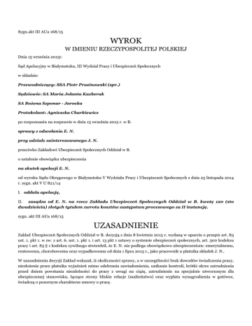 Sygn.akt III AUa 168/15 WYROK W IMIENIU RZECZYPOSPOLITEJ POLSKIEJ Dnia 15 września 2015r. Sąd Apelacyjny w Białymstoku, III Wydział Pracy i Ubezpieczeń Społecznych w składzie: Przewodniczący: SSA Piotr Prusinowski (spr.) Sędziowie: SA Maria Jolanta Kazberuk SA Bożena Szponar - Jarocka Protokolant: Agnieszka Charkiewicz po rozpoznaniu na rozprawie w dniu 15 września 2015 r. w B. sprawy z odwołania E. N. przy udziale zainteresowanego J. N. przeciwko Zakładowi Ubezpieczeń Społecznych Oddział w B. o ustalenie obowiązku ubezpieczenia na skutek apelacji E. N. od wyroku Sądu Okręgowego w Białymstoku V Wydziału Pracy i Ubezpieczeń Społecznych z dnia 25 listopada 2014 r. sygn. akt V U 821/14 I. oddala apelację, II. zasądza od E. N. na rzecz Zakładu Ubezpieczeń Społecznych Oddział w B. kwotę 120 (sto dwadzieścia) złotych tytułem zwrotu kosztów zastępstwa procesowego za II instancję. sygn. akt III AUa 168/15 UZASADNIENIE Zakład Ubezpieczeń Społecznych Oddział w B. decyzją z dnia 8 kwietnia 2013 r. wydaną w oparciu o przepis art. 83 ust. 1. pkt 1. w zw. z art. 6. ust. 1. pkt 1. i art. 13 pkt 1 ustawy o systemie ubezpieczeń społecznych, art. 300 kodeksu pracy i art. 83 § 1 kodeksu cywilnego stwierdził, że E. N. nie podlega obowiązkowo ubezpieczeniom: emerytalnemu, rentowemu, chorobowemu oraz wypadkowemu od dnia 1 lipca 2013 r., jako pracownik u płatnika składek J. N.. W uzasadnieniu decyzji Zakład wskazał, iż okoliczności sprawy, a w szczególności brak dowodów świadczenia pracy, niezłożenie przez płatnika wyjaśnień mimo odebrania zawiadomienia, unikanie kontroli, krótki okres zatrudnienia przed dniem powstania niezdolności do pracy z uwagi na ciążę, zatrudnienie na specjalnie utworzonym dla ubezpieczonej stanowisku, łączące strony bliskie relacje (małżeństwo) oraz wypłata wynagrodzenia w gotówce, świadczą o pozornym charakterze umowy o pracę. Zadaniem organu rentowego powyższe okoliczności uzasadniają przekonanie, że umowa o pracę między E. N. a J. N. została zawarta jedynie w celu uzyskania przez wnioskodawczynię świadczeń z ubezpieczenia społecznego. Opisana decyzja została zaskarżona przez E. N., która zarzuciła jej naruszenie art. 6 ust 1 pkt 1 i art. 13 pkt 1 ustawy o systemie ubezpieczeń społecznych oraz art. 83 § 1 kodeksu cywilnego i art. 22 kodeksu pracy – poprzez ich błędną wykładnię, a w konsekwencji wadliwe zastosowanie, co poskutkowało błędnym przyjęciem, iż nie jest pracownikiem i w związku z tym nie podlega obowiązkowym ubezpieczeniom od dnia nawiązania stosunku pracy, tj. od 01.07.2013 r., a umowa o pracę została zawarta dla pozoru, podczas gdy wykonywana przez nią praca od dnia 1.07.2013 r. spełnia wszystkie elementy stosunku pracy, wskazane w przepisie art. 22 kodeksu pracy i w związku z tym jako pracownik podlega ubezpieczeniom społecznym od dnia nawiązania stosunku pracy. Mając na uwadze tak sformułowany zarzut wnioskodawczyni wniosła o zmianę zaskarżonej decyzji w całości poprzez uznanie, iż podlega ona obowiązkowym ubezpieczeniom od dnia 01.07.2013 r. Sąd Okręgowy w Białymstoku wyrokiem z dnia 25 listopada 2015 r. oddalił odwołanie. Sąd ten ustalił, że E. N. oraz J. N. od 1997 roku pozostają w związku małżeńskim, prowadzą wspólne gospodarstwo domowe i posiadają troje małoletnich dzieci ((...)r.). J. N. od stycznia 2002 r. prowadzi działalność gospodarczą pod nazwą CENTRAL J. N., w zakresie handlu (dokładne określenie według (...) sprzedaż hurtowa niewyspecjalizowana). Działalność ta wykonywana jest w ramach sprzedaży sklepowej (sklep z biżuterią srebrną i sztuczną w Z., a w 2013 roku także sklep bieliźniarski w G.) oraz sprzedaży bezpośredniej (akwizycyjnej). Działalność akwizycyjna zainteresowanego prowadzona jest w różnych miastach na terenie całej Polski i związana jest ze sprzedażą biżuterii oraz innych wyrobów jubilerskich bezpośrednio u klientów indywidualnych – najczęściej w urzędach, szkołach i innych placówkach, w których pracują kobiety. W dniu 1 lipca 2013 roku pomiędzy małżonkami została zawarta umowa o pracę na czas nieokreślony. Na jej mocy E. N. została zatrudniona na stanowisku przedstawiciela handlowego w pełnym wymiarze czasu pracy, z wynagrodzeniem wynoszącym 4000 zł brutto. Miejsce wykonywania pracy zostało określone jako „teren całej Polski”. Zakres czynności skarżącej nie został sporządzony na piśmie. Z twierdzeń wnioskodawczyni i jej męża wynikało, iż do jej obowiązków należało pozyskiwanie nowych klientów oraz utrzymywanie kontaktów z dotychczasowymi, a także reklama i sprawy biurowe (podpisywanie umów i kontakt z księgową). Przed zawarciem umowy, E. N. pomagała mężowi, co polegało na dokonywaniu wyceny biżuterii, rozdzieleniu jej między pracowników i sprawdzeniu jej stanu u każdego sprzedawcy Skarżąca pomagała mężowi przy prowadzeniu działalności gospodarczej od początku jej istnienia, lecz nigdy wcześniej nie była formalnie zatrudniona. W lipcu i sierpniu odwołująca wraz z mężem i dziećmi, a także innymi pracownikami przebywała w górach w wynajętym przez męża pensjonacie. Z oświadczeń stron i zeznań świadków wynikało, że pobyt w górach wiązał się z wyjazdami pracowników „w teren” w celu sprzedaży biżuterii. Sąd pierwszej instancji przyjął również, że w okresie od 30 sierpnia 2013 r. do 23 października 2013 r. skarżąca przebywała na zwolnieniach lekarskich w związku z ciążą, a od 24 października 2013 r. pobierała zasiłek macierzyński. W chwili zawierania umowy była w piątym miesiącu ciąży, a przed zatrudnieniem przez J. N. nie posiadała tytułu do podlegania obowiązkowym ubezpieczeniom społecznym. Zeznania świadków nie budziły zasadniczych wątpliwości Sądu Okręgowego. Fakty podane przez strony także nie budziły większych zastrzeżeń Sądu i były w z