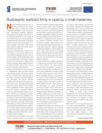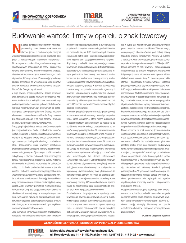 promocja Projekt wspó∏finansowany ze Êrodków Unii Europejskiej w ramach Europejskiego Funduszu Rozwoju Regionalnego Budowanie wartości firmy w oparciu o znak towarowy a coraz bardziej konkurencyjnym rynku roz- N może mieć podstawowe znaczenie z punktu widzenia cja w trybie tzw. wspólnotowego znaku towarowego poznawalny przez klientów znak towarowy popularności danych towarów (usług) wśród klientów, przez Urząd ds. Harmonizacji Rynku Wewnętrznego, stanowi jedno z podstawowych narzędzi co przekłada się na ilość sprzedawanych towarów występującego obecnie również pod polską nazwą w działalności przedsiębiorstw, często stanowiąc jego i usług, a co za tym idzie – także dochody przedsiębior- Urząd ds. Znaków Towarowych i Wzorów UE (OHIM) jeden z najważniejszych składników majątkowych. stwa, jego wartość i pozycję konkurencyjną na rynku. z siedzibą w Alicante w Hiszpanii, gwarantująca ochro- Opracowywane co roku różnego rodzaju rankingi zna- Aby interesy przedsiębiorstwa, związane z jego znakiem nę znaku automatycznie we wszystkich 27 krajach UE. ków towarowych potwierdzają, że znany i cieszący się towarowym (znakami towarowymi) były skutecznie za- Prawo ochronne na znak towarowy i prawo do znaku renomą znak towarowy może mieć ogromną wartość, bezpieczone, w szczególności poprzez zakazanie in- wspólnotowego są prawami wyłącznymi, majątkowymi niejednokrotnie przekraczającą wartość samego przed- nym podmiotom bezprawnej eksploatacji znaku, i zbywalnymi, co ma istotne znaczenie z punktu widze- siębiorstwa, które go używa. Przemawiającym do wy- konieczne jest zadbanie o prawną ochronę znaku. nia budowania wartości firmy. Po pierwsze, prawo takie obraźni przykładem są wyceniane na setki milionów Gwarantuje ją przede wszystkim rejestracja znaku towa- stanowi – posiadający określoną wartość – składnik dolarów najdroższe światowe znaki towarowe, takie jak: rowego, dająca wyłączność w zakresie zawodowego przedsiębiorstwa, przy czym szczególnie wysoką war- Coca-Cola, Google czy Microsoft. i zarobkowego korzystania ze znaku dla zgłoszonych tość mają przede wszystkim znaki powszechnie znane Z tego powodu charakterystyczny i dobrze chroniony towarów i usług na danym terytorium (w tym używania i renomowane. Wartość ekonomiczna znaku towarowe- znak towarowy to często niezwykle dochodowa wła- znaku w celach reklamowych) oraz możliwość przeciw- go wpływa więc w sposób bezpośredni na wartość ca- sność intelektualna przedsiębiorstwa, która w wielu wy- stawiania się takiemu używaniu znaku przez inne pod- łego przedsiębiorstwa, co ma znaczenie w przypadku padkach przesądza o sukcesie rynkowej oferty towarów mioty, które może wprowadzać konsumenta w błąd lub zbycia przedsiębiorstwa, wyceny masy upadłościowej, lub usług reklamowanych, czy oferowanych do sprze- osłabiać renomę znaku. zastawu, zabezpieczenia kredytu/dotacji na inwestycje. daży przez dane przedsiębiorstwo. Dlatego istotnym W świetle przepisów prawa własności przemysłowej, Prawo do znaku towarowego ma także zdolność bilan- elementem budowania wartości każdej firmy powinna w charakterze znaku towarowego może być zarejestro- sową co oznacza, że może być wniesione jako aport do być efektywna strategia w zakresie ochrony i promocji wane każde oznaczenie, które można przedstawić nowo tworzonej spółki. Stwarza to przedsiębiorstwu moż- jej znaku towarowego (znaków towarowych). w sposób graficzny pod warunkiem, że nadaje się do liwość tworzenia nowego podmiotu gospodarczego Tradycyjną i najważniejszą funkcją znaków towarowych odróżnienia towarów jednego przedsiębiorstwa od to- w oparciu o wartość istniejącego znaku towarowego. jest indywidualizacja źródła pochodzenia towarów warów innego przedsiębiorstwa. W charakterze znaków Prawo ochronne na znak towarowy (prawo do znaku i usług. Realizując tę funkcję, znak towarowy wskazuje towarowych mogą być rejestrowane: wyraz, rysunek, or- wspólnotowego), jako prawo o charakterze zbywalnym, klientom, że wszystkie towary (usługi) oznaczone da- nament, kompozycja kolorystyczna, forma przestrzen- może być przedmiotem obrotu, a co za tym idzie – ge- nym znakiem pochodzą od konkretnego przedsiębior- na, w tym forma towaru lub opakowania. W kontekście nerowania dochodów dla przedsiębiorstwa z tytułu eks- stwa. Jednocześnie znak towarowy identyfikuje budowania wartości firmy na rynku on-line, należy zwró- ploatacji znaku przez inne podmioty. Podstawową (wyodrębnia) towar (usługę) na tle oferty podobnych to- cić uwagę na możliwość rejestrowania w charakterze formą komercjalizacji prawa ochronnego na znak towarowy jest „udostępnianie” znaku innym przedsiębior- warów (usług) na rynku. Tym samym odróżnia między znaków towarowych oznaczeń mających postać adre- sobą towary w obrocie. Ochrona funkcji odróżniającej sów internetowych stwom na podstawie umów licencyjnych lub umów towaru ma podstawowe znaczenie z punktu widzenia („www.xyz.pl” lub „xyz.pl”). Dotyczy to jednak tylko tych franchisingowych. Z tytułu opłat licencyjnych czy fran- eliminowania możliwości wprowadzenia odbiorców domen, które są używane w celu identyfikacji towarów chisingowych uprawniony może czerpać stałe docho- w błąd co do źródła pochodzenia towarów, w tym ich (usług) oferowanych i reklamowych w powiązaniu z ta- dy, niezależne od aktualnej kondycji rynkowej jakości. Pochodną funkcji odróżniającej jest bowiem ką domeną. Uzyskanie ochrony ma o tyle znaczenie, że przedsiębiorstwa. W tym sensie znak towarowy jest na- właśnie funkcja gwarancyjna znaku, polegająca na tym, sama rejestracja domeny nie kreuje po stronie jej abo- rzędziem generowania niekiedy bardzo wysokich zy- że przekazuje on odbiorcom informację, że wszytkie to- nenta żadnej prawnej wyłączności 