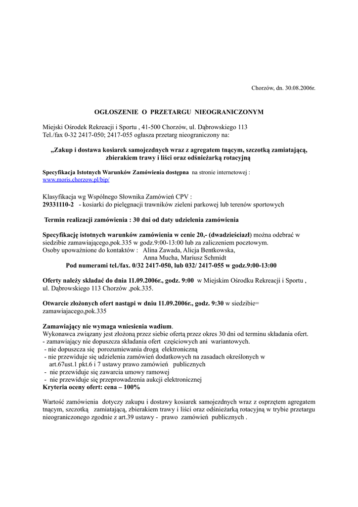 Chorzów, dn. 30.08.2006r. OGŁOSZENIE O PRZETARGU NIEOGRANICZONYM Miejski Ośrodek Rekreacji i Sportu , 41-500 Chorzów, ul. Dąbrowskiego 113 Tel./fax 0-32 2417-050; 2417-055 ogłasza przetarg nieograniczony na: „Zakup i dostawa kosiarek samojezdnych wraz z agregatem tnącym, szczotką zamiatającą, zbierakiem trawy i liści oraz odśnieżarką rotacyjną Specyfikacja Istotnych Warunków Zamówienia dostępna na stronie internetowej : www.moris.chorzow.pl/bip/ Klasyfikacja wg Wspólnego Słownika Zamówień CPV : 29331110-2 - kosiarki do pielęgnacji trawników zieleni parkowej lub terenów sportowych Termin realizacji zamówienia : 30 dni od daty udzielenia zamówienia Specyfikację istotnych warunków zamówienia w cenie 20,- (dwadzieściazł) można odebrać w siedzibie zamawiającego,pok.335 w godz.9:00-13:00 lub za zaliczeniem pocztowym. Osoby upoważnione do kontaktów : Alina Zawada, Alicja Bentkowska, Anna Mucha, Mariusz Schmidt Pod numerami tel./fax. 0/32 2417-050, lub 032/ 2417-055 w godz.9:00-13:00 Oferty należy składać do dnia 11.09.2006r., godz. 9:00 w Miejskim Ośrodku Rekreacji i Sportu , ul. Dąbrowskiego 113 Chorzów ,pok.335. Otwarcie złożonych ofert nastąpi w dniu 11.09.2006r., godz. 9:30 w siedzibie= zamawiajacego,pok.335 Zamawiający nie wymaga wniesienia wadium. Wykonawca związany jest złożoną przez siebie ofertą przez okres 30 dni od terminu składania ofert. - zamawiający nie dopuszcza składania ofert częściowych ani wariantowych. - nie dopuszcza się porozumiewania drogą elektroniczną - nie przewiduje się udzielenia zamówień dodatkowych na zasadach określonych w art.67ust.1 pkt.6 i 7 ustawy prawo zamówień publicznych - nie przewiduje się zawarcia umowy ramowej - nie przewiduje się przeprowadzenia aukcji elektronicznej Kryteria oceny ofert: cena – 100% Wartość zamówienia dotyczy zakupu i dostawy kosiarek samojezdnych wraz z osprzętem agregatem tnącym, szczotką zamiatającą, zbierakiem trawy i liści oraz odśnieżarką rotacyjną w trybie przetargu nieograniczonego zgodnie z art.39 ustawy - prawo zamówień publicznych . Przedmiotem zadania jest zakup i dostawa • Kosiarka samojezdna sztuk 2 wraz z osprzętem: - Agregat tnący - sztuk 2 - Szczotka zamiatająca - sztuk 2 - Zbierak trawy i liści - sztuk 2 - Odśnieżarka rotacyjna - sztuk 2 Charakterystyka i opis przedmiotu zamówienia dostępny w SIWZ na stronie internetowej www.moris.chorzow.pl/bip/ W przetargu mogą wziąć udział wykonawcy ,którzy : - posiadają uprawnienia do wykonywania określonej działalności lub czynności, jeżeli ustawy nakładają obowiązek posiadania takich uprawnień, - posiadają niezbędną wiedzę i doświadczenie oraz dysponują potencjałem technicznym i osobami zdolnymi do wykonania zamówienia, - znajdują się w sytuacji ekonomicznej i finansowej zapewniającej wykonanie zadania, - nie podlegają wykluczeniu z postępowania o udzielenie zamówienia. i którzy złożą: 1. W celu potwierdzenia uprawnień do wykonywania określonej działalności lub czynności oraz, że nie podlega wykluczeniu na podstawie art. 24 ustawy z dn. 29.01.04 prawo –zamówień publicznych Wykonawca składa następujące dokumenty: a) aktualny odpis z właściwego rejestru albo aktualne zaświadczenie o wpisie do ewidencji działalności gospodarczej jeżeli odrębne przepisy wymagają wpisu do rejestru lub zgłoszenia do ewidencji działalności gospodarczej wystawionego nie wcześniej niż 6 miesięcy przed upływem terminu składania ofert. b) aktualne zaświadczenie właściwego Naczelnika Urzędu Skarbowego oraz właściwego oddziału Zakładu Ubezpieczeń Społecznych lub Kasy Rolniczego Ubezpieczenia Społecznego potwierdzających odpowiednio, że Wykonawca nie zalega z opłacaniem podatków, opłat oraz składek na ubezpieczenie zdrowotne i społeczne, lub zaświadczeń, że uzyskał przewidziane prawem zwolnienie, odroczenie lub rozłożenie na raty zaległych płatności, lub wstrzymanie w całości wykonania decyzji właściwego organu. Zaświadczenia wystawione nie wcześniej niż 3 m-ce przed upływem terminu składania ofert. 2. Jeżeli wykonawca ma siedzibę lub miejsce zamieszkania poza terytorium Rzeczypospolitej Polskiej, zamiast dokumentów ,o których mowa w pkt.6.3 ppkt. a,b składa dokument lub dokumenty, wystawione w kraju, w którym ma siedzibę lub miejsce zamieszkania , potwierdzające odpowiednio, że: a) nie otwarto jego likwidacji ani nie ogłoszono upadłości b) nie orzeczono wobec niego zakazu ubiegania się o zamówienie, c) nie zalega z uiszczaniem podatków, opłat lub składek na ubezpieczenie społeczne lub zdrowotne, albo, że uzyskał przewidziane prawem zwolnienie, odroczenie lub rozłożenie na raty zaległych płatności lub wstrzymanie w całości wykonania decyzji właściwego organu. Dokumenty, o których mowa w pkt.6.4 ppkt a),b) SIWZ powinny być wystawione nie wcześniej niż 6 miesięcy przed terminem składania ofert. Dokumenty , o których mowa w pkt.6.4 ppkt c) SIWZ powinny być wystawione nie wcześniej niż 3 miesiące przed upływem terminu składania ofert. 3. Jeżeli w kraju pochodzenia osoby lub w kraju ,w którym wykonawca ma siedzibę lub miejsce zamieszkania, nie wydaje się dokumentów, o których mowa w pkt. 6.4 SIWZ zastępuje się je dokumentem zawierającym oświadczenie złożone przed notariuszem, właściwym organem sądowym, administracyjnym albo organem samorządu zawodowego lub gospodarczego odpowiedniego kraju pochodzenia osoby lub kraju, w którym wykonawca ma siedzibę lub miejsce zamieszkania. Dokumenty , o których mowa wyżej składane winny być w formie oryginału lub kopii poświadczonej za zgodność z oryginałem przez wykonawcę. Zamawiający może żądać przedstawienia oryginału lub notarialnie poświadczonej kopii dokumentu wyłącznie wtedy, gdy złożona przez wykonawcę kopia dokumentu jest nieczytelna lub budzi wątpliwości co do jej prawdziwości. Dokumenty sporz
