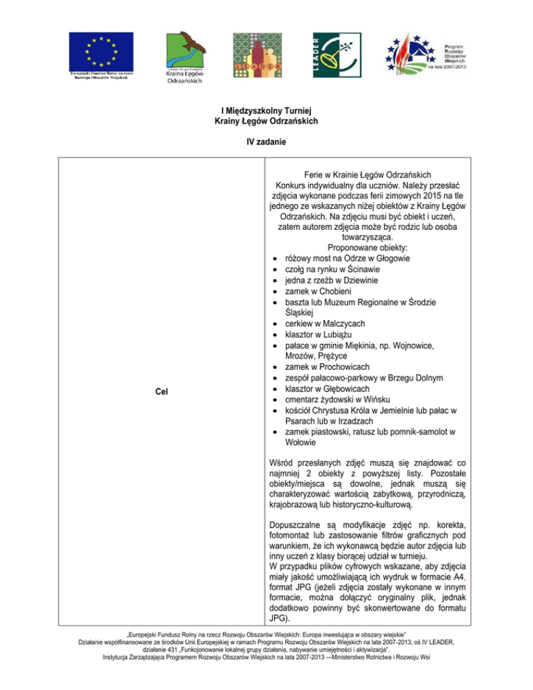 I Międzyszkolny Turniej Krainy Łęgów Odrzańskich IV zadanie Cel Ferie w Krainie Łęgów Odrzańskich Konkurs indywidualny dla uczniów. Należy przesłać zdjęcia wykonane podczas ferii zimowych 2015 na tle jednego ze wskazanych niżej obiektów z Krainy Łęgów Odrzańskich. Na zdjęciu musi być obiekt i uczeń, zatem autorem zdjęcia może być rodzic lub osoba towarzysząca. Proponowane obiekty: różowy most na Odrze w Głogowie czołg na rynku w Ścinawie jedna z rzeźb w Dziewinie zamek w Chobieni baszta lub Muzeum Regionalne w Środzie Śląskiej cerkiew w Malczycach klasztor w Lubiążu pałace w gminie Miękinia, np. Wojnowice, Mrozów, Prężyce zamek w Prochowicach zespół pałacowo-parkowy w Brzegu Dolnym klasztor w Głębowicach cmentarz żydowski w Wińsku kościół Chrystusa Króla w Jemielnie lub pałac w Psarach lub w Irzadzach zamek piastowski, ratusz lub pomnik-samolot w Wołowie Wśród przesłanych zdjęć muszą się znajdować co najmniej 2 obiekty z powyższej listy. Pozostałe obiekty/miejsca są dowolne, jednak muszą się charakteryzować wartością zabytkową, przyrodniczą, krajobrazową lub historyczno-kulturową. Dopuszczalne są modyfikacje zdjęć np. korekta, fotomontaż lub zastosowanie filtrów graficznych pod warunkiem, że ich wykonawcą będzie autor zdjęcia lub inny uczeń z klasy biorącej udział w turnieju. W przypadku plików cyfrowych wskazane, aby zdjęcia miały jakość umożliwiającą ich wydruk w formacie A4, format JPG (jeżeli zdjęcia zostały wykonane w innym formacie, można dołączyć oryginalny plik, jednak dodatkowo powinny być skonwertowane do formatu JPG). „Europejski Fundusz Rolny na rzecz Rozwoju Obszarów Wiejskich: Europa inwestująca w obszary wiejskie” Działanie współfinansowane ze środków Unii Europejskiej w ramach Programu Rozwoju Obszarów Wiejskich na lata 2007-2013, oś IV LEADER, działanie 431 „Funkcjonowanie lokalnej grupy działania, nabywanie umiejętności i aktywizacja”. Instytucja Zarządzająca Programem Rozwoju Obszarów Wiejskich na lata 2007-2013 —Ministerstwo Rolnictwa i Rozwoju Wsi Kryteria oceny Termin wykonania opisano w rubryce „Punkty” 19 stycznia – 1 lutego: wykonanie zdjęć podczas ferii zimowych Termin i sposób przesłania do 10 lutego 2015 roku: przesłanie prac do organizatora pocztą elektroniczną na adres koordynatora turnieju w przypadku zdjęć cyfrowych lub pocztą tradycyjną w przypadku wykonania zdjęć analogowych. Uwaga: w przypadku zdjęć cyfrowych, jeśli ich zsumowany rozmiar przekroczy 10 mb, prosimy o przesłanie zdjęć za pomocą dostępnych narzędzi internetowych np. dysków zewnętrznych (np. w tzw. chmurze) lub aplikacji służących do przesyłania plików typu We transfer (WWW.wetransfer.com) czy www.przeslijmi.pl. Punkty 10 punktów dla każdej szkoły za przesłanie co najmniej 5 zdjęć różnych uczniów z różnych obiektów. Zdjęcia należy podpisać (imię i nazwisko ucznia, data, miejsce). Dodatkowo przyznane zostaną punkty za najciekawsze zdjęcie: I miejsce – 5 pkt II miejsce – 3 pkt III miejsce – 2 pkt Termin oceny i ogłoszenia przyznanych punktów do 02 marca 2015 „Europejski Fundusz Rolny na rzecz Rozwoju Obszarów Wiejskich: Europa inwestująca w obszary wiejskie” Działanie współfinansowane ze środków Unii Europejskiej w ramach Programu Rozwoju Obszarów Wiejskich na lata 2007-2013, oś IV LEADER, działanie 431 „Funkcjonowanie lokalnej grupy działania, nabywanie umiejętności i aktywizacja”. Instytucja Zarządzająca Programem Rozwoju Obszarów Wiejskich na lata 2007-2013 —Ministerstwo Rolnictwa i Rozwoju Wsi
