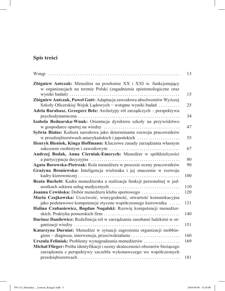 Spis treści Wstęp . . . . . . . . . . . . . . . . . . . . . . . . . . . . . . . . . . . . . . . . . . . . . . . . . . . . . . . . . . . . . . Zbigniew Antczak: Menedżer na przełomie XX i XXI w. funkcjonujący w organizacjach na terenie Polski (zagadnienia epistemologiczne oraz wyniki badań) . . . . . . . . . . . . . . . . . . . . . . . . . . . . . . . . . . . . . . . . . . . . . . . . . . . . Zbigniew Antczak, Paweł Gutt: Adaptacja zawodowa absolwentów Wyższej Szkoły Oficerskiej Wojsk Lądowych − wstępne wyniki badań . . . . . . . . . . Adela Barabasz, Grzegorz Bełz: Archetypy ról zarządczych – perspektywa psychodynamiczna . . . . . . . . . . . . . . . . . . . . . . . . . . . . . . . . . . . . . . . . . . . . . . . . Izabela Bednarska-Wnuk: Orientacja dyrektora szkoły na przywództwo w gospodarce opartej na wiedzy . . . . . . . . . . . . . . . . . . . . . . . . . . . . . . . . . . . . Sylwia Białas: Kultura narodowa jako determinanta rozwoju pracowników w przedsiębiorstwach amerykańskich i japońskich . . . . . . . . . . . . . . . . . . . . Henryk Bieniok, Kinga Hoffmann: Kluczowe zasady zarządzania własnym sukcesem osobistym i zawodowym . . . . . . . . . . . . . . . . . . . . . . . . . . . . . . . . . Andrzej Bodak, Anna Cierniak-Emerych: Menedżer w spółdzielczości a partycypacja decyzyjna . . . . . . . . . . . . . . . . . . . . . . . . . . . . . . . . . . . . . . . . . . Agata Borowska-Pietrzak: Rola menedżera w procesie oceny pracowników Grażyna Broniewska: Inteligencja wieloraka i jej znaczenie w rozwoju kadry kierowniczej . . . . . . . . . . . . . . . . . . . . . . . . . . . . . . . . . . . . . . . . . . . . . . . . Beata Buchelt: Kadra menedżerska a realizacja funkcji personalnej w jednostkach sektora usług medycznych . . . . . . . . . . . . . . . . . . . . . . . . . . . . . . . . . Joanna Cewińska: Dobór menedżera klubu sportowego . . . . . . . . . . . . . . . . . . Maria Czajkowska: Uczciwość, wiarygodność, otwartość komunikacyjna jako podstawowe kompetencje etyczne współczesnego kierownika . . . . . Halina Czubasiewicz, Bogdan Nogalski: Rozwój kompetencji menedżerskich. Praktyka pomorskich firm . . . . . . . . . . . . . . . . . . . . . . . . . . . . . . . . . . . . Dariusz Danilewicz: Redefinicja ról w zarządzaniu zasobami ludzkimi w organizacji wiedzy . . . . . . . . . . . . . . . . . . . . . . . . . . . . . . . . . . . . . . . . . . . . . . . . . . Katarzyna Durniat: Menedżer w sytuacji zagrożenia organizacji mobbingiem − diagnoza, interwencja, przeciwdziałanie . . . . . . . . . . . . . . . . . . . . . . . Urszula Feliniak: Problemy wynagradzania menedżerów . . . . . . . . . . . . . . . . . Michał Flieger: Próba identyfikacji i oceny skuteczności obszarów bieżącego zarządzania z perspektywy szczebla wykonawczego we współczesnych przedsiębiorstwach . . . . . . . . . . . . . . . . . . . . . . . . . . . . . . . . . . . . . . . . . . . . . . . . PN-115_Menedżer..._Listwan_Księga1.indb 5 13 15 25 34 47 55 67 80 90 100 110 120 131 140 151 160 169 181 2010-09-08 13:36:00 6 Spis treści Agnieszka Fornalczyk: Coaching w ujęciu systemowym i procesowym . . . . Ewa Głuszek: Kształtowanie wizerunku przedsiębiorstwa jako nowy obszar odpowiedzialności menedżerskiej . . . . . . . . . . . . . . . . . . . . . . . . . . . . . . . . . . . Łukasz Haromszeki: Przywództwo w nowoczesnej organizacji non profit na przykładzie Dolnośląskiej Organizacji Turystycznej we Wrocławiu . . . . . Beata Jamka: Podmiotowe a atrybutowe zarządzanie talentami podwładnych Henryk Jarosiewicz: Intuicyjna orientacja menedżera: dostęp do wiedzy ukrytej . . . . . . . . . . . . . . . . . . . . . . . . . . . . . . . . . . . . . . . . . . . . . . . . . . . . . . . . . . Jolanta Jasińska: Rola kierownictwa w systemie społecznej odpowiedzialności . . . . . . . . . . . . . . . . . . . . . . . . . . . . . . . . . . . . . . . . . . . . . . . . . . . . . . . . . . . . Marta Juchnowicz: Ewolucja zarządzania w sferze ludzkiej − od ZZL do ZKL Marek Kalinowski, Joanna Litwin: Kompetencje menedżerskie jako czynnik rozwoju sektora MSP . . . . . . . . . . . . . . . . . . . . . . . . . . . . . . . . . . . . . . . . . . Tomasz Kawka: HR Bussiness Partner – nowa rola menedżerska funkcji personalnej . . . . . . . . . . . . . . . . . . . . . . . . . . . . . . . . . . . . . . . . . . . . . . . . . . . . . . . . . Alicja Keplinger: Potoczna wiedza na temat zachowań produktywnych i nieproduktywnych w biznesie . . . . . . . . . . . . . . . . . . . . . . . . . . . . . . . . . . . . . . . . . Krystyna Kmiotek: Uwarunkowania systemu motywowania w przedsiębiorstwie . . . . . . . . . . . . . . . . . . . . . . . . . . . . . . . . . . . . . . . . . . . . . . . . . . . . . . . . . . . . Agnieszka Kołodziejczyk: Umiejętności menedżera w strukturach wirtualno-sieciowych (w świetle badań sondażowych) . . . . . . . . . . . . . . . . . . . . . . . Jacek Kopeć: Rola topmenedżerów w zarządzaniu talentami . . . . . . . . . . . . . . Maria Wanda Kopertyńska: Motywacyjne oddziaływanie menedżera w warunkach kryzysu gospodarczego . . . . . . . . . . . . . . . . . . . . . . . . . . . . . . . . . . . . Elżbieta Kowalczyk: Czynniki wpływające na negocjacje w sprawie pracy w opinii pracodawców . . . . . . . . . . . . . . . . . . . . . . . . . . . . . . . . . . . . . . . . . . . . Barbara Kożuch: Kompetencje menedżerów w organizacjach publicznych: teoria a praktyka zarządzania . . . . . . . . . . . . . . . . . . . . . . . . . . . . . . . . . . . . . . . Barbara Kożusznik: Psychologiczne bariery efektywnego zarządzania innowacjami . . . . . . . . . . . . . . . . . . . . . . . . . . . . . . . . . . . . . . . . . . . . . . . . . . . . . . . . . Rafał Krupski: Horyzont planowania strategicznego w zakresie kształtowania wiedzy na tle innych zasobów niematerialnych w przedsiębiorstwach i firmach usług publicznych . . . . . . . . . . . . . . . . . . . . . 