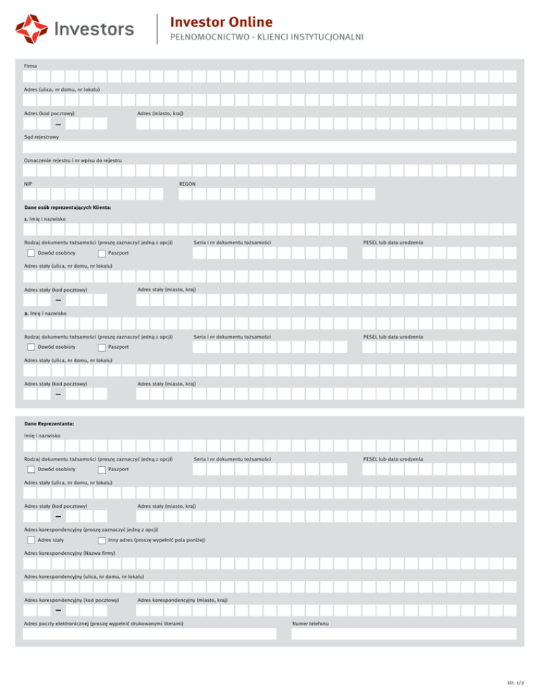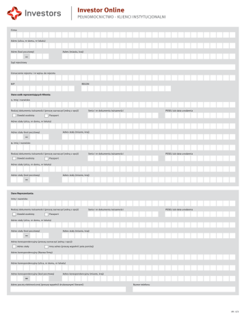 Investor Online PEŁNOMOCNICTWO - KLIENCI INSTYTUCJONALNI Firma Adres (ulica, nr domu, nr lokalu) Adres (kod pocztowy) Adres (miasto, kraj) Sąd rejestrowy Oznaczenie rejestru i nr wpisu do rejestru NIP REGON Dane osób reprezentujących Klienta: 1. Imię i nazwisko Rodzaj dokumentu tożsamości (proszę zaznaczyć jedną z opcji) Dowód osobisty PESEL lub data urodzenia Seria i nr dokumentu tożsamości Paszport Adres stały (ulica, nr domu, nr lokalu) Adres stały (miasto, kraj) Adres stały (kod pocztowy) 2. Imię i nazwisko Rodzaj dokumentu tożsamości (proszę zaznaczyć jedną z opcji) Dowód osobisty PESEL lub data urodzenia Seria i nr dokumentu tożsamości Paszport Adres stały (ulica, nr domu, nr lokalu) Adres stały (miasto, kraj) Adres stały (kod pocztowy) Dane Reprezentanta: Imię i nazwisko Rodzaj dokumentu tożsamości (proszę zaznaczyć jedną z opcji) Dowód osobisty PESEL lub data urodzenia Seria i nr dokumentu tożsamości Paszport Adres stały (ulica, nr domu, nr lokalu) Adres stały (miasto, kraj) Adres stały (kod pocztowy) Adres korespondencyjny (proszę zaznaczyć jedną z opcji) Adres stały Inny adres (proszę wypełnić pola poniżej) Adres korespondencyjny (Nazwa firmy) Adres korespondencyjny (ulica, nr domu, nr lokalu) Adres korespondencyjny (kod pocztowy) Adres korespondencyjny (miasto, kraj) Adres poczty elektronicznej (proszę wypełnić drukowanymi literami) Numer telefonu str. 1/2 My, niżej podpisani, działając w imieniu i na rzecz Klienta niniejszym upoważniamy wskazanego powyżej Reprezentanta do korzystania w imieniu i na rzecz Klienta z systemu Investor Online, w szczególności do składania za pośrednictwem Investor Online Zleceń i Dyspozycji wobec funduszy inwestycyjnych zarządzanych przez Investors TFI S.A. zgodnie z Regulaminem korzystania z Investor Online. Reprezentant działa jednoosobowo. Pełnomocnictwo zostało udzielone na czas nieokreślony i może zostać w każdej chwili odwołane. Pojęcia niezdefiniowane w niniejszym pełnomocnictwie pisane z wielkiej litery mają znaczenie nadane im w Regulaminie korzystania z Investor Online. 1. Klient loguje się do systemu transakcyjnego Investor Online wskazując identyfikator (login), taki jak adres e-mail wskazany w danych osobowych oraz hasło ustanowione w procesie aktywacji Umowy Investor Online. 2. Zlecenia i Dyspozycje dotyczące uczestnictwa w Funduszach składane za pośrednictwem elektronicznego systemu transakcyjnego Investor Online (wskazane szczegółowo w Regulaminie) i prawidłowo autoryzowane są ważne także w przypadkach, gdy Statuty Funduszy przewidują dla tych Zleceń i Dyspozycji wymóg zachowania formy pisemnej. 3. Autoryzacja Zleceń i Dyspozycji złożonych za pośrednictwem elektronicznego systemu transakcyjnego Investor Online będzie odbywać się poprzez kody SMS wysyłane przez Towarzystwo na numer telefonu wskazany w danych osobowych. Za Klienta: Za Towarzystwo: 1. Podpis osoby reprezentującej Klienta Podpis i pieczęć imienna Dealera 2. Podpis osoby reprezentującej Klienta Pieczęć Dystrybutora Miejscowość Data podpisania Umowy str. 2/2