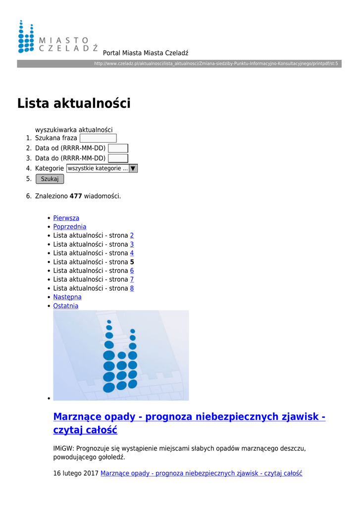 Portal Miasta Miasta Czeladź http://www.czeladz.pl/aktualnosci/lista_aktualnosci/Zmiana-siedziby-Punktu-Informacyjno-Konsultacyjnego/printpdf/st:5 Lista aktualności wyszukiwarka aktualności 1. Szukana fraza 2. Data od (RRRR-MM-DD) 3. Data do (RRRR-MM-DD) 4. Kategorie wszystkie kategorie ... ▼ 5. Szukaj 6. Znaleziono 477 wiadomości. Pierwsza Poprzednia Lista aktualności - strona 2 Lista aktualności - strona 3 Lista aktualności - strona 4 Lista aktualności - strona 5 Lista aktualności - strona 6 Lista aktualności - strona 7 Lista aktualności - strona 8 Następna Ostatnia Marznące opady - prognoza niebezpiecznych zjawisk czytaj całość IMiGW: Prognozuje się wystąpienie miejscami słabych opadów marznącego deszczu, powodującego gołoledź. 16 lutego 2017 Marznące opady - prognoza niebezpiecznych zjawisk - czytaj całość "Muzyczna randka z Jackiem Kawalcem" w Kopalni Kultury - czytaj całość Wyjątkowo romantyczny nastrój zagościł w Kopalni Kultury. Wszystko za sprawą Walentynek, dzięki którym sceną zawładnęła miłość w niemal wszystkich odcieniach czerwieni. 16 lutego 2017 "Muzyczna randka z Jackiem Kawalcem" w Kopalni Kultury - czytaj całość Jak się żyje w Czeladzi? - czytaj całość 22 lutego 2017 roku o godzinie 16.30 w Kopalni Kultury przy ul. Trznadla 1 odbędzie się spotkanie pod hasłem: „Jak się żyje w Czeladzi?”. 15 lutego 2017 Jak się żyje w Czeladzi? - czytaj całość Uwaga smog! - czytaj całość Jak podaje Wojewódzki Inspektorat Ochrony Środowiska w Katowicach w środę 15 lutego i czwartek 16 lutego jakość powietrza w województwie śląskim będzie bardzo zła. 15 lutego 2017 Uwaga smog! - czytaj całość Powiadomienie o jakości powietrza w województwie śląskim - czytaj całość Powiadomienie o jakości powietrza w województwie śląskim w dniach 14-16.02.2017 r. 15 lutego 2017 Powiadomienie o jakości powietrza w województwie śląskim - czytaj całość Bilety są jeszcze dostępne! - czytaj całość Muzyczne Randka z Jackiem Kawalcem to dobry pomysł na walentynkowy wieczór. Kopalnia Kultury dysponuje jeszcze biletami na to wydarzenie. 14 lutego 2017 Bilety są jeszcze dostępne! - czytaj całość Powiadomienie o jakości powietrza w województwie śląskim - czytaj całość Wojewódzki Inspektorat Ochrony Środowiska w Katowicach informuje o jakości powietrza w województwie śląskim w dniach 13-15.02.2017 r. 14 lutego 2017 Powiadomienie o jakości powietrza w województwie śląskim - czytaj całość Każde dziecko - duże, małe - lubi bale w karnawale! czytaj całość W niedzielne przedpołudnie, 12 lutego w Muzeum Saturn odbyło się pierwsze w tym roku i długo oczekiwane spotkanie sympatyków Muzealnego Klubu Juniora. 14 lutego 2017 Każde dziecko - duże, małe - lubi bale w karnawale! - czytaj całość Powiadomienie o jakości powietrza w województwie śląskim - czytaj całość Wojewódzki Inspektorat Ochrony Środowiska w Katowicach informuje o jakości powietrza w województwie śląskim w dniach 12-14.02.2017 r. 14 lutego 2017 Powiadomienie o jakości powietrza w województwie śląskim - czytaj całość Jak chronić się przed ptasią grypą - czytaj całość Zachęcamy do zapoznanie się z broszurami informacyjnymi, które przedstawiają najważniejsze zasady ochrony przed ptasią grypą. 13 lutego 2017 Jak chronić się przed ptasią grypą - czytaj całość Pierwsza Poprzednia Lista aktualności - strona 2 Lista aktualności - strona 3 Lista aktualności - strona 4 Lista aktualności - strona 5 Lista aktualności - strona 6 Lista aktualności - strona 7 Lista aktualności - strona 8 Następna Ostatnia