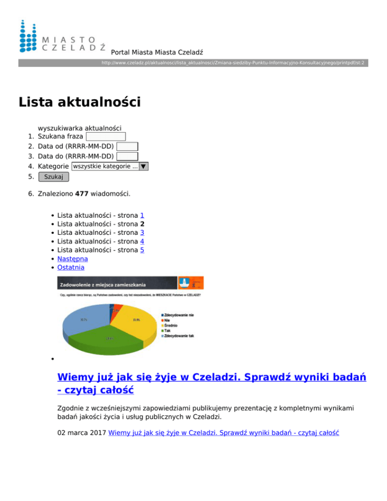 Portal Miasta Miasta Czeladź http://www.czeladz.pl/aktualnosci/lista_aktualnosci/Zmiana-siedziby-Punktu-Informacyjno-Konsultacyjnego/printpdf/st:2 Lista aktualności wyszukiwarka aktualności 1. Szukana fraza 2. Data od (RRRR-MM-DD) 3. Data do (RRRR-MM-DD) 4. Kategorie wszystkie kategorie ... ▼ 5. Szukaj 6. Znaleziono 477 wiadomości. Lista aktualności - strona 1 Lista aktualności - strona 2 Lista aktualności - strona 3 Lista aktualności - strona 4 Lista aktualności - strona 5 Następna Ostatnia Wiemy już jak się żyje w Czeladzi. Sprawdź wyniki badań - czytaj całość Zgodnie z wcześniejszymi zapowiedziami publikujemy prezentację z kompletnymi wynikami badań jakości życia i usług publicznych w Czeladzi. 02 marca 2017 Wiemy już jak się żyje w Czeladzi. Sprawdź wyniki badań - czytaj całość Klub (nie)zwykłej mamy - czytaj całość Chyba każdą mamę dopada myśl, że czuje się choć odrobinę samotna w tym dziecięcym świecie. Czy jest recepta na urozmaicenie szarej rzeczywistości? 01 marca 2017 Klub (nie)zwykłej mamy - czytaj całość Prognoza niebezpiecznych zjawisk meteorologicznych czytaj całość IMGW prognozuje wystąpienie wiatru o średniej prędkości od 30 km/h do 50 km/h, w porywach do 80 km/h, południowego zachodu . 01 marca 2017 Prognoza niebezpiecznych zjawisk meteorologicznych - czytaj całość Budżet Obywatelski 2017 w liczbach - czytaj całość Głosowanie w ramach trzeciej edycji Budżetu Obywatelskiego 2017 wzbudziło znacznie większe zainteresowanie wśród mieszkańców miasta, niż w poprzednich latach. Jakie wnioski można wysnuć analizując statystyki głosowania? 27 lutego 2017 Budżet Obywatelski 2017 w liczbach - czytaj całość Przemek Corso - czeladzianin, którego poleca Wojciech Cejrowski - czytaj całość W czwartek, 2 marca, o godz. 17.00 zapraszamy na spotkanie z Przemkiem Corso, którego cykl o archeologu i awanturniku Robercie Karczu do tego stopnia wciągnął Wojciecha Cejrowskiego, że został jego wydawcą. 27 lutego 2017 Przemek Corso - czeladzianin, którego poleca Wojciech Cejrowski - czytaj całość Burmistrz i radni spotkają się z mieszkańcami - czytaj całość Przed nami seria spotkań burmistrza i radnych z mieszkańcami, których motywem przewodnim będzie pytanie "Jak się żyje w Czeladzi?" 27 lutego 2017 Burmistrz i radni spotkają się z mieszkańcami - czytaj całość Ceramika Marity Benke-Gajdy w GSW Elektrownia czytaj całość Życie, codzienność, sztuka, natchnienie, podróż po zakamarkach duszy i umysłu - to niektóre z zagadnień, przybierających formę ceramicznych brył w ekspozycji "Ciągle w drodze". 24 lutego 2017 Ceramika Marity Benke-Gajdy w GSW Elektrownia - czytaj całość Powiadomienie o jakości powietrza w województwie śląskim - czytaj całość Wojewódzki Inspektorat Ochrony Środowiska w Katowicach informuje o jakości powietrza w województwie śląskim w dniach 23-26.02.2017 r. 24 lutego 2017 Powiadomienie o jakości powietrza w województwie śląskim - czytaj całość Pamięci "Żołnierzy Wyklętych" - czytaj całość W najbliższą środę, 1 marca obchodzimy Narodowy Dzień Pamięci "Żołnierzy Wyklętych". W południe w kościele św. Stanisława B.M. nastąpi odsłonięcie tablicy, poświęconej bohaterom antykomunistycznego i niepodległościowego podziemia. 24 lutego 2017 Pamięci "Żołnierzy Wyklętych" - czytaj całość Prognoza niebezpiecznych zjawisk meteorologicznych silny wiatr, oblodzenie - czytaj całość Prognoza niebezpiecznych zjawisk meteorologicznych - silny wiatr i oblodzenie. 24 lutego 2017 Prognoza niebezpiecznych zjawisk meteorologicznych - silny wiatr, oblodzenie czytaj całość Lista aktualności - strona 1 Lista aktualności - strona 2 Lista aktualności - strona 3 Lista aktualności - strona 4 Lista aktualności - strona 5 Następna Ostatnia