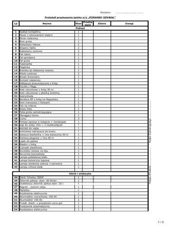 Szczecin ….............................. Protokół przekazania jachtu s/y „PORANNY SZKWAŁ” Lp Nazwa Stan Przeka zano Zdano Uwagi Kadłub kompletny Maszt z olinowaniem stałym Ekran radarowy Bom grota Kabestany fałowe Stopery fałów Kabestany szotowe Fał rolera Fał spinakera Fał grota Topenanta Flaglinka Bramka do kładzenia masztu Wózki szotowe Bosak drewniany Rumpel zapasowy Odbijacze pneumatyczne z linką Tyczka z flagą Koło ratunkowe z linką 30 m. Koło ratunkowe z pławką świetlną Szprycbuda Bandera RP z linką na flagsztoku Grot marszowy z listwami Fok na rolerze Szoty foka Talia grota samoknagująca Obciągacz bomu Cumy Pompa zęzowa w kokpicie + handszpak wąż do wody 15m + 2 szybkozłączki pistolet do węża końcówka nakręcana do kranu 1 1 1 1 2 2 2 1 1 1 1 1 1 2 1 1 5 1 1 1 1 1 1 1 1 1 1 3 1 1 1 1 Kotwica Danfortha + lina kotwiczna 30 m Kotwica pługowa + lina 40 m Lejek do paliwa Wiadro z linką Czerpak plastikowy Szczotka ryżowa na kiju Skrzynka bosmańska Lampa pokładowa biała Lampa kotwiczna topowa Lampa dziobowa zielona +czerwona Lampa rufowa biała 1 1 1 1 1 1 1 1 1 1 1 Silnik i elektryka 44 45 46 47 48 49 50 51 52 53 54 Silnik Tohatsu 30KM Zbiornik paliwa- stan: 40 litrów Dodatkowy zbiornik paliwa stan: 25 l. 1 1 1 Bagnet - poziom oleju Manetka Rozdzielnia elektryczna Akumulator rozruchowy 100 Ah Akumulator 100 Ah Przedł. elektr. z przejściem euro-pol Prostownik automatyczny Rozdzielacz elektryczny 1 1 1 1 2 1 1 1 Podpis Armatora ...................... 1 2 3 4 5 6 7 8 9 10 11 12 13 14 15 16 17 18 19 20 21 22 23 24 25 26 27 28 29 30 31 32 33 34 35 36 37 38 39 40 41 42 43 Podpis Czarterującego ...................... Pokład 1/3 Środki ratunkowe, sygnalizacyjne i p-poz. 55 56 57 58 59 60 61 62 63 64 65 66 67 Kapok + lampka + bateria Szelki asekuracyjne + wąsy + karabińczyki Sygnał dymny Rakiety spadochronowe Rożek mgłowy Stożek czarny plastikowy Kula czarna plastilowa Apteczka Gaśnica proszkowa 2 kg Koc gaśniczy Toporek Latarka korba kabestanu Lewmar pływająca 10 10 1 6 1 1 1 1 1 1 1 1 2 72 73 74 75 76 77 78 79 80 81 82 83 84 85 86 87 88 89 90 91 Radioodtwarzacz CD Kompas sterowy Plastimo Stoper Q&Q Lornetka kompas namiarowy 1 1 0 Trójkąt nawigacyjny Cyrkiel nawigacyjny Linijka 30 cm Banderki państw bałtyckich Pakiet map niemieckich nr 4 Locja Bałtyku Spis świateł Admiralicji tom C Przepisy portowe Podręcznik MPDM Znaki i skróty…. 551 Dokumenty jachtu Dziennik jachtowy Klucze do jachtu klucze do silnika wiatromierz z wyświetlaczem w kabinie 2 1 1 2 1 1 1 1 1 1 1 1 2 1 1 Komplet materacy Komplet gretingów w kabinie Sztorcklapa Pompa zęzowa w messie Toaleta Morska zaburtowa miska plastikowa kwadratowa TV LCD 17” z DVD+DVBT pilot do TV Stół kokpitowy + noga 1 1 1 1 1 1 1 1 1 Barometr + termometr 1 1 Kabina 92 93 94 95 96 97 98 99 100 101 D/DK 2012 Wydanie 2008/2009 KB/CJ/zezwolenie radiowe Podpis Armatora ...................... 1 1 1 1 Podpis Czarterującego ...................... Wyposażenie nawigacyjne 68 Garmin 520S + instrukcja PL 69 Mapa elektroniczna 70 UKF-ka stacjonarna NAVMAN 71 Autopilot Raymarine ST6002 2/3 Kambuz 102 103 104 105 106 107 108 109 110 111 112 113 114 115 116 117 118 119 120 121 122 Kuchenka dwupalnikowa Lodówka 230V/gaz Butla gazowa 3 kg komplet zmiotka+szufelka Komplet garnków nierdzewnych Czajnik Patelnia duża Deska do krojenia Durszlak nierdzewny Kubki termiczne z przykrywkami Talerze płaskie Talerze głębokie Nóż kuchenny Łopatka do patelni korkociąg Otwieracz do konserw miska nierdzewna do sałatki + 2 łyżki Noże stołowe Widelce Łyżki stołowe Łyżeczki 1 1 2 1 1 1 1 2 1 9 10 10 2 2 1 1 1 10 10 10 10 3 garnki z 2 przykrywkami +1 ceramiczny W dniu dzisiejszym, zgodnie z umową czarterową nr...............z dnia ........................ r. Armator przekazał Czarterującemu jacht wg zamieszczonego powyżej wykazu. Kaucja w wysokości 2000 zł została przekazana Armatorowi. CZARTERUJĄCY: PATENTY: ARMATOR: PODPIS 1 2 Dnia ........................... 2014 r., zgodnie z umową czarterową j.w. Czarterujący przekazał Armatorowi jacht wg zamieszczonego powyżej wykazu. Kaucja w wysokości 2000 zł pomniejszona o ........................... zł została zwrócona Czarterującemu. Dokonano następujących odliczeń z kwoty kaucji: ............................................................................. ............ PLN ............................................................................. ............ PLN ............................................................................. ............ PLN ............................................................................. ............ PLN ............................................................................. ............ PLN Łącznie: CZARTERUJĄCY: ............ PLN ARMATOR: 3/3