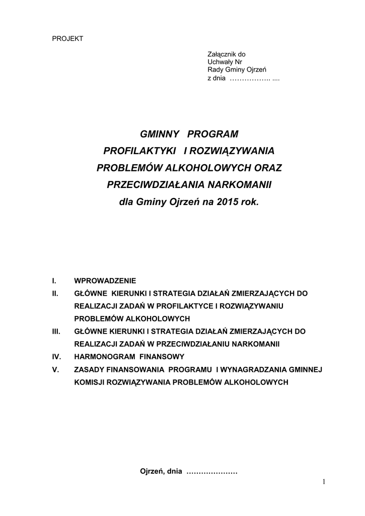 PROJEKT Załącznik do Uchwały Nr Rady Gminy Ojrzeń z dnia …………….. .... GMINNY PROGRAM PROFILAKTYKI I ROZWIĄZYWANIA PROBLEMÓW ALKOHOLOWYCH ORAZ PRZECIWDZIAŁANIA NARKOMANII dla Gminy Ojrzeń na 2015 rok. I. WPROWADZENIE II. GŁÓWNE KIERUNKI I STRATEGIA DZIAŁAŃ ZMIERZAJĄCYCH DO REALIZACJI ZADAŃ W PROFILAKTYCE I ROZWIĄZYWANIU PROBLEMÓW ALKOHOLOWYCH III. GŁÓWNE KIERUNKI I STRATEGIA DZIAŁAŃ ZMIERZAJĄCYCH DO REALIZACJI ZADAŃ W PRZECIWDZIAŁANIU NARKOMANII IV. HARMONOGRAM FINANSOWY V. ZASADY FINANSOWANIA PROGRAMU I WYNAGRADZANIA GMINNEJ KOMISJI ROZWIĄZYWANIA PROBLEMÓW ALKOHOLOWYCH Ojrzeń, dnia ………………… 1 Wprowadzenie Gminny Program Profilaktyki i Rozwiązywania Problemów Alkoholowych oraz Przeciwdziałania Narkomanii dla Gminy Ojrzeń na 2015 roku jest kontynuacją działań realizowanych w tym zakresie od kilku lat na terenie Gminy Ojrzeń. Różnorodność zadań Gminnego Programu Profilaktyki i Rozwiązywania Problemów Alkoholowych oraz Przeciwdziałania Narkomanii dla Gminy Ojrzeń na 2015 rok wynika ze specyfikacji problemu jakim jest uzależnienie, jego wielopłaszczyznowych skutków sięgających wielu osób i instytucji a także potrzeb mieszkańców naszej gminy, w szczególności osób młodych Problemy wynikające z picia alkoholu, używania narkotyków oraz przemocy w rodzinie są w dalszy ciągu najpoważniejszymi kwestiami społecznymi. Zjawiska te mają przemożny wpływ na bezpieczeństwo społeczne, stan zdrowia ludzi jak też relacje z najbliższymi. Z problemem alkoholizmu wiążą się zagrożenia dla prawidłowego funkcjonowania zarówno sfery ekonomicznej i zdrowotnej społeczeństwa. Obecnie nie zastanawiamy się już, czy warto pomagać, osobo, rodzinom z problemem alkoholowym a szczególnie dzieciom z rodzin dotkniętych choroba alkoholową , ale jak to robić szybciej, skuteczniej , efektywniej. Pomagać to znaczy minimalizować skutki alkoholizmu, narkomanii, nikotynizmu, ale pomagać to przede wszystkim zapobiegać , czyli edukować , uświadamiać, wskazywać alternatywne sposoby spędzania wolnego czasu, radzenia sobie z sytuacją trudną, konfliktową, jak skutecznie bez używek rozładować napięcie i rodzącą się agresję. Pomagać to również wspierać młodych ludzi w kształtowaniu prawidłowych postaw osobowościowych , aby nie było potrzebne ,,podpieranie się’’ substancjami uzależniającymi. Skutki uzależnień nie ograniczają się jedynie do ograniczeń fizycznych czy psychicznej degradacji samego alkoholika , one dotykają wszystkich osób, które żyją, pracują czy przyjaźnią się z uzależnionym. Z raportu WHO, opublikowanego w 2011 roku wynika , że Polska znajduję się wśród państw o najwyższym spożyciu czystego alkoholu na dorosłego mieszkańca. Podczas gdy średnia światowa wynosi 6,13 litra/dorosłą osobę, w Polsce wypija się 13,3 l. Badania wykazały również, że nasz kraj jest jednym z nielicznych państw. Należy też zwrócić uwagę na fakt, że rośnie spożycie napojów wysokoprocentowych – wynosi ono 66%, na poziomie 20% spożycia utrzymuje się piwo, a wino stanowi 14% kupowanego alkoholu. 2 Podstawę działań prawną związanych z rozwiązywaniem problemów alkoholowych i narkomanii stanowią: Ustawa z dnia 26 października 1982 r o wychowaniu w trzeźwości i przeciwdziałaniu alkoholizmowi / Dz .U z 2012 r. poz.1356 z późn. zm /, Ustawa z dnia 29 lipca 2005 r. o przeciwdziałaniu narkomanii / Dz.U. z 2012 r. ,poz. 124 z późn. zm./ oraz założenia krajowego Programu Przeciwdziałania Narkomanii; Ustawa o przeciwdziałaniu przemocy w rodzinie z dnia 29 lipca 2005 r /Dz.U. z 2005r. ,Nr 180 poz.1493 ze zm./. Ustawa z dnia 12 marca 2004 roku o pomocy socjalnej /Dz.U. z 2013r. poz. 182 z późn. zm./ Zgodnie z treścią tych Ustaw formą planowania, organizowania i finansowania działań związanych z rozwiązywaniem problemów alkoholowych i przeciwdziałaniu narkomanii w Gminie jest Program Profilaktyki i Rozwiązywania Problemów Alkoholowych i Przeciwdziałaniu Narkomanii. Podstawowym Problemów na 2015 celem Gminnego Programu Profilaktyki i Rozwiązywania Alkoholowych i Przeciwdziałaniu Narkomanii dla Gminy Ojrzeń rok jest zapobieganie powstaniu nowych problemów alkoholowych, zmniejszenie rozmiarów tych, które aktualnie występują oraz zwiększenie zasobów niezbędnych do radzenia sobie z już istniejącymi problemami. Realizacji tych celów mają służyć działania, które zgodnie z Ustawą należą do zadań samorządu terytorialnego: Art. 41 ust.1 Prowadzenie działań związanych z profilaktyką i rozwiązywaniem problemów alkoholowych oraz integracji społecznej osób uzależnionych od alkoholu należy do zadań własnych gmin. W szczególności zadania te obejmują: 1. Zwiększenie dostępności pomocy terapeutycznej i rehabilitacyjnej dla osób uzależnionych od alkoholu. 2. Udzielanie rodzinom, w których występują psychospołecznej problemy alkoholowych, pomocy i prawnej, a w szczególności ochrony przed przemocą w rodzinie. 3 3. Prowadzenie profilaktycznej działalności informacyjnej i edukacyjnej, a w szczególności dla dzieci i młodzieży. 4. Wspomaganie działalności instytucji, stowarzyszeń i osób fizycznych, służącej rozwiązywaniu problemów alkoholowych. 5. Podejmowanie interwencji , w związku z naruszeniem przepisów określonych w art.13,1 i 15 ustawy o występowaniu przed sądem o charakterze oskarżyciela publicznego. 6. Wspieranie zatrudnienia socjalnego poprzez organizowanie i finansowanie centrów integracji społecznej. Zgodnie z art.10.1 Ustawy z dnia 29 lipca 2005 r. o przeciwdziałaniu narkomanii do zadań własnych gminy należy: 1. zwiększanie dostępności pomocy terapeutycznej i rehabilitacyjnej dla osób uzależnionych i osób zagrożonych uzależnieniem, 2. udzielanie rodzinom, w których występują problemy narkomanii pomocy psychospołecznej i prawnej, 3. prowadzenie profilaktycznej działalnoś