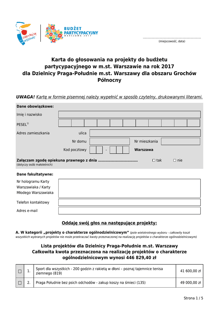 ..................................................................... (miejscowość, data) Karta do głosowania na projekty do budżetu partycypacyjnego w m.st. Warszawie na rok 2017 dla Dzielnicy Praga-Południe m.st. Warszawy dla obszaru Grochów Północny UWAGA! Kartę w formie pisemnej należy wypełnić w sposób czytelny, drukowanymi literami. Dane obowiązkowe: Imię i nazwisko PESEL1) Adres zamieszkania ulica Nr domu Kod pocztowy Nr mieszkania - Warszawa Załączam zgodę opiekuna prawnego z dnia ……………………………… tak nie (dotyczy osób małoletnich) Dane fakultatywne: Nr hologramu Karty Warszawiaka / Karty Młodego Warszawiaka Telefon kontaktowy Adres e-mail Oddaję swój głos na następujące projekty: A. W kategorii „projekty o charakterze ogólnodzielnicowym” (pole wielokrotnego wyboru - całkowity koszt wszystkich wybranych projektów nie może przekraczać kwoty przeznaczonej na realizację projektów o charakterze ogólnodzielnicowym) Lista projektów dla Dzielnicy Praga-Południe m.st. Warszawy Całkowita kwota przeznaczona na realizację projektów o charakterze ogólnodzielnicowym wynosi 446 829,40 zł □ 1. Sport dla wszystkich - 200 godzin z rakietą w dłoni – poznaj tajemnice tenisa ziemnego (819) 41 600,00 zł □ 2. Praga Południe bez psich odchodów - zakup koszy na śmieci (135) 49 000,00 zł Strona 1 / 5 □ 3. Biblioteka dla seniora - mówiące i powiększone książki (1389) 96 270,00 zł □ 4. Klub dla rodzin "Zwalcz Nudę", miejsce przyjazne rodzinie na Pradze - Południe (1007) 52 000,00 zł □ 5. Wspieraj swoje dziecko! Ocenianie kształtujące dla rodziców! - Praga Południe (1576) 17 100,00 zł □ 6. Ochrona drzew Parku Skaryszewskiego (2274) □ 7. Wypożyczalnia Zbiorów Obcojęzycznych (WZO) - zakup filmów i audiobooków (497) □ 8. Arystoteles z Grochowa (918) □ 9. Widniej na Pradze Płd. - 11 latarni LED (1048) 77 000,00 zł □ 10. Nieodpłatne warsztaty naukowe uniwersytetu dziecięcego w Centrum Promocji Kultury w Dzielnicy Praga Południe (806) 23 000,00 zł □ 11. Droga dojazdowa do budynków przy ul. Białowieskiej 19, Białowieskiej 17, Budrysów 26 oraz chodnik (2238) □ 12. Ziemiański szlak wokół Warszawy - dwory i pałace Mazowsza (750) 24 000,00 zł □ 13. Galeria bez granic (2273) 51 950,00 zł □ 14. Unowocześnienie sprzętu komputerowego, z którego korzystają czytelnicy w pracowni komputerowej Biblioteki Publicznej im. Z. Rumla (670) 47 757,00 zł □ 15. ROD Waszyngtona - oświetlenie solarne w alejkach (793) □ 16. Audiobooki do Biblioteki Książki Mówionej na ul. Meissnera 5 (61) □ 17. Komputery w Bibliotece - doposażenie stanowisk komputerowych w Wypożyczalni dla Dorosłych i Młodzieży nr 78 (235) 37 336,00 zł □ 18. Wzbogacenie księgozbioru Wypożyczalni dla Dorosłych i Młodzieży nr 78 (234) 24 000,00 zł □ 19. Edukacja w dziedzinie alternatywnych metod rozwiązywania sporów (mediacja) (2605) 27 720,00 zł □ 20. Wypożyczalnia Zbiorów Obcojęzycznych (WZO) - zakup nowych regałów do działu z literaturą popularnonaukową (488) 30 000,00 zł □ 21. Narysowana Warszawa - Praga Południe (701) 33 413,00 zł □ 22. Bezpieczeństwo dzieci w drodze do szkoły SP312, w jej otoczeniu i na przyszkolnych boiskach. (688) 250 000,00 zł □ 23. Praskie Centrum Aktywnej Młodzieży (2020) 195 310,00 zł □ 24. Aktywne parki: Leśnika, Znicza, OPAK, Balaton, Polińskiego (1493) 167 500,00 zł □ 25. Uporządkowanie Skweru na Saskiej Kępie wzdłuż ul. Lotaryńskiej (926) 192 600,00 zł 117 000,00 zł 40 000,00 zł 117 328,00 zł 260 000,00 zł 297 000,00 zł 4 000,00 zł Strona 2 / 5 □ 26. Od gimnazjalisty do programisty - poznajemy Scratch'a i Arduino (1298) 46 200,00 zł □ 27. Wypożyczalnia Zbiorów Obcojęzycznych (WZO) - zakup książek i materiałów dydaktycznych do nauki języków obcych (495) 50 000,00 zł □ 28. Wypożyczalnia Zbiorów Obcojęzycznych (WZO) - zakup nowości wydawniczych (487) 15 000,00 zł □ 29. Nie święci garnki lepią. Bezpłatne zajęcia dla mieszkańców Warszawy. (766) 13 456,00 zł □ 30. Przejazd rowerowy przez skrzyżowanie Grenadierów i Alei Stanów Zjednoczonych (1733) □ 31. Praski Świerszcz - gazeta młodych (2071) □ 32. Droga rowerowa na Grochowskiej od Wiatracznej w stronę pl. Szembeka. (927) 280 000,00 zł □ 33. Doświetlenie alejek spacerowych przy Kamionkowskich Błoniach Elekcyjnych (1858) 275 000,00 zł □ 34. Kurs samoobrony dla kobiet na Pradze Południe (2191) □ 35. Domki dla wolno żyjących kotów na Pradze Południe (60) 6 600,00 zł □ 36. Nowoczesne Technologie w Bibliotece - zakup tablicy interaktywnej (489) 4 000,00 zł □ 37. Festyn sportów wodnych i Praski Puchar Kajakowy (1593) 96 000,00 zł □ 38. Artystyczne soboty z gliną. Bezpłatne zajęcia dla mieszkańców Warszawy (762) 22 456,00 zł □ 39. Zajęcia sportowe z kajakarstwa dla osób starszych i niepełnosprawnych. Ogólnodostępna wypożyczalnia kajaków na Kamionku. (1601) 42 720,00 zł □ 40. Praski Oddział Kawalerii (1567) □ 41. Niewidomi są WŚRÓD nas i RAZEM z nami - II edycja. Dotknij Parku nad Balatonem (1326) 85 580,00 zł □ 42. Ratujemy drzewa Saskiej Kępy (1367) 64 970,00 zł □ 43. Pomagajmy ludziom bezdomnym zachować higienę osobistą (2636) Wybrałam(/-łem) 262 000,00 zł 11 950,00 zł 14 680,00 zł 106 600,00 zł 300 000,00 zł projekt(y/-ów) o charakterze ogólnodzielnicowym, (liczba słownie) których łączny koszt realizacji wynosi zł (kwota liczbowa) B. W kategorii „projekty o charakterze lokalnym” (pole wielokrotnego wyboru - całkowity koszt wszystkich wybranych projektów nie może przekraczać kwoty przeznaczone na realizację projektów o charakterze lokalnym w obszarze terytorialnym) Lista projektów dla Dzielnicy Praga-Południe m.st. Warszawy dla obszaru Grochów Strona 3 / 5 Północny Całkowita kwota przeznaczona na realizację projektów o charakterze lokalnym w obszarze terytor