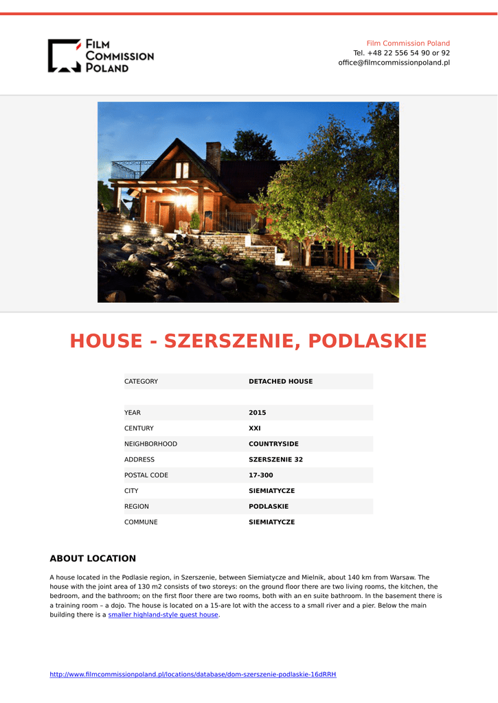 Film Commission Poland Tel. +48 22 556 54 90 or 92 office@filmcommissionpoland.pl HOUSE - SZERSZENIE, PODLASKIE CATEGORY DETACHED HOUSE YEAR 2015 CENTURY XXI NEIGHBORHOOD COUNTRYSIDE ADDRESS SZERSZENIE 32 POSTAL CODE 17-300 CITY SIEMIATYCZE REGION PODLASKIE COMMUNE SIEMIATYCZE ABOUT LOCATION A house located in the Podlasie region, in Szerszenie, between Siemiatycze and Mielnik, about 140 km from Warsaw. The house with the joint area of 130 m2 consists of two storeys: on the ground floor there are two living rooms, the kitchen, the bedroom, and the bathroom; on the first floor there are two rooms, both with an en suite bathroom. In the basement there is a training room – a dojo. The house is located on a 15-are lot with the access to a small river and a pier. Below the main building there is a smaller highland-style guest house. http://www.filmcommissionpoland.pl/locations/database/dom-szerszenie-podlaskie-16dRRH