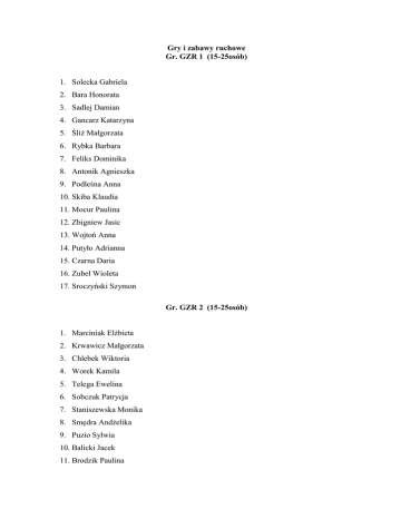 Gry i zabawy ruchowe Gr. GZR 1 (15-25osób) 1. Solecka Gabriela 2. Bara Honorata 3. Sadlej Damian 4. Gancarz Katarzyna 5. Śliż Małgorzata 6. Rybka Barbara 7. Feliks Dominika 8. Antonik Agnieszka 9. Podleśna Anna 10. Skiba Klaudia 11. Mocur Paulina 12. Zbigniew Jasic 13. Wojtoń Anna 14. Putyło Adrianna 15. Czarna Daria 16. Zubel Wioleta 17. Sroczyński Szymon Gr. GZR 2 (15-25osób) 1. Marciniak Elżbieta 2. Krwawicz Małgorzata 3. Chlebek Wiktoria 4. Worek Kamila 5. Telega Ewelina 6. Sobczuk Patrycja 7. Staniszewska Monika 8. Smędra Andżelika 9. Puzio Sylwia 10. Balicki Jacek 11. Brodzik Paulina 12. Majda Adrian 13. Drozd Bartłomiej 14. Sudoł Maciej 15. Porada Paweł 16. Patrzyk Ewa 17. Wityński Adrian 18. Piwowar Klaudia 19. Maksymilian Piasecki Gr. GZR 3 (15-25osób) 1. Uram Krystian 2. Wilk Angelika 3. Kozioł Kinga 4. Lepak Małgorzata 5. Szczepański Michał 6. Grabiec Maksymilian 7. Herdzik Iwona 8. Warchoł Monika 9. Kustra Magdalena 10. Polak Paulina 11. Szary Anna 12. Stecura Paulina 13. Cisek Karolina 14. Owczarska Klaudia 15. Dziak Paulina Gr. GZR 4 (15-25osób) 1. Bieniasz Natalia 2. Nepalska Agnieszka 3. Maziarz Karolina 4. Pietrońska Karolina 5. Sieńko Paweł 6. Lechoniewicz Martyna 7. Szymbara Kinga 8. Niedzioch Marek 9. Kłęczek Piotr 10. Hryszko Artur 11. Cieśla Artur 12. Tarczoń Aleksander 13. Hanas Zuzanna 14. Kita Kinga 15. Kaczor Martyna