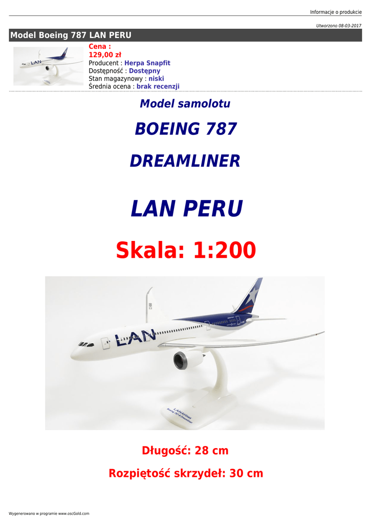Informacje o produkcie Utworzono 08-03-2017 Model Boeing 787 LAN PERU Cena : 129,00 zł Producent : Herpa Snapfit Dostępność : Dostępny Stan magazynowy : niski Średnia ocena : brak recenzji Model samolotu BOEING 787 DREAMLINER LAN PERU Skala: 1:200 Długość: 28 cm Rozpiętość skrzydeł: 30 cm Wygenerowano w programie www.oscGold.com Bardzo dobrej jakości tworzywo, kadłub z grubego plastiku, wysokiej jakości malowanie. Produkt do szybkiego i bardzo łatwego złożenia bezklejowego, składa się z kilku elementów. Elementy zabezpieczone w w folii, całość opakowana w pudełko. Informacje o produkcie Wygenerowano w programie www.oscGold.com