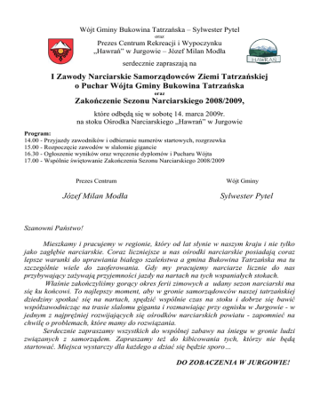 Wójt Gminy Bukowina Tatrzańska – Sylwester Pytel oraz Prezes Centrum Rekreacji i Wypoczynku „Hawrań” w Jurgowie – Józef Milan Modła serdecznie zapraszają na I Zawody Narciarskie Samorządowców Ziemi Tatrzańskiej o Puchar Wójta Gminy Bukowina Tatrzańska oraz Zakończenie Sezonu Narciarskiego 2008/2009, które odbędą się w sobotę 14. marca 2009r. na stoku Ośrodka Narciarskiego „Hawrań” w Jurgowie Program: 14.00 - Przyjazdy zawodników i odbieranie numerów startowych, rozgrzewka 15.00 - Rozpoczęcie zawodów w slalomie gigancie 16.30 - Ogłoszenie wyników oraz wręczenie dyplomów i Pucharu Wójta 17.00 - Wspólnie świętowanie Zakończenia Sezonu Narciarskiego 2008/2009 Prezes Centrum Józef Milan Modła Wójt Gminy Sylwester Pytel Szanowni Państwo! Mieszkamy i pracujemy w regionie, który od lat słynie w naszym kraju i nie tylko jako zagłębie narciarskie. Coraz liczniejsze u nas ośrodki narciarskie posiadają coraz lepsze warunki do uprawiania białego szaleństwa a gmina Bukowina Tatrzańska ma tu szczególnie wiele do zaoferowania. Gdy my pracujemy narciarze licznie do nas przybywający zażywają przyjemności jazdy na nartach na tych wspaniałych stokach. Właśnie zakończyliśmy gorący okres ferii zimowych a udany sezon narciarski ma się ku końcowi. To najlepszy moment, aby w gronie samorządowców naszej tatrzańskiej dziedziny spotkać się na nartach, spędzić wspólnie czas na stoku i dobrze się bawić współzawodnicząc na trasie slalomu giganta i rozmawiając przy ognisku w Jurgowie - w jednym z najprężniej rozwijających się ośrodków narciarskich powiatu - zapomnieć na chwilę o problemach, które mamy do rozwiązania. Serdecznie zapraszamy wszystkich do wspólnej zabawy na śniegu w gronie ludzi związanych z samorządem. Zapraszamy też do kibicowania tych, którzy nie będą startować. Miejsca wystarczy dla każdego a dziać się będzie sporo… DO ZOBACZENIA W JURGOWIE!