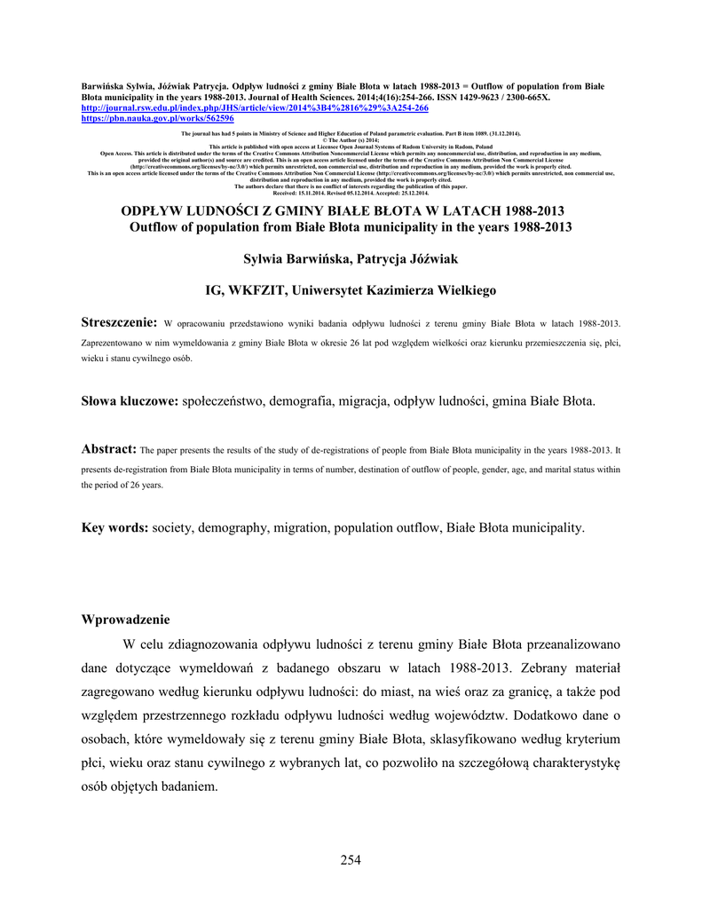 Barwińska Sylwia, Jóźwiak Patrycja. Odpływ ludności z gminy Białe Błota w latach 1988-2013 = Outflow of population from Białe Błota municipality in the years 1988-2013. Journal of Health Sciences. 2014;4(16):254-266. ISSN 1429-9623 / 2300-665X. http://journal.rsw.edu.pl/index.php/JHS/article/view/2014%3B4%2816%29%3A254-266 https://pbn.nauka.gov.pl/works/562596 The journal has had 5 points in Ministry of Science and Higher Education of Poland parametric evaluation. Part B item 1089. (31.12.2014). © The Author (s) 2014; This article is published with open access at Licensee Open Journal Systems of Radom University in Radom, Poland Open Access. This article is distributed under the terms of the Creative Commons Attribution Noncommercial License which permits any noncommercial use, distribution, and reproduction in any medium, provided the original author(s) and source are credited. This is an open access article licensed under the terms of the Creative Commons Attribution Non Commercial License (http://creativecommons.org/licenses/by-nc/3.0/) which permits unrestricted, non commercial use, distribution and reproduction in any medium, provided the work is properly cited. This is an open access article licensed under the terms of the Creative Commons Attribution Non Commercial License (http://creativecommons.org/licenses/by-nc/3.0/) which permits unrestricted, non commercial use, distribution and reproduction in any medium, provided the work is properly cited. The authors declare that there is no conflict of interests regarding the publication of this paper. Received: 15.11.2014. Revised 05.12.2014. Accepted: 25.12.2014. ODPŁYW LUDNOŚCI Z GMINY BIAŁE BŁOTA W LATACH 1988-2013 Outflow of population from Białe Błota municipality in the years 1988-2013 Sylwia Barwińska, Patrycja Jóźwiak IG, WKFZIT, Uniwersytet Kazimierza Wielkiego Streszczenie: W opracowaniu przedstawiono wyniki badania odpływu ludności z terenu gminy Białe Błota w latach 1988-2013. Zaprezentowano w nim wymeldowania z gminy Białe Błota w okresie 26 lat pod względem wielkości oraz kierunku przemieszczenia się, płci, wieku i stanu cywilnego osób. Słowa kluczowe: społeczeństwo, demografia, migracja, odpływ ludności, gmina Białe Błota. Abstract: The paper presents the results of the study of de-registrations of people from Białe Błota municipality in the years 1988-2013. It presents de-registration from Białe Błota municipality in terms of number, destination of outflow of people, gender, age, and marital status within the period of 26 years. Key words: society, demography, migration, population outflow, Białe Błota municipality. Wprowadzenie W celu zdiagnozowania odpływu ludności z terenu gminy Białe Błota przeanalizowano dane dotyczące wymeldowań z badanego obszaru w latach 1988-2013. Zebrany materiał zagregowano według kierunku odpływu ludności: do miast, na wieś oraz za granicę, a także pod względem przestrzennego rozkładu odpływu ludności według województw. Dodatkowo dane o osobach, które wymeldowały się z terenu gminy Białe Błota, sklasyfikowano według kryterium płci, wieku oraz stanu cywilnego z wybranych lat, co pozwoliło na szczegółową charakterystykę osób objętych badaniem. 254 Wyniki Z badania wynika, iż w latach 1988-2013 suma wymeldowań z gminy Białe Błota wyniosła 5100, co w przeliczeniu na rok wynosi średnio 196. Można jednak zauważyć, iż odpływ ludności z badanego obszaru ma rozkład nierównomierny. Analiza wykazała, iż na przestrzeni badanych 26 lat liczba wymeldowań mieściła się w granicach 115 do 307, z najmniejszą wartością odpływu ludności dla 1997 r. oraz największą wartością dla 1989 r. (ryc. 1). Wysoka liczba wymeldowań w latach 1988-1992 prawdopodobnie była związana z migracją ludności do większych miast regionu w poszukiwaniu miejsc pracy. Ponadto zauważono, że w latach 19932005 liczba wymeldowań z terenu gminy Białe Błota nie przekroczyła 189, a przez większość z tych lat utrzymywała się na równomiernym poziomie w granicach 142-155 rocznie. Z kolei, istotny wzrost odpływu ludności zanotowano w latach 2006-2007, a następnie w latach 20102011 oraz w 2013 r. W wskazanych latach liczba wymeldowań przekroczyła obliczoną średnią. Ponadto analizując dane dla lat 2007 i 2013 stwierdzono, że liczby opisujące wielkość badanej cechy były sobie równe i wynosiły 260. Ryc. 1. Liczba wymeldowań z gminy Białe Błota w latach 1988-2013 Źródło: opracowanie własne na podstawie: Roczników statystycznych województwa bydgoskiego 1989-1995 r., Podstawowych danych statystycznych według miast i gmin za 1989-1993r. oraz Banku Danych Lokalnych GUS. Kolejny etap analizy obejmował określenie kierunków odpływu ludności z terenu gminy Białe Błota. W tym celu zinterpretowano dane dotyczące wymeldowań z lat 1988-2013, 255 uprzednio zagregowane z uwzględnieniem trzech rodzajów migracji, tj. do miast, na wieś oraz za granicę. Zgodnie z przyjętym kryterium stwierdzono, że w strukturze wymeldowań z gminy Białe Błota zdecydowanie przeważały wymeldowania do miast. W latach 1988-2013 z badanego obszaru na tereny miejskie wyemigrowało 3867 osób, co stanowi 75,8% wszystkich wymeldowań. Ponadto wartość odpływu ludności (3867 osób) podzielono przez liczbę 26 lat tworzących badany okres i uzyskano średnią wartość wymeldowań z gminy Białe Błota do miast – 149 osób rocznie. W latach 1988-2013 maksymalną liczbę wymeldowań do miast odnotowano dla 1989 r. (222 wymeldowania do miast), natomiast najmniejszy odpływ ludności na tereny miejskie odnotowano dla 2001 r. (97 wymeldowań do miast). Ponadto określono kilka zmian odpływu ludności do miast (por. ryc. 2), do których między innymi należą: utrzymywanie się liczby wymeldowań do ośrodków miejskich na wyrównanym poziomie w latach 1995-2000 oraz 2002-2005; dwa istotne spadki odpływu ludności na tereny miejs