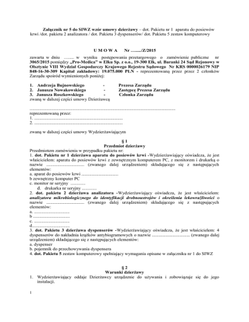Załącznik nr 5 do SIWZ wzór umowy dzierżawy – dot. Pakietu nr 1 aparatu do posiewów krwi /dot. pakietu 2 analizatora / dot. Pakietu 3 dyspenserów/ dot. Pakietu 5 zestaw komputerowy UMOWA Nr …...../Z/2015 zawarta w dniu …..... w wyniku postępowania przetargowego o zamówienie publiczne nr 3065/2015 pomiędzy „Pro-Medica” w Ełku Sp. z o.o., 19-300 Ełk, ul. Baranki 24 Sąd Rejonowy w Olsztynie VIII Wydział Gospodarczy Krajowego Rejestru Sądowego Nr KRS 0000026179 NIP 848-16-30-309 Kapitał zakładowy: 19.075.000 PLN - reprezentowaną przez przez 2 członków Zarządu spośród wymienionych poniżej: 1. Andrzeja Bujnowskiego 2. Janusza Nowakowskiego 3. Janusza Roszkowskiego zwaną w dalszej części umowy Dzierżawcą Prezesa Zarządu Zastępcę Prezesa Zarządu Członka Zarządu ............................................................................................................................... reprezentowaną przez: 1. ............................................................................. 2. ............................................................................. zwaną w dalszej części umowy Wydzierżawiającym §1 Przedmiot dzierżawy Przedmiotem zamówienia w przypadku pakietu nr: 1. dot. Pakietu nr 1 dzierżawa aparatu do posiewów krwi -Wydzierżawiający oświadcza, że jest właścicielem: aparatu do posiewów krwi z zewnętrznym komputerem PC, z monitorem i drukarką o nazwie ................................. (zwanego dalej urządzeniem) składającego się z następujących elementów: a. aparat do posiewów krwi ................................ b zewnętrzny komputer PC c. monitor nr seryjny ............. d. drukarka nr seryjny ............. 2. dot. pakietu 2 dzierżawa analizatora -Wydzierżawiający oświadcza, że jest właścicielem: analizatora mikrobiologicznego do identyfikacji drobnoustrojów i określenia lekowrażliwości o nazwie ................................. (zwanego dalej urządzeniem) składającego się z następujących elementów: a. ............................... b ................................ c. ............................... d................................. 3. dot. Pakietu 3 dzierżawa dyspenserów -Wydzierżawiający oświadcza, że jest właścicielem: 4 dyspenserów do nakładnia krążków antybiogramowych o nazwie ................................. (zwanego dalej urządzeniem) składającego się z następujących elementów: a. dyspenser b. pojemnik do przechowywania dyspensera 4. dot. Pakietu 5 zestaw komputerowy spełniający wymagania opisane w załączniku nr 1 do SIWZ §2 Warunki dzierżawy 1. Wydzierżawiający oddaje Dzierżawcy urządzenie do używania i zobowiązuje się do jego instalacji. 1 2. Instalacja urządzenia nastąpi w siedzibie Dzierżawcy - „Pro-Medica” w Ełku Sp. z o.o., 19-300 Ełk, ul. Baranki 24 w terminie 1 tygodnia od daty zawarcia umowy. 3. Instalacja urządzenia zostanie potwierdzona protokołem przekazania. 4. Wydzierżawiający zapewni Dzierżawcy wraz z urządzeniem: a. instrukcję obsługi urządzenia w języku polskim, b. całość dokumentacji technicznej niezbędnej do prawidłowego korzystania z urządzenia, c. bezpłatny montaż aparatu d. przeszkolenie personelu w obsłudze urządzenia §3 1. Dzierżawca będzie używał urządzenie w sposób odpowiadający jego właściwościom i przeznaczeniu, zgodnie z zasadami prawidłowej obsługi. 2. Bez uprzedniej zgody Wydzierżawiającego Dzierżawca nie może obciążać, użyczać oraz rozporządzać urządzeniem w jakikolwiek inny sposób na rzecz osób trzecich. 3. Dzierżawca zobowiązuje się do ubezpieczenia urządzenia w okresie obowiązywania umowy. 4. Dzierżawca zobowiązuje się zwrócić urządzenie Wydzierżawiającemu z chwilą rozwiązania umowy, w stanie nie pogorszonym poza normalnym stopniem zużycia wynikającym z eksploatacji. 5. W okresie 24 miesięcy najmu Wydzierżawiający zapewni: a. serwis w cenie oferty b. naprawy gwarancyjne tego samego podzespołu i jego wymianę na nowy - do 3 dni roboczych. c. dwukrotny bezpłatny przegląd urządzenia w okresie trwania umowy. §4 Warunki płatności 1. Czynsz dzierżawy ustalono miesięcznie w wysokości ............. zł – wartość dzierżawy netto: ....................... + VAT = ........................ zł – wartość dzierżawy brutto (słownie........................................................................... złotych 00/100). 2. Należność za dzierżawę będzie regulowana po dostarczeniu faktury przelewem na rachunek Wydzierżawiającego w terminie 30 dni od daty jej wystawienia. 3. Dzierżawca zapewni niezmienność ceny dzierżawy analizatora przez okres 24 m-cy od daty zawarcia umowy. §6 Kary umowne 1. W razie niewykonania lub nienależytego wykonania umowy Wydzierżawiający zobowiązuje się zapłacić Dzierżawcy kary umowne: a. w wysokości 5% wartości pozostałego do zapłaty czynszu dzierżawnego, gdy Dzierżawca odstąpi od umowy z powodu okoliczności, za które odpowiada Wydzierżawiający , b. w wysokości 2% wartości brutto pozostałego do zapłaty czynszu dzierżawnego w przypadku nie dostarczenia w terminie Dzierżawcy oferowanego analizatora za każdy rozpoczęty dzień zwłoki §7 Dopuszczalne zmiany umowy 1. Strony dopuszczają zmianę umowy w zakresie podatku VAT z mocą obowiązują od wejścia w życie nowych stawek tego podatku na zasadzie prawa powszechnie obowiązującego. 2. Postanowienia umowy nie mogą ulec zmianie, chyba że konieczność wprowadzenia takich zmian wynika z nadzwyczajnych okoliczności, których nie można było przewidzieć w chwili jej zawarcia. 3. Wszelkie zmiany i uzupełnienia umowy wymagają pod rygorem nieważności formy pisemnego aneksu. §9 Postanowienia ogólne 1. Umowę niniejszą strony zawierają na czas 24 miesięcy to jest od dnia .................. r. dnia ........................ r. 2 do 2. W sprawach nie uregulowanych niniejszą umową mają zastosowanie przep
