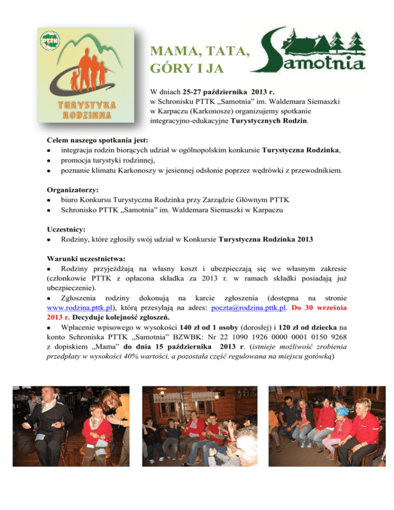 MAMA, TATA, GÓRY I JA W dniach 25-27 października 2013 r. w Schronisku PTTK „Samotnia” im. Waldemara Siemaszki w Karpaczu (Karkonosze) organizujemy spotkanie integracyjno-edukacyjne Turystycznych Rodzin. Celem naszego spotkania jest: integracja rodzin biorących udział w ogólnopolskim konkursie Turystyczna Rodzinka, promocja turystyki rodzinnej, poznanie klimatu Karkonoszy w jesiennej odsłonie poprzez wędrówki z przewodnikiem. Organizatorzy: biuro Konkursu Turystyczna Rodzinka przy Zarządzie Głównym PTTK Schronisko PTTK „Samotnia” im. Waldemara Siemaszki w Karpaczu Uczestnicy: Rodziny, które zgłosiły swój udział w Konkursie Turystyczna Rodzinka 2013 Warunki uczestnictwa: Rodziny przyjeżdżają na własny koszt i ubezpieczają się we własnym zakresie (członkowie PTTK z opłacona składka za 2013 r. w ramach składki posiadają już ubezpieczenie). Zgłoszenia rodziny dokonują na karcie zgłoszenia (dostępna na stronie www.rodzina.pttk.pl), którą przesyłają na adres: [email protected]. Do 30 września 2013 r. Decyduje kolejność zgłoszeń. Wpłacenie wpisowego w wysokości 140 zł od 1 osoby (dorosłej) i 120 zł od dziecka na konto Schroniska PTTK „Samotnia” BZWBK: Nr 22 1090 1926 0000 0001 0150 9268 z dopiskiem „Mama” do dnia 15 października 2013 r. (istnieje możliwość zrobienia przedpłaty w wysokości 40% wartości, a pozostała część regulowana na miejscu gotówką) RAMOWY PROGRAM SPOTKANIA: 25 października 2013r. przyjazd do Karpacza (we własnym zakresie). Istnieje możliwość zostawienia samochodu na parkingu. Dotarcie we własnym zakresie do Schroniska w godzinach 13-16. W uzasadnionych przypadkach (małe dzieci) będzie możliwość zabrania bagażu. 17.00 obiadokolacja. 18-20 wspólny spacer do Schroniska PTTK „Strzecha Akademicka” Wieczorem: spotkanie integracyjne rodzin. Rodziny prosimy o przygotowanie własnej wersji legendy o Duchu Karkonoszu 26 października 2013r. 8-9.00 śniadanie w schronisku PTTK „Samotnia”. 9.30 spotkanie z przewodnikiem i całodniowa wycieczka Trasa I: w Karkonosze, w zależności od warunków pogodowych. Dla chętnych wejście na Śnieżkę (1602 m) – najwyższy szczyt Karkonoszy, spacer do po czeskich Karkonoszach po drodze odpoczynek w schronisku. Trasa II: w Karkonosze na Przełęcz Karkonoską przez Słoneczniki – do schroniska PTTK „Odrodzenie”. 17.00 obiadokolacja w schronisku PTTK Samotnia. Wieczorem: Piosenka nie zna granic, czyli śpiewamy rodzinnie piosenkę turystyczną. 27 października 2013r. 8-9.00 śniadanie w schronisku PTTK ‘Samotnia”, wykwaterowanie. Dla chętnych rodzin propozycja wycieczki przez Strzechę Akademicką, Słoneczniki do Wangu ew. rodziny realizują program wg własnego pomysłu korzystając z porad gospodarzy schroniska i przewodników. W ramach wpisowego: 2 noclegi w schronisku PTTK „Samotnia”, 2 śniadania, 2 obiadokolacje, przewodnik, mapa Karkonoszy (dla rodziny). Informacji na temat spotkania udziela: Jolanta Śledzińska tel.: +48 22 826 57 35, mobile: +48 604221377, mail:[email protected] Do zobaczenia na szlaku!