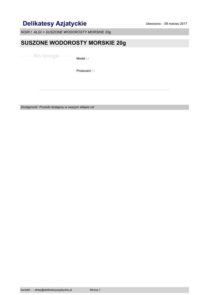 Delikatesy Azjatyckie Utworzono : 08 marzec 2017 NORI I ALGI > SUSZONE WODOROSTY MORSKIE 20g SUSZONE WODOROSTY MORSKIE 20g No image Model : - Producent : - Dostępność: Produkt dostępny w naszym sklepie od kontakt : - [email protected] Strona 1
