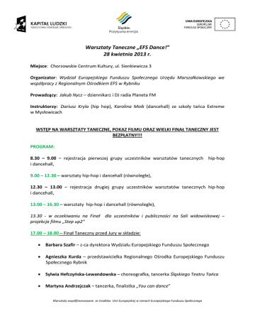 Warsztaty Taneczne „EFS Dance!” 28 kwietnia 2013 r. Miejsce: Chorzowskie Centrum Kultury, ul. Sienkiewicza 3 Organizator: Wydział Europejskiego Funduszu Społecznego Urzędu Marszałkowskiego we współpracy z Regionalnym Ośrodkiem EFS w Rybniku Prowadzący: Jakub Nycz – dziennikarz i DJ radia Planeta FM Instruktorzy: Dariusz Kryla (hip hop), Karolina Moik (dancehall) ze szkoły tańca Extreme w Mysłowicach WSTĘP NA WARSZTATY TANECZNE, POKAZ FILMU ORAZ WIELKI FINAŁ TANECZNY JEST BEZPŁATNY!!! PROGRAM: 8.30 – 9.00 – rejestracja pierwszej grupy uczestników warsztatów tanecznych hip-hop i dancehall, 9.00 – 12.30 – warsztaty hip-hop i dancehall (równoległe), 12.30 – 13.00 – rejestracja drugiej grupy uczestników warsztatów tanecznych hip-hop i dancehall, 13.00 – 16.30 – warsztaty hip-hop i dancehall (równoległe), 13.30 - w oczekiwaniu na Finał dla uczestników i publiczności na Sali widowiskowej – projekcja filmu „Step up2” 17.00 – 18.00 – Finał Taneczny przed Jury w składzie: Barbara Szafir – z-ca dyrektora Wydziału Europejskiego Funduszu Społecznego Agnieszka Kurda – przedstawicielka Regionalnego Ośrodka Europejskiego Funduszu Społecznego Rybnik Sylwia Hefczyńska-Lewandowska – choreografka, tancerka Śląskiego Teatru Tańca Martyna Andrzejczak – tancerka, finalistka „You can dance” Warsztaty współfinansowane ze środków Unii Europejskiej w ramach Europejskiego Funduszu Społecznego Mateusz Sobecko – tancerz, finalista “You can dance” Michał Szuba – choreograf, tancerz, właściciel szkoły tańca Iskra, uczestnik „Tańca z gwiazdami” Komisja ocenia: a) technikę wykonania b) estetykę występu c) ogólne wrażenie artystyczne 18.00 - ogłoszenie laureatów EFS DANCE, wręczenie nagród Zakończenie Warsztaty współfinansowane ze środków Unii Europejskiej w ramach Europejskiego Funduszu Społecznego
