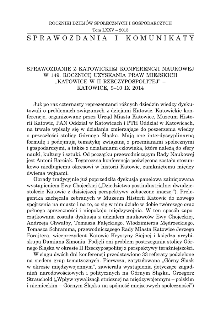 ROCZNIKI DZIEJÓW SPOŁECZNYCH I GOSPODARCZYCH Tom LXXV – 2015 SPRAWOZDANIA I KOMUNIKATY SPRAWOZDANIE Z KATOWICKIEJ KONFERENCJI NAUKOWEJ W 149. ROCZNICĘ UZYSKANIA PRAW MIEJSKICH „KATOWICE W II RZECZYPOSPOLITEJ” – KATOWICE, 9–10 IX 2014 Już po raz czternasty reprezentanci różnych dziedzin wiedzy dyskutowali o problemach związanych z dziejami Katowic. Katowickie konferencje, organizowane przez Urząd Miasta Katowice, Muzeum Historii Katowic, PAN Oddział w Katowicach i PTH Oddział w Katowicach, na trwałe wpisały się w działania zmierzające do poszerzenia wiedzy o przeszłości stolicy Górnego Śląska. Mają one interdyscyplinarną formułę i podejmują tematykę związaną z przemianami społecznymi i gospodarczymi, a także z działaniami człowieka, które należą do sfery nauki, kultury i sztuki. Od początku przewodniczącym Rady Naukowej jest Antoni Barciak. Tegoroczna konferencja poświęcona została stosunkowo niedługiemu okresowi w historii Katowic, zamkniętemu między dwiema wojnami. Obrady tradycyjnie już poprzedziła dyskusja panelowa zainicjowana wystąpieniem Ewy Chojeckiej („Dziedzictwo postindustrialne: dwudziestolecie Katowic z dzisiejszej perspektywy zobaczone inaczej”). Prelegentka zachęcała zebranych w Muzeum Historii Katowic do nowego spojrzenia na miasto i na to, co się w nim działo w dobie twórczego oraz pełnego sprzeczności i niepokoju międzywojnia. W ten sposób zapoczątkowana została dyskusja z udziałem naukowców Ewy Chojeckiej, Andrzeja Chwalby, Tomasza Falęckiego, Włodzimierza Mędrzeckiego, Tomasza Schramma, przewodniczącego Rady Miasta Katowice Jerzego Forajtera, wiceprezydent Katowic Krystyny Siejnej i księdza arcybiskupa Damiana Zimonia. Podjęli oni problem postrzegania stolicy Górnego Śląska w okresie II Rzeczypospolitej z perspektywy teraźniejszości. W ciągu dwóch dni konferencji przedstawiono 33 referaty podzielone na siedem grup tematycznych. Pierwsza, zatytułowana „Górny Śląsk w okresie międzywojennym”, zawierała wystąpienia dotyczące zagadnień narodowościowych i politycznych na Górnym Śląsku. Grzegorz Strauchold („Wpływ rywalizacji etnicznej na międzywojennym – polskim i niemieckim – Górnym Śląsku na spójność miejscowych społeczności”) 352 Sprawozdania i komunikaty ukazał Śląsk jako mozaikę narodowościową złożoną z Niemców, Ślązaków, Polaków i Żydów. Dwa kolejne referaty, Tomasza Falęckiego („Obóz sanacyjny a chrześcijańska demokracja w województwie śląskim – charakterystyka konfliktu”) i Wandy Musialik („Śląskie losy Michała Grażyńskiego”) poświęcone zostały konfliktowi, który podzielił ówczesną scenę polityczną, oraz postaciom politycznych oponentów, Wojciecha Korfantego i Michała Grażyńskiego. Z kolei Zygmunt Woźniczka („Dokonania i osiągnięcia władz województwa śląskiego skazane na niepamięć w PRL”) przedstawił sposoby zacierania pamięci o tamtych czasach i ludziach po 1945 r. Następna grupa referatów zebrana została pod wspólnym tytułem „Katowice w dobie autonomii”. Jan F. Lewandowski („Jak Katowice zostały stolicą województwa śląskiego w 1922 r.”) omówił czynniki, które zadecydowały, że szybko rozwijające się miasto stało się centrum dyspozycyjnym Górnego Śląska, a w konsekwencji tego stolicą województwa. Z kolei Włodzimierz Mędrzecki („Katowice jako stolica autonomicznego województwa”) przedstawił wpływ utworzenia województwa śląskiego ze stolicą w Katowicach na proces formowania się nowego społeczeństwa wielkomiejskiego i znaczącego środowiska kulturalnego oraz ośrodka inteligencji polskiej. Powstanie diecezji katowickiej i rola pierwszych jej duszpasterzy były tematem wystąpienia Wojciecha Schäffera („Katowice jako siedziba górnośląskiego biskupstwa”). Na związki między Katowicami i Krakowem wskazał Andrzej Chwalba („Katowice i Kraków żywoty równoległe”), który zauważył, że oba miasta znacznie się różniły między sobą, zarówno pod względem społecznym, jak i mentalnym. Kilka wystąpień poświęconych zostało problematyce politycznej i gospodarczej. Józef Ciągwa („Kontrowersje wokół tangenty w latach 1922–1939”) pokazał, jak koncepcja ówczesnego ministra skarbu Romana Rymarskiego stała się podstawą samodzielności sejmu śląskiego, a tym samym autonomii Śląska. Maciej Fic („W stronę separatyzmu w II RP. Aktywność Jana Kustosa i Związku Obrony Górnoślązaków na terenie Katowic”) przedstawił złożone problemy separatyzmu i wyodrębnienia się w latach 20. etnicznej grupy Górnoślązaków. Dzieje policji politycznej, która miała charakter urzędu śledczego zajmującego się zarówno przestępstwami pospolitymi, jak i politycznymi, omówiła Joanna Januszewska-Jurkiewicz („Na straży bezpieczeństwa państwa. Urząd śledczy w Katowicach w świetle materiałów z procesu przeciwko naczelnikowi Marianowi Chomrańskiemu”). Tę grupę tematyczną zakończyła prezentacja Jacka Kurka i Anny Piontek („»Największym doktrynerem jest ten, kto zapoznaje rzeczywistość życia«. Sprawozdania i komunikaty 353 Społeczno-gospodarcza polityka władz Katowic w dobie Wielkiego Kryzysu: 1929–1935”) przedstawiająca na podstawie dokumentów magistratu politykę społeczną i gospodarczą władz w latach kryzysu. „Katowice jako ośrodek kultury”, „Katowickie środowisko naukowe, artystyczne i pedagogiczne”, „Katowickie osobowości” i „Katowicka architektura okresu międzywojennego” to kolejne tematy, które stały się przedmiotem rozważań badaczy. Życie elit i związane z nim powstanie i rozwój instytucji kultury, towarzystw oraz klubów ukazała Jadwiga Lipońska-Sajdak („Życie towarzyskie katowickich elit w międzywojniu”), a Tomasz Sporyń („Kabaret w Katowicach w okresie dwudziestolecia międzywojennego”) przedstawił działalność kabaretów i te
