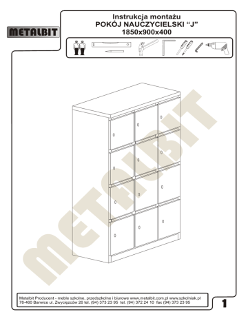 METALBIT Instrukcja monta¿u POKÓJ NAUCZYCIELSKI “J” 1850x900x400 Metalbit Producent - meble szkolne, przedszkolne i biurowe www.metalbit.com.pl www.szkolniak.pl 78-460 Barwice ul. Zwyciêzców 26 tel. (94) 373 23 95 tel. (94) 372 24 10 fax (94) 373 23 95 1 Instrukcja monta¿u POKÓJ NAUCZYCIELSKI “J” 1850x900x400 METALBIT 1 1 2L 2P 3 1 - cokó³ - 864 x 80 2L - bok lewy - 1832 x 380 2P - bok prawy - 1832 x 380 3 - wieniec dolny - 864 x 377 4 - przegroda - 1734 x 377 5 - pó³ka - 276 x 377 6 - wieniec górny - 901 x 400 7 - drzwi dolne - 417 x 290 7a - drzwi górne - 417 x 290 8 - plecy HDF 3 - 1764 x 888 9 - pó³ka wewnêtrzna - 276 x 360 5 4 5 5 4 5 5 5 5 5 7a 5 7 7a 6 7a 7 7 7 7 7 7 7 7 9 8 9 9 9 9 9 9 9 9 9 9 9 Nr A B C D E F G Il.szt Wkrêt 2,5x20 Zacisk mimoœrodu 40 Ko³ek mimoœrodu 56 Ko³ek drew 8x35 58 56 Wkrêt 3x13 Wkrêt 3x20 24 Rygiel zamka 12 48 Nr H I K L M N O P Il.szt Zamek 12 Regulator 4 Wkrêt 4x16 Prowadnik zawiasu 48 24 Zawias wpuszczany 24 Wkrêt prowadnika Zaœlepka mimoœrodu Podpórka ko³kowa 48 20 48 Metalbit Producent - meble szkolne, przedszkolne i biurowe www.metalbit.com.pl www.szkolniak.pl 78-460 Barwice ul. Zwyciêzców 26 tel. (94) 373 23 95 tel. (94) 372 24 10 fax (94) 373 23 95 2 Instrukcja monta¿u POKÓJ NAUCZYCIELSKI “J” 1850x900x400 METALBIT Uzbrojenie boków szafy LN C 2P E 2L D G I Uzbrojenie przegród szafy Uwaga! LN Ko³eki drewniane D w przegrodach prze³o¿yæ przez otwory na wylot ustawiaj¹c równe czêsci ko³ków po obu stronach C P 4 E y szaf t n o Fr D 4 G fy t sza n o r F Metalbit Producent - meble szkolne, przedszkolne i biurowe www.metalbit.com.pl www.szkolniak.pl 78-460 Barwice ul. Zwyciêzców 26 tel. (94) 373 23 95 tel. (94) 372 24 10 fax (94) 373 23 95 3 Instrukcja monta¿u POKÓJ NAUCZYCIELSKI “J” 1850x900x400 METALBIT D UWAGA! Strza³kê na zacisku skierowaæ w stronê ko³ka mimoœrodu, po w³o¿eniu ko³ka i elementów skrêcanych przekrêciæ zacisk w prawo do oporu 2P Titus 4 5 5 6 4 6 3 3 4 1 2 1 1 1 Metalbit Producent - meble szkolne, przedszkolne i biurowe www.metalbit.com.pl www.szkolniak.pl 78-460 Barwice ul. Zwyciêzców 26 tel. (94) 373 23 95 tel. (94) 372 24 10 fax (94) 373 23 95 4 Instrukcja monta¿u POKÓJ NAUCZYCIELSKI “J” 1850x900x400 METALBIT Uzbrojenie pó³ek szafy C Uzbrojenie drzwi szafy MK F Gó ra 7/7a drz wi H S Uwaga! Wymiar “S” w drzwiach górnych 7a wynosi 205 mm Wymiar “S” w drzwiach dolnych 7 wynosi 200 mm A P1=P2 8 8 Metalbit Producent - meble szkolne, przedszkolne i biurowe www.metalbit.com.pl www.szkolniak.pl 78-460 Barwice ul. Zwyciêzców 26 tel. (94) 373 23 95 tel. (94) 372 24 10 fax (94) 373 23 95 5 Instrukcja monta¿u POKÓJ NAUCZYCIELSKI “J” 1850x900x400 METALBIT 7a 7 7 7 USTAWIENIE I REGULACJA DRZWI 10 Regulacja drzwi góra/dó³ 4 4 Regulacja drzwi lewo/prawo Regulacja ustawienia g³êbokoœci drzwi Wiêcej instrukcji i filmy monta¿owe dostêpne na stronie www. metalbit.com.pl/instrukcje_montazu Metalbit Producent - meble szkolne, przedszkolne i biurowe www.metalbit.com.pl www.szkolniak.pl 78-460 Barwice ul. Zwyciêzców 26 tel. (94) 373 23 95 tel. (94) 372 24 10 fax (94) 373 23 95 6