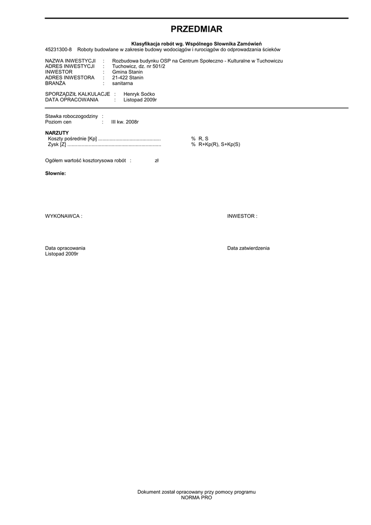 PRZEDMIAR 45231300-8 Klasyfikacja robót wg. Wspólnego Słownika Zamówień Roboty budowlane w zakresie budowy wodociągów i rurociągów do odprowadzania ścieków NAZWA INWESTYCJI ADRES INWESTYCJI INWESTOR ADRES INWESTORA BRANśA : : : : : Rozbudowa budynku OSP na Centrum Społeczno - Kulturalne w Tuchowiczu Tuchowicz, dz. nr 501/2 Gmina Stanin 21-422 Stanin sanitarna SPORZĄDZIŁ KALKULACJE : DATA OPRACOWANIA : Stawka roboczogodziny : Poziom cen : Henryk Soćko Listopad 2009r III kw. 2008r NARZUTY Koszty pośrednie [Kp] ............................................ Zysk [Z] .................................................................. Ogółem wartość kosztorysowa robót : % R, S % R+Kp(R), S+Kp(S) zł Słownie: WYKONAWCA : INWESTOR : Data opracowania Listopad 2009r Data zatwierdzenia Dokument został opracowany przy pomocy programu NORMA PRO OGÓLNA CHARAKTERYSTYKA OBIEKTU Przedmiotem opracowania jest projekt budowlany przyłącza wody i kanalizacji do Centrum Społeczno - Kulturalnego w Tuchowiczu Zakres opracowania obejmuje: - Przyłącze wody x rur PE40 = 4,5m - Opaska NWZ100/2" =1kpl - Wodomierz skrzydełkowy dn25 =1szt - Zawory kulowe dn32=2szt - zawór zwrotny antyskaŜeniowy dn32=1szt - Przyłącze kanalizacji z rur PCV160=15m - Studnia z kręgów betonowych Dn1000=1kpl - Szambo PEHD SPIRO, V-5m3 = 1szt -2- Norma PRO Wersja 4.26 wkz-tuchowicz PRZEDMIAR Lp. Podstawa Opis i wyliczenia j.m. 1 Roboty ziemne 1 KNR-W 2-01 Wykopy liniowe i szerokości 0.8-1.5 m pod fundamenty, rurociągi, kolektory w m3 d.1 0310-02 gruntach suchych z wydobyciem urobku łopatą lub wyciągiem ręcznymkat. IIIIV; głębokość do 1.5 m (na zewnątrz budynku) 4.4 m3 2 KNR-W 2-01 Roboty ziemne wykonywane koparkami podsiębiernymi o pojemności łyŜki d.1 0204-03 0.25 m3 w gruncie kat. I-II z transportem urobku przyczepami samowyładowczymi holowanymi ciągnikami na odległość do 0.5 km 12 m3 4 KNR-W 2-01 Zasypywanie wykopów spycharkami z przemieszczeniem gruntu na odległość m3 d.1 0222-01 do 10 m w gruncie kat. I-III 39.2 m3 5 KNR-W 2-01 Obsypka z piasku szamba w gotowym suchym wykopie z gotowego kruszywa- m3 d.1 0609-06 analogia 5 m3 7 KNR 2-18 d.1 0722-05 2 8 KNNR 4 d.2 1308-02 PodłoŜa z materiałów sypkich o grubości 25 cm - podsypka + obsypka rury m2 18*0.8 m2 Izolacja ŜuŜlem - zabezpieczenie rurociągów o śr. 150 mm przed zamarzaniem 15 m m Roboty montaŜowe Kanały z rur PVC łączonych na wcisk o śr. zewn. 160 mm m 15 m 9 KNR-W 2-18 MontaŜ szamba z PEHD o pojemności 5m3 - analogia d.2 0513-05 1 szambo szambo 10 KNR-W 2-18 Studnie rewizyjne z kręgów betonowych o śr. 1000 mm w gotowym wykopie o stud. d.2 0513-01 głębok. 1m 1 stud. 11 KNNR 4 d.2 1702-02 12 KNNR 4 d.2 1708-01 13 KNNR 4 d.2 1113-01 14 KNNR 4 d.2 1612-01 Podłączenie instalacji do sieci wodociągowej - nasady rurowe (opaski) na istniejących rurociągach o śr. 100 mm 1 4.400 RAZEM 4.400 12.000 RAZEM 12.000 23.520 RAZEM 23.520 39.200 RAZEM 39.200 5.000 RAZEM 5.000 14.400 RAZEM 14.400 15.000 RAZEM 15.000 15.000 RAZEM 15.000 1.000 RAZEM 1.000 1.000 RAZEM 1.000 1.000 RAZEM 1.000 4.500 RAZEM 4.500 1.000 RAZEM 1.000 szt. szt. Przyłącze wodociągowe z rur ciśnieniowych PE łączonych metodą zgrzewania m czołowego - rurociągi o śr. 40 mm (nakłady na 1 m przyłącza) 4.5 m Zasuwy typu"E" z obudową o śr.40 mm montowane na rurociągach PVC i PE kpl. 1 kpl. Jednokrotne płukanie sieci wodociągowej o śr. nominalnej do 150 mm odc.20 0m odc.20 0m 1 1.000 RAZEM 15 KNNR 4 d.2 1611-01 Dezynfekcja rurociągów sieci wodociągowych o śr.nominalnej do 150 mm 1 odc.20 0m odc.20 0m 16 KNR-W 2-15 Dodatki za wykonanie obustronnych podejść do wodomierzy skrzydełkowych o kpl. d.2 0123-03 śr. nominalnej 25 mm w rurociągach z tworzyw sztucznych 1 kpl. 17 KNR-W 2-15 Wodomierze skrzydełkowe domowe o śr. nominalnej 25 mm d.2 0140-03 1 -3- Norma PRO Wersja 4.26 Razem m3 3 KNR-W 2-01 Wykopy jamiste wykonywane koparkami podsiębiernymi 0.25 m3 na odkład w m3 d.1 0215-04 gruncie kat. III - pod szambo 23.52 m3 6 KNR 2-18 d.1 0501-04 Poszcz 1.000 1.000 RAZEM 1.000 1.000 RAZEM 1.000 1.000 RAZEM 1.000 kpl. kpl. wkz-tuchowicz PRZEDMIAR Lp. Podstawa Opis i wyliczenia j.m. 18 KNR-W 2-15 Zawory przelotowe instalacji wodociągowych z rur z tworzyw sztucznych o śr. szt. d.2 0132-04 nominalnej 32 mm 2 szt. 19 KNR-W 2-15 Zawory zwrotne antyskaŜeniowe instalacji wodociągowych o śr. nominalnej 32 szt. d.2 0130-04 mm 1 szt. -4- Norma PRO Wersja 4.26 Poszcz Razem 2.000 RAZEM 2.000 1.000 RAZEM 1.000