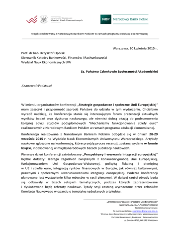 Projekt realizowany z Narodowym Bankiem Polskim w ramach programu edukacji ekonomicznej Warszawa, 20 kwietnia 2015 r. Prof. dr hab. Krzysztof Opolski Kierownik Katedry Bankowości, Finansów i Rachunkowości Wydział Nauk Ekonomicznych UW Sz. Państwo Członkowie Społeczności Akademickiej Szanowni Państwo! W imieniu organizatorów konferencji „Strategie gospodarcze i społeczne Unii Europejskiej” mam zaszczyt i przyjemność zaprosić Państwa do udziału w tym wydarzeniu. Chciałbym wyrazić nadzieję, że konferencja stanie się interesującym forum prezentacji aktualnych wyników badań oraz dyskursu naukowego, ale również dobrą okazją do podsumowania kolejnej edycji studiów podyplomowych "Mechanizmy funkcjonowania strefy euro" realizowanych z Narodowym Bankiem Polskim w ramach programu edukacji ekonomicznej. Konferencja realizowana z Narodowym Bankiem Polskim odbędzie się w dniach 28-29 września 2015 r. na Wydziale Nauk Ekonomicznych Uniwersytetu Warszawskiego. Artykuły naukowe zgłoszone na konferencję, które przejdą proces recenzji, zostaną wydane w formie książki, indeksowanej w międzynarodowych bazach publikacji naukowych. Pierwszy dzień konferencji zatytułowany „Perspektywy i wyzwania integracji europejskiej” będzie dotyczył szeregu zagadnień związanych z konkurencyjnością Unii Europejskiej, funkcjonowaniem Unii Gospodarczo-Walutowej, polityką fiskalną i pieniężną w UE i strefie euro, integracją rynków finansowych w Europie, jak również kulturowymi, prawnymi i społecznymi uwarunkowaniami integracji europejskiej. Podczas konferencji planowane jest wystąpienie kilku mówców w sesji plenarnej. W dalszej części obrady będą się odbywały w trzech sekcjach tematycznych, podczas których zaprezentowane i dyskutowane będą referaty naukowe. Tytuły sesji zostaną wyznaczone przez członków Komitetu Naukowego w oparciu o tematykę nadesłanych artykułów. „STRATEGIE GOSPODARCZE I SPOŁECZNE UNII EUROPEJSKIEJ” WWW.WNE.UW.EDU.PL/JGORSKI/EUROZONE SEKRETARIAT KONFERENCJI: DR JAROSŁAW GÓRSKI, [email protected] WYDZIAŁ NAUK EKONOMICZNYCH UNIWERSYTETU WARSZAWSKIEGO KATEDRA BANKOWOŚCI, FINANSÓW I RACHUNKOWOŚCI UL. DŁUGA 44/50, 00-241 WARSZAWA Projekt realizowany z Narodowym Bankiem Polskim w ramach programu edukacji ekonomicznej Drugi dzień konferencji pt. „Dokąd zmierzasz Europo? Strategie gospodarcze i społeczne Unii Europejskiej” będzie okazją do debaty na temat przyszłości Europy, perspektyw pełnego uczestnictwa Polski w UGW a także do uhonorowania najlepszych absolwentów studiów podyplomowych "Mechanizmy funkcjonowania strefy euro" z roku akademickiego 2014/2015. W imieniu organizatorów chciałbym zadeklarować, iż dołożone zostaną wszelkie starania, aby wzorem lat ubiegłych konferencja stanowiła bardzo inspirującą debatę na tematy ważne i aktualne, z udziałem najwyższej klasy specjalistów ze sfery nauki i praktyki. Przewidujemy udział kilku gości specjalnych oraz wielu mówców obdarzonych autorytetem merytorycznym, wywodzących się ze świata akademickiego, bankowości, organizacji eksperckich. Uprzejmie zapraszam do przygotowania artykułu naukowego. W przypadku pozytywnego przejścia procesu recenzji, możliwe będzie uzyskanie publikacji w książce konferencyjnej oraz wygłoszenia referatu w trakcie jednej z sekcji tematycznych pierwszego dnia konferencji. Na zgłoszenie udziału w konferencji z referatem oczekujemy do 3. maja br. Udział w konferencji jest bezpłatny, uczestnicy otrzymają również książkę konferencyjną. Zachęcam do zapoznania się z materiałem informacyjnym zawierającym m.in. projekt programu konferencji, wytyczne dotyczące przygotowania tekstów i ważne terminy. Pragnę zastrzec, iż program może ulec zmianie, o czym będziemy informować poprzez stronę internetową wydarzenia. Również na stronie internetowej publikowane będą dalsze uszczegółowienia założeń i programu konferencji. Zapraszam również do zapoznania się z materiałami z poprzednich edycji konferencji: wystąpieniami gości, relacjami z wydarzenia oraz elektronicznymi wersjami wydanych książek. Są one dostępne na stronie: www.wne.uw.edu.pl/jgorski/eurozone. Licząc na Państwa zainteresowanie, pozostaję z poważaniem, Prof. dr hab. Krzysztof Opolski Przewodniczący Komitetu Naukowego Konferencji „STRATEGIE GOSPODARCZE I SPOŁECZNE UNII EUROPEJSKIEJ” WWW.WNE.UW.EDU.PL/JGORSKI/EUROZONE SEKRETARIAT KONFERENCJI: DR JAROSŁAW GÓRSKI, [email protected] WYDZIAŁ NAUK EKONOMICZNYCH UNIWERSYTETU WARSZAWSKIEGO KATEDRA BANKOWOŚCI, FINANSÓW I RACHUNKOWOŚCI UL. DŁUGA 44/50, 00-241 WARSZAWA