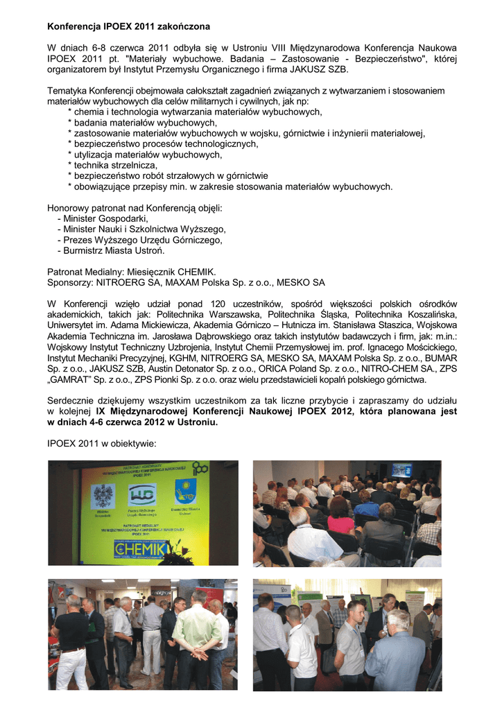 Konferencja IPOEX 2011 zakończona W dniach 6-8 czerwca 2011 odbyła się w Ustroniu VIII Międzynarodowa Konferencja Naukowa IPOEX 2011 pt. "Materiały wybuchowe. Badania – Zastosowanie - Bezpieczeństwo", której organizatorem był Instytut Przemysłu Organicznego i firma JAKUSZ SZB. Tematyka Konferencji obejmowała całokształt zagadnień związanych z wytwarzaniem i stosowaniem materiałów wybuchowych dla celów militarnych i cywilnych, jak np: * chemia i technologia wytwarzania materiałów wybuchowych, * badania materiałów wybuchowych, * zastosowanie materiałów wybuchowych w wojsku, górnictwie i inżynierii materiałowej, * bezpieczeństwo procesów technologicznych, * utylizacja materiałów wybuchowych, * technika strzelnicza, * bezpieczeństwo robót strzałowych w górnictwie * obowiązujące przepisy min. w zakresie stosowania materiałów wybuchowych. Honorowy patronat nad Konferencją objęli: - Minister Gospodarki, - Minister Nauki i Szkolnictwa Wyższego, - Prezes Wyższego Urzędu Górniczego, - Burmistrz Miasta Ustroń. Patronat Medialny: Miesięcznik CHEMIK. Sponsorzy: NITROERG SA, MAXAM Polska Sp. z o.o., MESKO SA W Konferencji wzięło udział ponad 120 uczestników, spośród większości polskich ośrodków akademickich, takich jak: Politechnika Warszawska, Politechnika Śląska, Politechnika Koszalińska, Uniwersytet im. Adama Mickiewicza, Akademia Górniczo – Hutnicza im. Stanisława Staszica, Wojskowa Akademia Techniczna im. Jarosława Dąbrowskiego oraz takich instytutów badawczych i firm, jak: m.in.: Wojskowy Instytut Techniczny Uzbrojenia, Instytut Chemii Przemysłowej im. prof. Ignacego Mościckiego, Instytut Mechaniki Precyzyjnej, KGHM, NITROERG SA, MESKO SA, MAXAM Polska Sp. z o.o., BUMAR Sp. z o.o., JAKUSZ SZB, Austin Detonator Sp. z o.o., ORICA Poland Sp. z o.o., NITRO-CHEM SA., ZPS „GAMRAT” Sp. z o.o., ZPS Pionki Sp. z o.o. oraz wielu przedstawicieli kopalń polskiego górnictwa. Serdecznie dziękujemy wszystkim uczestnikom za tak liczne przybycie i zapraszamy do udziału w kolejnej IX Międzynarodowej Konferencji Naukowej IPOEX 2012, która planowana jest w dniach 4-6 czerwca 2012 w Ustroniu. IPOEX 2011 w obiektywie: