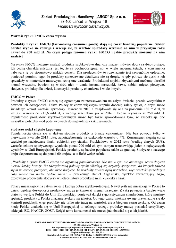 Zakład Produkcyjno - Handlowy „ARGO” Sp. z o. o. 37-100 Łańcut ul. Wiejska 16 Producent wyrobów cukierniczych. Wartość rynku FMCG coraz wyższa Produkty z rynku FMCG (fast-moving consumer goods) stają się coraz bardziej popularne. Sektor bardzo szybko się rozwija i szacuje się, ze wartość sprzedaży wzrośnie na nim w przyszłym roku nawet do 250 mld zł. Na czym polega fenomen rynku FMCG i jakie produkty możemy na nim znaleźć? Na rynku FMCG możemy znaleźć produkty szybko-zbywalne, czy inaczej mówiąc dobra szybko-rotujące. Ich cechą charakterystyczną jest to, że są ogólnodostępne, np. w wielu supermarketach, a konsumenci nabywają je po stosunkowo niskich cenach. Dla producentów to rozwiązanie jest szczególnie opłacalne, ponieważ pomimo tego, że produkty sprzedawane detaliczne nie są drogie, to gdy policzy się zyski z ich sprzedaży w kontekście masowym, robią one wrażenie. Produktami szybko-zbywalnymi możemy określić niemal wszystko, bowiem są w śród nich – dania instant, mrożonki, kawa, nabiał, mięso, pieczywo, słodycze, produkty dla dzieci, kosmetyki, produkty chemiczne i wiele innych. FMCG w Polsce Produkty z rynku FMCG cieszą się ogromnym zainteresowaniem na całym świecie, przede wszystkim z powodu ich dostępności. Także Polacy w coraz większym stopniu docenią zalety rynku, o czym może świadczyć wzrost wartości sprzedaży. Jeszcze w 2010 r. znajdowała się ona na poziomie 180 mld zł, w 2013 r. wzrosła do 211,6 mld zł, a według szacunków już w 2016 r. będzie wynosiła aż 250 mld zł. Popularność produktów szybko-zbywalnych może być także spowodowana tym, że zaspokajają one wszystkie potrzeby – od podstawowych do najbardziej ekskluzywnych. Słodycze wciąż chętnie kupowane Popularnością cieszą się w dużym stopniu produkty z branży cukierniczej. Nie bez powodu tylko w pierwszym kwartale 2015 roku, zapotrzebowanie na czekoladę wzrosło o 4%. Konsumenci sięgają coraz częściej po nadziewane lizaki, cukierki, czy ciastka. Przykładowo w 2012 roku (według danych GUS), wartość sektora spożywczego wyniosła ponad 200 mld zł, tym samym ustanawiając jeden z najwyższych wyników w Unii Europejskiej. Polskie produkty są bardzo popularne także za granicą. Słodycze z naszego kraju eksportowane są do ponad 60 krajów, a ta ilość wciąż rośnie. „Produkty z rynku FMCG cieszą się ogromną popularnością. Nie ma w tym nic dziwnego, skoro dotyczą niemal każdej branży. Na zdecydowaną połowę rynku składają się artykuły spożywcze, do których zalicza się m.in. owoce, pieczywo, ale także słodycze. Te produkty zawsze będą potrzebne, więc wartość sprzedaży z całą pewnością nadal będzie rosła” – przekonuje Daniel Argasiński, dyrektor zarządzający Argo, czołowego producenta słodyczy w Polsce, który produkuje m.in. cukierki i lizaki. Polacy mieszkający na całym świecie kupują dobra szybko-rotacyjne. Nawet jeśli nie mieszkają w Polsce to dzięki ogólnej dostępności produktów mogą je kupować niemal wszędzie. Z całą pewnością bardzo wiele ułatwiło wejście Polski do Unii Europejskiej, ponieważ dzięki rygorystycznym standardom, które musimy spełniać, produkty z Polski znacznie zyskały na jakości. Od tego czasu większą uwagę przywiązuje się do kontroli produkcji, więc produkty nie tylko nie tracą na wartości, ale z biegiem czasu zyskują. Od czasu kiedy Polska znalazła się w Unii Europejskiej to różnego rodzaju produkty muszą posiadać certyfikaty, takie jak ISO, HACCP, GOST. Dzięki temu konsumenci nie muszą już obawiać się o ich jakość. ZAKŁAD PRODUKCYJNO-HANDLOWY ARGO SPÓŁKA Z OGRANICZONĄ ODPOWIEDZIALNOŚCIĄ 37-100 Łańcut, ul. Wiejska 16 Sąd rejestrowy: Sąd Rejonowy w Rzeszowie XII Wydział Gospodarczy KRS KRS: 0000112490 NIP: 815-15-98-181 NIP UE: PL 815-15-98-181 REGON: 691535355 Kapitał zakładowy: 1 811 500,00 zł Kontakt: tel. (centrala) +48 (017) 247 00 40, fax + 48 (017) 247 00 42 www. argo.net.pl Rachunek bankowy: PL 80 1160 2202 0000 0000 6075 8030 Zakład Produkcyjno - Handlowy „ARGO” Sp. z o. o. 37-100 Łańcut ul. Wiejska 16 Producent wyrobów cukierniczych. „Certyfikaty pomagają konsumentom wybrać z szerokiej gamy produktów te o najwyżej jakości. Polskie słodycze są coraz bardziej popularne także za granicą, dlatego firmy przykładają do tego coraz większą wagę. Przykładem takiego certyfikatu jest także IFS (International Food Standard), który firma Argo otrzymała w 2007 roku” – dodaje dyrektor firmy, Daniel Argasiński. Klienci mają do wyboru szeroką gamę produktów z rynku FMCG, dlatego może się wydawać, że kiedy stoją przed półką w supermarkecie to ciężko zdecydować im się na konkretny produkt. Jednak dzięki temu mogą w większym stopniu zwrócić uwagę na skład danego produktu, który dzięki wzrostowi świadomości konsumenckiej staje się coraz ważniejszy. Eksport polskich produktów rośnie nie bez przyczyny - dzieje się tak, ponieważ nasze produkty mają coraz lepszą jakość. Nic dziwnego, że coraz więcej producentów ma ambicje eksportowe. Kontakt dla prasy: Korneliusz Smolik Kom. +48 510 796 217 Email. [email protected] ZAKŁAD PRODUKCYJNO-HANDLOWY ARGO SPÓŁKA Z OGRANICZONĄ ODPOWIEDZIALNOŚCIĄ 37-100 Łańcut, ul. Wiejska 16 Sąd rejestrowy: Sąd Rejonowy w Rzeszowie XII Wydział Gospodarczy KRS KRS: 0000112490 NIP: 815-15-98-181 NIP UE: PL 815-15-98-181 REGON: 691535355 Kapitał zakładowy: 1 811 500,00 zł Kontakt: tel. (centrala) +48 (017) 247 00 40, fax + 48 (017) 247 00 42 www. argo.net.pl Rachunek bankowy: PL 80 1160 2202 0000 0000 6075 8030