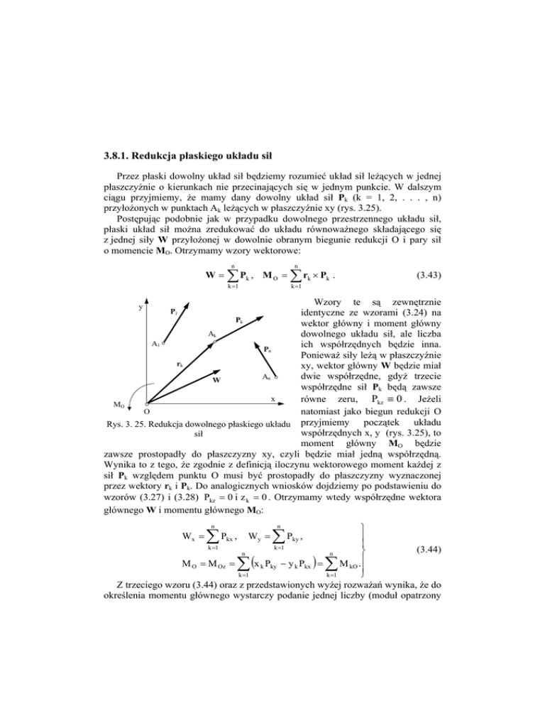 3.8.1. Redukcja płaskiego układu sił Przez płaski dowolny układ sił będziemy rozumieć układ sił leżących w jednej płaszczyźnie o kierunkach nie przecinających się w jednym punkcie. W dalszym ciągu przyjmiemy, że mamy dany dowolny układ sił Pk (k = 1, 2, . . . , n) przyłożonych w punktach Ak leżących w płaszczyźnie xy (rys. 3.25). Postępując podobnie jak w przypadku dowolnego przestrzennego układu sił, płaski układ sił można zredukować do układu równoważnego składającego się z jednej siły W przyłożonej w dowolnie obranym biegunie redukcji O i pary sił o momencie MO. Otrzymamy wzory wektorowe: W= n ∑ Pk , M O = k =1 n ∑r k× Pk . (3.43) k =1 Wzory te są zewnętrznie identyczne ze wzorami (3.24) na Pk wektor główny i moment główny Ak dowolnego układu sił, ale liczba A1 ich współrzędnych będzie inna. Pn Ponieważ siły leżą w płaszczyźnie rk xy, wektor główny W będzie miał An dwie współrzędne, gdyż trzecie W współrzędne sił Pk będą zawsze x równe zeru, Pkz ≡ 0 . Jeżeli MO O natomiast jako biegun redukcji O początek układu Rys. 3. 25. Redukcja dowolnego płaskiego układu przyjmiemy współrzędnych x, y (rys. 3.25), to sił moment główny MO będzie zawsze prostopadły do płaszczyzny xy, czyli będzie miał jedną współrzędną. Wynika to z tego, że zgodnie z definicją iloczynu wektorowego moment każdej z sił Pk względem punktu O musi być prostopadły do płaszczyzny wyznaczonej przez wektory rk i Pk. Do analogicznych wniosków dojdziemy po podstawieniu do wzorów (3.27) i (3.28) Pkz = 0 i z k = 0 . Otrzymamy wtedy współrzędne wektora głównego W i momentu głównego MO: y P1 ⎫ ⎪ ⎪ k =1 k =1 (3.44) ⎬ n n ⎪ M O = M Oz = x k Pky − y k Pkx = M kO . ⎪ k =1 k =1 ⎭ Z trzeciego wzoru (3.44) oraz z przedstawionych wyżej rozważań wynika, że do określenia momentu głównego wystarczy podanie jednej liczby (moduł opatrzony n Wx = ∑ n Pkx , Wy = ∑( ∑P ky , ) ∑ znakiem), czyli moment płaskiego układu sił można traktować podobnie jak skalar. W tej sytuacji mówiąc o momencie głównym w płaskim układzie sił, będziemy mieć na myśli tylko jego wartość algebraiczną. 3.8.2. Szczególne przypadki płaskiego układu sił Układ równoważny wypadkowej W punkcie 3.7.4 udowodniliśmy, że jeżeli moment główny MO jest prostopadły do wektora głównego W (3.42), to układ sił można zredukować do jednej siły wypadkowej działającej wzdłuż osi centralnej. W poprzednim punkcie wykazaliśmy, że warunek ten jest zawsze spełniony. Wynika z tego, że jeżeli wektor główny płaskiego układu sił jest różny od zera, W ≠ 0 , to układ ten można zastąpić wypadkową. W celu wyznaczenia linii działania wypadkowej załóżmy, że płaski układ sił Pk (k = 1, 2, . . . , n) został zredukowany do początku O układu współrzędnych x, y (rys. 3.26) do wektora głównego W i momentu głównego MO o wartości MO: W= n ∑ k =1 Pk , M O = n ∑M kO . (3.45) k =1 Moment MO można zastąpić parą sił –W i W przyłożonych odpowiednio w punktach O i A. W wyniku y takiego działania otrzymaliśmy W Wy dwie siły –W i W przyłożone w punkcie O oraz jedną siłę W A przyłożoną w punkcie A i Wx działającą wzdłuż prostej l. Siły α MO O –W i W przyłożone w punkcie O tworzą układ zerowy, zatem x l układ sił został sprowadzony do jednej siły W przyłożonej w punkcie A. Siłę tę, działającą Rys. 3.26. Redukcja płaskiego układu sił do wzdłuż prostej l, nazywamy wypadkowej wypadkową płaskiego układu sił. Po uwzględnieniu, że moment wypadkowej W względem dowolnego punktu jest równy sumie momentów wszystkich sił względem tego samego punktu, oraz oznaczeniu współrzędnych punktu A przyłożenia wypadkowej W przez x i y, otrzymamy na podstawie trzeciego wzoru (3.44) zależność na moment wypadkowej względem początku O układu współrzędnych: M O = xWy − yWx . Występujące w tym wzorze wielkości Wx, Wy i MO są wielkościami znanymi, określonymi wzorami (3.44), przeto jest to równanie prostej l, wzdłuż której działa wypadkowa W. Równanie to przedstawimy w postaci kierunkowej: Wy MO . Wx (3.46) W = Wx2 + Wy2 , (3.47) y= Wx x− Moduł wypadkowej a kąt D, jaki wypadkowa tworzy z osią x, określa wzór: tgα = Wy Wx . (3.48) Gdy wektor główny jest różny od zera, W ≠ 0 , a moment główny jest równy zeru, M O = 0 , układ sił redukuje się do wypadkowej przechodzącej przez biegun redukcji. Na zakończenie omówienia wyznaczania wypadkowej zauważmy istotną różnicę między wektorem głównym i wypadkową. Zarówno wektor główny, jak i wypadkowa są równe sumie geometrycznej wszystkich sił, ale wektor główny jest wektorem swobodnym, a wypadkowa jest siłą o ściśle określonej linii działania. Układ równoważny parze sił Jeżeli wektor główny płaskiego układu sił jest równy zeru, W = 0 , a moment główny jest różny od zera, M O ≠ 0 , to taki układ sił można zastąpić jedną parą sił o momencie równym sumie momentów wszystkich sił względem dowolnego punktu O: MO = n ∑M kO . (3.49) k =1 Ponieważ parę sił można dowolnie przesuwać w jej płaszczyźnie działania (p. 3.6), wartość momentu głównego M O nie będzie zależna od położenia bieguna redukcji O na płaszczyźnie działania sił. Układ równoważny zeru Jeżeli wektor główny i moment główny są równocześnie równe zeru, czyli W = 0 i M O = 0 , to układ sił jest w równowadze. Przypadek ten będzie rozpatrzony w następnym punkcie. Przykład 3.3. Na płytę w kształcie kwadratu o boku a = 1 m działają cztery siły: P1 = 100 N, P2 = 150 N, P3 = 200 N, P4 = 250 N (rys. 3.27), przy czym D = 30 o , E = 45o . Obliczyć wartość liczbową wypadkowej oraz linię jej działania. Rozwiązanie. Współrzędne wektora głównego obliczymy z pierwszych dwóch wzorów (3.44): 4 ⎫ Wx = ∑ Pkx = − P1 + P2 cos