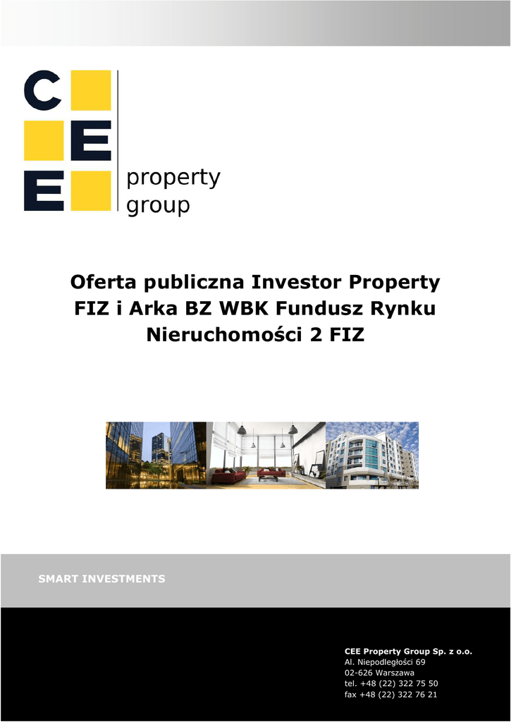 Oferta publiczna Investor Property FIZ i Arka BZ WBK Fundusz Rynku Nieruchomości 2 FIZ SMART INVESTMENTS CEE Property Group Sp. z o.o. Al. Niepodległości 69 02-626 Warszawa tel. +48 (22) 322 75 50 fax +48 (22) 322 76 21 Oferta funduszy inwestycyjnych lokujących kapitał na rynku nieruchomości jest coraz szersza. Bessa na światowych giełdach pokazała jak silnie skorelowane z rynkiem kapitałowym są fundusze akcyjne, jednocześnie zwiększyła atrakcyjność funduszy nieruchomości. Aktualnie trwa subskrypcja certyfikatów dwóch funduszy nieruchomości, Investor Property FIZ oraz Arka BZ WBK Fundusz Rynku Nieruchomości 2 FIZ. Fundusz Investor Property FIZ jest wspólną inicjatywą TFI Investors oraz firmy doradczoinwestycyjnej CEE Property Group. Strategia inwestycyjna zakłada lokowanie środków w nieruchomościach gruntowych jak i w projektach deweloperskich. W kręgu zainteresowań funduszu będą inwestycje, które mają potencjał rocznego zwrotu na poziomie minimum 20%. Aktualnie fundusz Investor Property FIZ ma zidentyfikowane projekty na 100 mln złotych, które spełniają założenia polityki inwestycyjnej. Obecnie największy potencjał inwestycyjny mają wielkoobszarowe inwestycje gruntowe zlokalizowane w niewielkiej odległości od dużych miast. Atrakcyjne są również grunty znajdujące się w prestiżowych miejscowościach otaczających największe aglomeracje. Niektórzy właściciele dużych działek (powyżej 5 ha) decydują się na sprzedaż swojej nieruchomości nawet z 50% dyskontem w stosunku do cen transakcyjnych małych działek (poniżej 2 tys. metrów). Tak duże dysproporcje cen wiążą się z faktem znaczącego spadku popytu na duże nieruchomości gruntowe spowodowanego drastycznym ograniczeniem przez banki kredytowania zakupu gruntu. Podział działki na mniejsze a następnie ich sprzedaż powinna umożliwić podwojenie zainwestowanych środków w terminie krótszym niż 3 lata. SMART INVESTMENTS CEE Property Group Sp. z o.o. Al. Niepodległości 69 02-626 Warszawa tel. +48 (22) 322 75 50 fax +48 (22) 322 76 21 Koniunktura w budownictwie (Polska) 40 1997-2003 2003-2009 2009-2016 30 20 10 0 -10 -20 2016 2015 2014 2013 2012 2011 2010 2009 2008 2007 2006 2005 2004 2003 2002 2001 2000 1999 1998 -30 Źródło: GUS Opracowanie: CEE Property Group Rynek nieruchomości rozpoczyna kolejny cykl koniunkturalny, faza ożywienia to najlepszy moment do inwestowania, nie tylko ze względu na relatywnie niskie ceny nieruchomości, na korzyść funduszu działa również ograniczenie przez banki finansowania projektów deweloperskich i zakupu gruntów -mówi dr Paweł Grząbka, prezes CEE Property Group. Emisja certyfikatów funduszu Investor Property FIZ trwać będzie do 30 czerwca br. Wartość jednego certyfikatu to 1000 złotych, minimalna wielkość zapisu to jeden certyfikat, nie ma górnego ograniczenia. Fundusz tworzony jest na czas oznaczony (7 lat), wcześniej, po 3 latach możliwe będzie umorzenie do 20% wszystkich certyfikatów inwestycyjnych. Towarzystwo złoży wniosek o możliwość obrotu certyfikatami na GPW aby można było obracać certyfikatami na rynku publicznym SMART INVESTMENTS CEE Property Group Sp. z o.o. Al. Niepodległości 69 02-626 Warszawa tel. +48 (22) 322 75 50 fax +48 (22) 322 76 21 BZ WBK AIB TFI planuje drugą subskrypcję ze względu na korzystny okres do inwestowania w nieruchomości, głównie nieruchomości komercyjne (biurowce i galerie handlowe). Spowolnienie, z jakim mieliśmy do czynienia w 2008 i częściowo w 2009 roku przyczyniło się do tego, że ceny nieruchomości stały się atrakcyjne i chcemy ten okres wykorzystać – mówi Agnieszka Jachowicz zarządzająca funduszami nieruchomości Arka - Tym bardziej, że nie potrwa on długo, ponieważ wiele danych z rynku wskazuje na to, że rynek nieruchomości przebudza się, co oczywiście także jest korzystne, bo stwarza potencjał do wzrostów. Arka BZ WBK Fundusz Rynku Nieruchomości 2 FIZ został utworzony w maju 2008 roku i mimo, iż okres inwestycyjny funduszu może trwać trzy lata, fundusz zainwestował już około 71% aktywów z 209 mln zł zebranych w czasie pierwszej emisji certyfikatów inwestycyjnych. Obecnie w portfelu, który kontroluje fundusz, znajduje się sześć nieruchomości o łącznej wartości ok. 230 mln zł Certyfikaty inwestycyjne funduszu będą sprzedawane w trzech transzach: transzy dla inwestorów indywidualnych, transzy dla inwestorów instytucjonalnych oraz transzy specjalnej, skierowanej do wybranych inwestorów instytucjonalnych. Minimalny zapis indywidualnego inwestora na certyfikaty wyniesie 50 sztuk, co przy aktualnej wycenie certyfikatów – 106,26 zł za 1 certyfikat, daje łączną minimalną kwotę inwestycji ok. 5,3 tys. zł (według wyceny z 30.04.2010). Zapisy na certyfikaty inwestycyjne będą przyjmowane do 25 czerwca br. Towarzystwo może wyemitować nawet do ponad 4,3 mln papierów wartościowych tego funduszu. SMART INVESTMENTS CEE Property Group Sp. z o.o. Al. Niepodległości 69 02-626 Warszawa tel. +48 (22) 322 75 50 fax +48 (22) 322 76 21 Porównanie oferty funduszy nieruchomości (Investor Property FIZ, Arka BZ WBK Fundusz Rynku Nieruchomości 2 FIZ) Arka BZ WBK Investor Property FIZ Fundusz Rynku Nieruchomości 2 FIZ Zakup gruntów i ich przekształcenie, Zakup nieruchomości komercyjnych na Budowa nowych mieszkań wynajem Co najmniej 20% rocznie Kilka, kilkanaście procent rocznie (zapisane w prospekcie) (6,59% w ostatnim roku) Czas trwania funduszu 7 lat 7 lat Wielkość funduszu Maksymalnie 400 mln zł 209,8 mln zł z pierwszej emisji Tempo wzrostu wartości Szybkie Umiarkowane Zarządzający Investors TFI Arka BZ WBK AIB TFI Terminy subskrypcji 7-30 czerwca 7-21 czerwca Minimalna kwota inwestycji 1 tys. zł ok. 5,3 tys. zł Opłata za wydanie certyfikatów 0-1,5% 0,01-3 zł za certyfikat Polityka inwestycyjna Oczekiwany dochód Wynagrodzenie za zarządzanie 3% Wynagrodzenie za wyniki 20% zysku (pobiera
