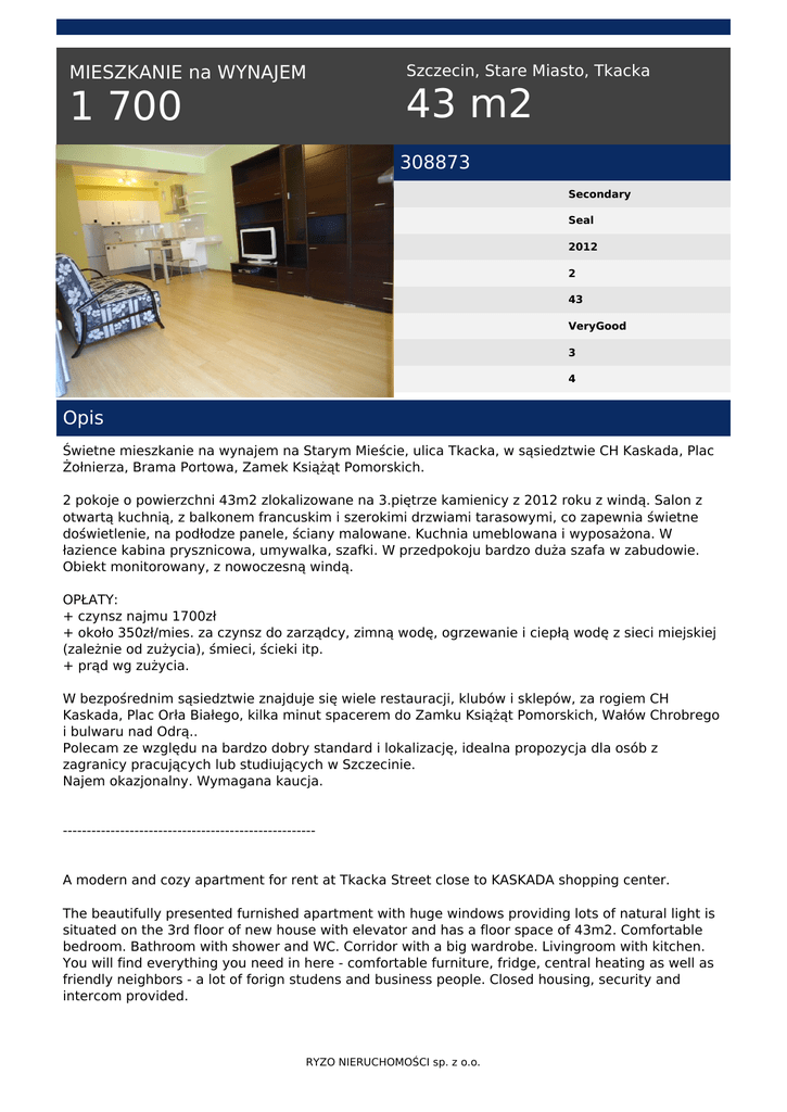 MIESZKANIE na WYNAJEM 1 700 Szczecin, Stare Miasto, Tkacka 43 m2 308873 Secondary Seal 2012 2 43 VeryGood 3 4 Opis Świetne mieszkanie na wynajem na Starym Mieście, ulica Tkacka, w sąsiedztwie CH Kaskada, Plac Żołnierza, Brama Portowa, Zamek Książąt Pomorskich. 2 pokoje o powierzchni 43m2 zlokalizowane na 3.piętrze kamienicy z 2012 roku z windą. Salon z otwartą kuchnią, z balkonem francuskim i szerokimi drzwiami tarasowymi, co zapewnia świetne doświetlenie, na podłodze panele, ściany malowane. Kuchnia umeblowana i wyposażona. W łazience kabina prysznicowa, umywalka, szafki. W przedpokoju bardzo duża szafa w zabudowie. Obiekt monitorowany, z nowoczesną windą. OPŁATY: + czynsz najmu 1700zł + około 350zł/mies. za czynsz do zarządcy, zimną wodę, ogrzewanie i ciepłą wodę z sieci miejskiej (zależnie od zużycia), śmieci, ścieki itp. + prąd wg zużycia. W bezpośrednim sąsiedztwie znajduje się wiele restauracji, klubów i sklepów, za rogiem CH Kaskada, Plac Orła Białego, kilka minut spacerem do Zamku Książąt Pomorskich, Wałów Chrobrego i bulwaru nad Odrą.. Polecam ze względu na bardzo dobry standard i lokalizację, idealna propozycja dla osób z zagranicy pracujących lub studiujących w Szczecinie. Najem okazjonalny. Wymagana kaucja. ----------------------------------------------------- A modern and cozy apartment for rent at Tkacka Street close to KASKADA shopping center. The beautifully presented furnished apartment with huge windows providing lots of natural light is situated on the 3rd floor of new house with elevator and has a floor space of 43m2. Comfortable bedroom. Bathroom with shower and WC. Corridor with a big wardrobe. Livingroom with kitchen. You will find everything you need in here - comfortable furniture, fridge, central heating as well as friendly neighbors - a lot of forign studens and business people. Closed housing, security and intercom provided. RYZO NIERUCHOMOŚCI sp. z o.o. This property is centrally located in Center - Old Town with great transport links. At the same street and right behind the corner you will find many restaurants, shops etc. FEES: rent 1700 PLN + administration cost arround 350 PLN (incl. cold and hot water, heating, garbage- and sewage disposal) + electricity. Guarantee deposit 3 months. RYZO NIERUCHOMOŚCI sp. z o.o. tel. 91 484 22 84 email: [email protected] RYZO NIERUCHOMOŚCI sp. z o.o. Powered by TCPDF (www.tcpdf.org)
