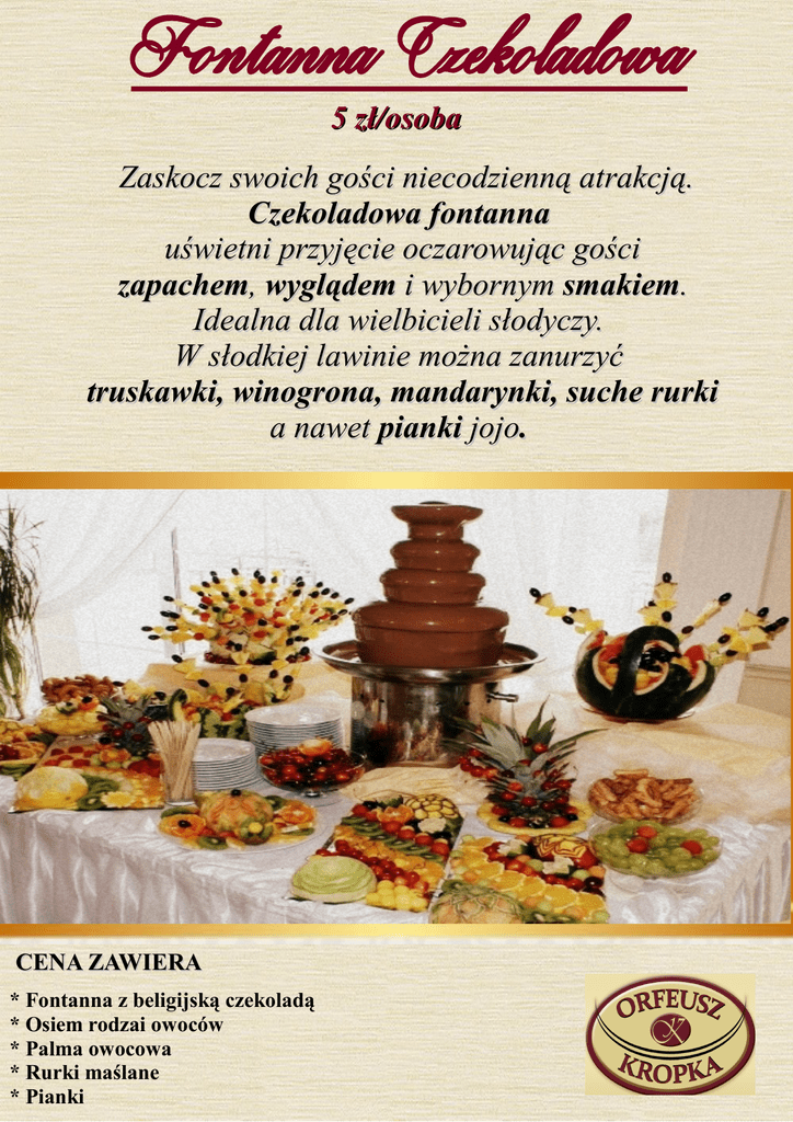 Fontanna Czekoladowa 5 zł/osoba Zaskocz swoich gości niecodzienną atrakcją. Czekoladowa fontanna uświetni przyjęcie oczarowując gości zapachem, wyglądem i wybornym smakiem. Idealna dla wielbicieli słodyczy. W słodkiej lawinie można zanurzyć truskawki, winogrona, mandarynki, suche rurki a nawet pianki jojo. CENA ZAWIERA * Fontanna z beligijską czekoladą * Osiem rodzai owoców * Palma owocowa * Rurki maślane * Pianki