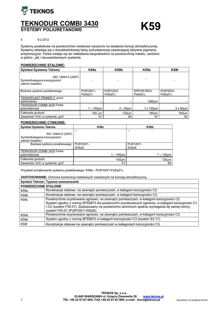 TEKNODUR COMBI 3430 K59 SYSTEMY POLIURETANOWE 5 9.2.2012 Systemy powłokowe na powierzchnie metalowe narażone na działanie korozji atmosferycznej. Systemy składają się z dwuskładnikowej farby poliuretanowej zawierającej aktywne pigmenty antykorozyjne. Farba nadaje się do nakładania bezpośrednio na powierzchnię metalu, zarówno w jedno-, jak i dwuwarstwowym systemie. POWIERZCHNIE STALOWE: Symbol Systemu Teknos K59a K59b - - ISO 12944-5 (2007) Symbol/kategoria korozyjności/ zakres trwałości Budowa systemu powłokowego: PUR100/1FeSa2½ K59e K59f - PUR120/2FeSa2½ - EPPUR160/2FeSa2½ PUR160/2FeSa2½ TEKNOPLAST PRIMER 3 grunt epoksydowy TEKNODUR COMBI 3430 Farba poliuretanowa -- -- 1x60µm -- 1 100µm 2 60µm 1 x 100µm 2 x 80µm Całkowita grubość 2 Zawartość VOC w systemie, g/m 100 m 57 120µm 69 160µm 97 160µm 92 POWIERZCHNIE CYNKOWE: Symbol Systemu Teknos K59c K59d -ISO 12944-5 (2007) Symbol/kategoria korozyjności/ zakres trwałości Budowa systemu powłokowego: PUR100/1ZnSaS TEKNODUR COMBI 3430 Farba poliuretanowa Całkowita grubość 2 Zawartość VOC w systemie, g/m -- PUR120/1ZnSaS 1 100µm 1 120µm 100µm 57 120m 69 Przykład oznakowania systemu powłokowego: K59a - PUR100/1-FeSa2½. ZASTOSOWANIE: Ochrona konstrukcji metalowych narażonych na korozję atmosferyczną. Symbol Teknos Typowe zastosowanie POWIERZCHNIE STALOWE Konstrukcje stalowe, na zewnątrz pomieszczeń, w kategorii korozyjności C2. K59a Konstrukcje stalowe, na zewnątrz pomieszczeń, w kategorii korozyjności C3. K59b Powierzchnie ocynkowane ogniowo, na zewnątrz pomieszczeń, w kategorii korozyjności C2. K59c K59d K59e K59f 1 System zgodny z normą SFS5873 dla powierzchni ocynkowanych ogniowo, w kategorii korozyjności C1 i C2 (system F30.01). Zastosowany na powierzchni aluminium spełnia wymagania tej samej normy, system F40.01 (PUR100/1-AlSaS). Powierzchnie ocynkowane ogniowo, na zewnątrz pomieszczeń, w kategorii korozyjności C3. System zgodny z normą SFS5873 w kategorii korozyjności C3 (system S3.17). Konstrukcje stalowe na zewnątrz pomieszczeń w kategoriach korozyjności C3. TEKNOS Sp. z o.o. 03-885 WARSZAWA ul. Księcia Ziemowita 59 www.teknos.pl TEL +48 22 67-87-004; FAX +48 22 67-87-995; e-mail: [email protected] ciąg dalszy na następnej stronie K59.5 Przygotowanie powierzchni Usunąć z podłoża wszelkie zanieczyszczenia, które mogą wpływać niekorzystnie na oczyszczanie powierzchni innymi metodami oraz na malowanie. Usunąć rozpuszczalne w wodzie sole stosując odpowiednie metody. Powierzchnie należy oczyszczać zależnie od rodzaju materiału podłoża: Powierzchnie stalowe: Usunąć zgorzelinę i rdzę przy pomocy obróbki strumieniowo-ściernej do uzyskania stopnia czystości Sa 2½ (ISO 8501-1). Zszorstkowanie powierzchni cienkiej blachy poprawia adhezję powłoki do podłoża. Powierzchnie ocynkowane: Konstrukcje stalowe pokryte ogniowo powłoką cynkową narażone na korozję atmosferyczną można malować po omieceniu ścierniwem (SaS) do uzyskania całkowicie matowej powierzchni. Odpowiednie środki czyszczące to np. tlenek aluminium, naturalny piasek i kwarc. Nie zaleca się malowania konstrukcji ze stali ocynkowanej, które mają być eksponowane w zanurzeniu. Zaleca się by nowe konstrukcje z cienkich blach ocynkowanych były lekko przepiaskowane (SaS). Powierzchnie eksponowane w warunkach atmosferycznych, które uległy zmatowieniu można oczyścić także środkiem myjącym PELTIPESU. Aluminium: Powierzchnię należy oczyścić środkiem myjącym PELTIPESU. Powierzchnie, które będą eksploatowane w warunkach atmosferycznych, tak jak powłoki cynkowe, powinny być także lekko omiecione ścierniwem (AlSaS) lub przepiaskowane. Miejsce i czas czyszczenia należy wybrać tak, by przygotowana powierzchnia nie uległa zabrudzeniu lub zawilgoceniu przed kolejnymi operacjami. Dodatkowe informacje na temat przygotowania powierzchni można znaleźć w normie ISO 12944-4 i ISO 8501-2. Grunt do czasowej ochrony Nakładanie Renowacja Systemy powłokowe mogą być nakładane na grunt do czasowej ochrony KORRO PVB – poliwinylobutyralowy lub KORRO E - epoksydowy. Przed użyciem wymieszać dokładnie składniki farby. Farbę nakładać na czyste i suche podłoże, równomierną warstwą o żądanej grubości. Dane techniczne farb podane są w poniższej tabeli i w kartach informacyjnych wyrobów. Zaprawki: Powierzchnie o stopniu skorodowania Ri 1 do Ri 3 mogą być malowane przez zaprawkowanie. Usunąć łuszczącą się farbę i rdzę z uszkodzonych obszarów przy użyciu skrobaków i obróbki strumieniowo-ściernej. W przypadku stosowania obróbki strumieniowo-ściernej należy unikać powstawania uszkodzeń sąsiadującej powłoki. Przygotowanie powierzchni rozszerzyć poza krawędzie uszkodzeń. Jeśli to konieczne należy sfazować krawędzie przygotowywanej powierzchni. Pokryć przygotowane podłoże powłoką zaprawkową systemu do właściwej grubości powłoki. Jeśli wymagany jest jednolity wygląd, cała powierzchnia powinna być zmatowiona, odpylona a następnie pokryta powłoką nawierzchniową wchodzącą w skład systemu. Całkowita naprawa: Powierzchnie o stopniu skorodowania Ri 4 powinny być całkowicie przemalowane. Należy przygotować powierzchnię za pomocą obróbki strumieniowo-ściernej do uzyskania stopnia czystości Sa 2½ i nakładać powłoki od gruntu do warstwy nawierzchniowej tak jak dla nowych wymalowań. 2 TEKNOS Sp. z o.o. 03-885 WARSZAWA ul. Księcia Ziemowita 59 www.teknos.pl TEL +48 22 67-87-004; FAX +48 22 67-87-995; e-mail: [email protected] ciąg dalszy na następnej stronie K59.5 Dane techniczne Farba Karta Informacyjna Rodzaj farby Kolory Wygląd powłoki Nr Rozcieńczalnik Metody nakładania Dysza do natrysku hydrodynamicznego Warunki nakładania - minimalna temperatura C - maksymalna wilg. względna % Oznakowanie bezpieczeństwa Zawartość substancji stałych, objętościowo % Całkowita masa substancji stałych g/l Zawartoś