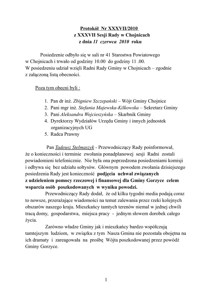 Protokół Nr XXXVII/2010 z XXXVII Sesji Rady w Chojnicach z dnia 11 czerwca 2010 roku Posiedzenie odbyło się w sali nr 41 Starostwa Powiatowego w Chojnicach i trwało od godziny 10.00 do godziny 11 .00. W posiedzeniu udział wzięli Radni Rady Gminy w Chojnicach – zgodnie z załączoną listą obecności. Poza tym obecni byli : 1. 2. 3. 4. Pan dr inż. Zbigniew Szczepański – Wójt Gminy Chojnice Pani mgr inż. Stefania Majewska-Kilkowska – Sekretarz Gminy Pani Aleksandra Wojcieszyńska – Skarbnik Gminy Dyrektorzy Wydziałów Urzędu Gminy i innych jednostek organizacyjnych UG 5. Radca Prawny Pan Tadeusz Stelmaszyk - Przewodniczący Rady poinformował, że o konieczności i terminie zwołania ponadplanowej sesji Radni zostali powiadomieni telefonicznie. Nie była ona poprzedzona posiedzeniami komisji i odbywa się bez udziału sołtysów. Głównym powodem zwołania dzisiejszego posiedzenia Rady jest konieczność podjęcia uchwał związanych z udzieleniem pomocy rzeczowej i finansowej dla Gminy Gorzyce celem wsparcia osób poszkodowanych w wyniku powodzi. Przewodniczący Rady dodał, że od kilku tygodni media podają coraz to nowsze, przerażające wiadomości na temat zalewania przez rzeki kolejnych obszarów naszego kraju. Mieszkańcy tamtych terenów niemal w jednej chwili tracą domy, gospodarstwa, miejsca pracy - jednym słowem dorobek całego życia. Zarówno władze Gminy jak i mieszkańcy bardzo współczują tamtejszym ludziom, w związku z tym Nasza Gmina nie pozostała obojętna na ich dramaty i zareagowała na prośbę Wójta poszkodowanej przez powódź Gminy Gorzyce. 1 Porządek obrad : 1. Sprawy porządkowe: a/ otwarcie sesji, stwierdzenie quorum, b/ ustalenie sekretarza sesji, c/ przyjęcie protokołu z poprzedniej sesji. 2. Interpelacje, wnioski i zapytania. 3. Podjęcie uchwały nr XXXVII/553/10 w sprawie udzielenia pomocy finansowej na rzecz Gminy Gorzyce celem wsparcia osób poszkodowanych w wyniku powodzi. 4. Podjęcie uchwały nr XXXVII/554/10 w sprawie udzielenia pomocy rzeczowej na rzecz Gminy Gorzyce celem wsparcia osób poszkodowanych w wyniku powodzi. 5. Podjęcie uchwały nr XXXVII/554/10 w sprawie zmian w budżecie gminy na 2010 rok 6. Podjęcie uchwały nr XXXVII/555/10 w sprawie zatwierdzenia rozszerzenia działalności i zmian w Statucie Samodzielnej, Publicznej, Przychodni Wiejskiej Gminy Chojnice. 7. Odpowiedzi na zapytania i interpelacje. 8. Sprawy bieżące. 9. Zakończenie obrad. Przebieg obrad : Ad 1/ Sprawy porządkowe: a/ otwarcie sesji, stwierdzenie quorum, Obrady XXXVI Sesji Rady Gminy w Chojnicach otworzył Pan Tadeusz Stelmaszyk. Prowadzący obrady powitał wszystkich zebranych, a następnie stwierdził, że w Sesji uczestniczy 15 Radnych, czyli 100% składu Rady podejmowania prawomocnych uchwał. b/ ustalenie sekretarza sesji, Sekretarzem sesji został Pan Wacław Górny – Zastępca Przewodniczącego Rady. c/ przyjęcie protokołu z poprzedniej sesji. Przewodniczący Rady Gminy zaproponował przyjąć protokół z poprzedniej sesji bez odczytania stwierdzając, ze był on wyłożony do wglądu w Biurze Rady i każdy z Radnych mógł się zapoznać z jego treścią. Rada Gminy w Chojnicach przyjęła protokół nr XXXVI/2010 z dnia 30 kwietnia 2010 roku - jednogłośnie- / 15 głosami „za” / Ad 2/ Interpelacje, wnioski i zapytania. Nie było. Ad 3/ Podjęcie uchwały nr XXXVII/553/10 w sprawie udzielenia pomocy finansowej na rzecz Gminy Gorzyce celem wsparcia osób poszkodowanych w wyniku powodzi. Wójt - poinformował, że udzielenie pomocy akurat Gminie Gorzyce zaproponował nam zaprzyjaźniony Wójt z tamtych terenów. Zwróciliśmy się do niego, żeby wskazał nam gminę, która jego zadaniem najbardziej ucierpiała podczas tegorocznej powodzi. Gmina Gorzyce leży w powiecie tarnobrzeskim w pobliżu Sandomierza. Pierwsza fala powodziowa zalała tam 80% terenów, niedawno przeszła druga fala. W ramach pomocy Powodzianom zakupiliśmy już i przekazaliśmy 26 gumo-spodni. (Wykupiliśmy wszystkie gumo-spodnie znajdujące się w pobliskich sklepach.) Zdajemy sobie sprawę, że jest to kropla w morzu potrzeb. Teraz chcemy przeznaczyć 25.000 złotych w gotowce i 20.000 złotych na pobyt dzieci w Ośrodku Harcerskim w Funce. Jest to wyraz naszego solidaryzmu gminnego z tymi zalanymi terenami. Dodatkowo pobyt dzieci w Funce będzie również finansowany przez Rząd z budżetu Państwa w ramach „Zielonych Szkół”. Pan Tadeusz Kujawski – wnioskował, aby przekazać na rzecz Powodzian 3 oprócz pomocy rzeczowej kwotę 50.000 złotych, a nie jak zawarto w projekcie uchwały 25.000. Uważał, że nie jest to, aż tak wygórowana kwota dla naszej gminy i można by zarówno przekazać więcej pieniędzy jak i przyjąć nasze dzieci. Wójt - wyjaśnił, że Gmina Chojnice przeznaczyła na ten cel najwięcej ze wszystkich ościennych samorządów. Proponował pozostawić zaproponowane kwoty, ponieważ na tym nasza pomoc się nie zakończy. Zamierzamy w późniejszym czasie przekazać poszkodowanym materiał siewny, pasze, ziemniaki dojdą do tego jeszcze koszty transportu. Przewodniczący Rady Gminy poddał pod głosowanie wniosek Pana Kujawskiego za zwiększeniem pomocy finansowej Powodzianom do 50.000 złotych. „za” wnioskiem głosowała 1 osoba „przeciw” głosowało 14 osób Następnie Radni głosowali nad całością projektu uchwały. Rada Gminy w Chojnicach podjęła uchwałę nr XXXVII/553/10 z dnia 11 czerwca 2010 roku 14 głosami „za” 1 głosem „przeciw” /Uchwała stanowi załącznik do niniejszego protokołu/. Ad 4/ Podjęcie uchwały nr XXXVII/554/10 w sprawie udzielenia pomocy rzeczowej na rzecz Gminy Gorzyce celem wsparcia osób poszkodowanych w wyniku powodzi. Projekt powyższej uchwały odczytał Pan Tadeusz Stelmaszyk. Rada Gminy w Chojnicach podjęła uchwałę nr XXXVII/554/10 z dnia 11 czerwca 2010 roku -jednogłośnie(15 głosami „za” ) /Uchwała stanowi załącznik do niniejszego protoko