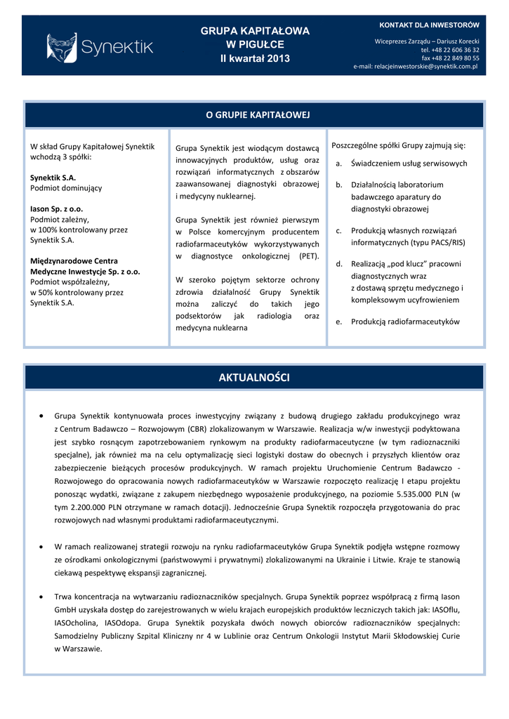 KONTAKT DLA INWESTORÓW GRUPA KAPITAŁOWA W PIGUŁCE II kwartał 2013 Wiceprezes Zarządu – Dariusz Korecki tel. +48 22 606 36 32 fax +48 22 849 80 55 e-mail: [email protected] O GRUPIE KAPITAŁOWEJ W skład Grupy Kapitałowej Synektik wchodzą 3 spółki: Synektik S.A. Podmiot dominujący Iason Sp. z o.o. Podmiot zależny, w 100% kontrolowany przez Synektik S.A. Międzynarodowe Centra Medyczne Inwestycje Sp. z o.o. Podmiot współzależny, w 50% kontrolowany przez Synektik S.A. Grupa Synektik jest wiodącym dostawcą innowacyjnych produktów, usług oraz rozwiązań informatycznych z obszarów zaawansowanej diagnostyki obrazowej i medycyny nuklearnej. Grupa Synektik jest również pierwszym w Polsce komercyjnym producentem radiofarmaceutyków wykorzystywanych w diagnostyce onkologicznej (PET). W szeroko pojętym sektorze ochrony zdrowia działalność Grupy Synektik można zaliczyć do takich jego podsektorów jak radiologia oraz medycyna nuklearna Poszczególne spółki Grupy zajmują się: a. Świadczeniem usług serwisowych b. Działalnością laboratorium badawczego aparatury do diagnostyki obrazowej c. Produkcją własnych rozwiązań informatycznych (typu PACS/RIS) d. Realizacją „pod klucz” pracowni diagnostycznych wraz z dostawą sprzętu medycznego i kompleksowym ucyfrowieniem e. Produkcją radiofarmaceutyków AKTUALNOŚCI Grupa Synektik kontynuowała proces inwestycyjny związany z budową drugiego zakładu produkcyjnego wraz z Centrum Badawczo – Rozwojowym (CBR) zlokalizowanym w Warszawie. Realizacja w/w inwestycji podyktowana jest szybko rosnącym zapotrzebowaniem rynkowym na produkty radiofarmaceutyczne (w tym radioznaczniki specjalne), jak również ma na celu optymalizację sieci logistyki dostaw do obecnych i przyszłych klientów oraz zabezpieczenie bieżących procesów produkcyjnych. W ramach projektu Uruchomienie Centrum Badawczo Rozwojowego do opracowania nowych radiofarmaceutyków w Warszawie rozpoczęto realizację I etapu projektu ponosząc wydatki, związane z zakupem niezbędnego wyposażenie produkcyjnego, na poziomie 5.535.000 PLN (w tym 2.200.000 PLN otrzymane w ramach dotacji). Jednocześnie Grupa Synektik rozpoczęła przygotowania do prac rozwojowych nad własnymi produktami radiofarmaceutycznymi. W ramach realizowanej strategii rozwoju na rynku radiofarmaceutyków Grupa Synektik podjęła wstępne rozmowy ze ośrodkami onkologicznymi (państwowymi i prywatnymi) zlokalizowanymi na Ukrainie i Litwie. Kraje te stanowią ciekawą pespektywę ekspansji zagranicznej. Trwa koncentracja na wytwarzaniu radioznaczników specjalnych. Grupa Synektik poprzez współpracą z firmą Iason GmbH uzyskała dostęp do zarejestrowanych w wielu krajach europejskich produktów leczniczych takich jak: IASOflu, IASOcholina, IASOdopa. Grupa Synektik pozyskała dwóch nowych obiorców radioznaczników specjalnych: Samodzielny Publiczny Szpital Kliniczny nr 4 w Lublinie oraz Centrum Onkologii Instytut Marii Skłodowskiej Curie w Warszawie. AKCJONARIAT DANE RYNKOWE Ticker NC Liczba akcji [szt.] * Kapitalizacja [mln.] Free Float 3M średni dzienny wolumen * Kurs PLN Zmiana 1R 1 R max / min PLN ** C/Z *** C / WK SNT 6 682 000 89,5 36% 323 13,40 3,1% 15,19 / 9,50 29,03 4,83 * dane wg. kursu zamknięcia na dzień 28.06.2013 ** dane wg. kursu zamknięcia na dzień 28.06.2013 oraz wyników za ostatnie 4 kwartały. *** dane wg. kursu zamknięcia na dzień 28.06.2013 oraz stanu wartości księgowej na dzień 28.06.2013 DANE FINANSOWE 35 000,00 Przychody netto ze sprzedaży (w tys.) 30 000,00 EBITDA (w tys.) 25 000,00 20 000,00 15 000,00 10 000,00 5 000,00 0,00 -5 000,00 IIkw 2011 IIIkw 2011 IVkw 2011 Ikw 2012 IIkw 2012 IIIkw 2012 IVkw 2012 Ikw 2013 IIkw 2013 Rachunek zysków i strat 2 kw 2011 3 kw 2011 4 kw 2011 1 kw 2012 2 kw 2012 3 kw 2012 4 kw 2012 1 kw 2013 2 kw 2013 2010 2011 2012 Przychody netto ze sprzedaży 13 144,2 9 022,6 19 234,9 6 945,8 9 204,7 16 424,0 28 887,2 11 899,3 10 469,3 31 026,6 45 077,2 61 451,5 EBITDA -313,2 -16,9 1 616,8 -1 308,8 65,9 480,9 3 881,4 1 337,3 1 709,7 2 927,5 627,7 3 108,8 EBIT -507,0 -250,3 1 253,4 -2 034,1 -670,8 -266,1 3 153,1 591,6 930,6 2 264,6 -369,4 171,7 Zysk/strata netto -559,1 -341,6 959,9 -1 944,4 -869,3 -645,8 2 844,3 280,0 606,3 1 063,7 -1 420,8 -644,9 Bilans 2 kw 2011 3 kw 2011 4 kw 2011 1 kw 2012 2 kw 2012 3 kw 2012 4 kw 2012 1 kw 2013 1 kw 2013 Suma bilansowa 39 969,4 33 045,4 50 466,2 42 942,9 38 880,7 45 190,7 61 563,6 51 596,4 46 499,2 Aktywa trwałe 20 277,7 21 061,8 24 297,1 22 628,4 22 661,4 24 001,9 23 653,5 23 752,5 28 044,0 Aktywa obrotowe 19 691,7 11 983,6 26 169,1 20 314,5 16 219,2 21 188,8 37 910,1 27 843,9 19 166,4 Aktywa pieniężne 2 923,8 22,0 16 669,7 10 510,9 4 282,3 3 430,6 13 480,0 7 196,3 673,8 Kapitał własny 5 935,3 5 573,2 18 320,4 16 370,6 15 501,3 14 854,9 17 669,5 17 949,5 18 555,8 1 094,7 9 078,0 10 875,4 10 688,2 9 606,2 8 879,4 8 054,5 7 610,7 6 850,8 0,0 7 770,3 7 770,3 7 770,3 6 956,5 6 490,4 5 913,4 5 494,2 4 966,6 32 939,4 18 394,1 13 913,2 14 953,4 12 871,2 11 848,8 32 958,6 22 956,0 16 637,1 808,4 4 906,1 1 720,8 1 304,3 1 897,5 2 428,4 2 499,3 2 141,8 3 218,5 -551,8 14 376,6 -4 754,8 814,6 6 656,4 7 373,8 -2 829,4 2 840,0 9 155,9 Zobowiązania długoterminowe w tym kredyty i pożyczki Zobowiązania krótkoterminowe w tym kredyty i pożyczki Dług netto