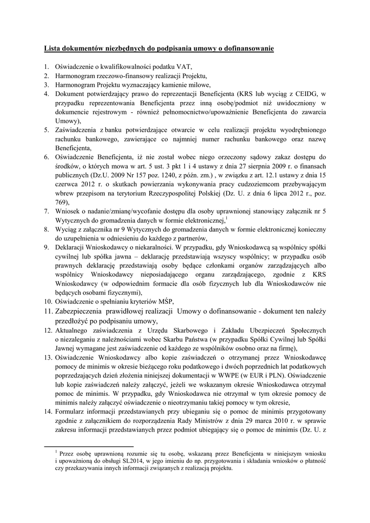 Lista dokumentów niezbędnych do podpisania umowy o dofinansowanie 1. 2. 3. 4. 5. 6. 7. 8. 9. 10. Oświadczenie o kwalifikowalności podatku VAT, Harmonogram rzeczowo-finansowy realizacji Projektu, Harmonogram Projektu wyznaczający kamienie milowe, Dokument potwierdzający prawo do reprezentacji Beneficjenta (KRS lub wyciąg z CEIDG, w przypadku reprezentowania Beneficjenta przez inną osobę/podmiot niż uwidoczniony w dokumencie rejestrowym - również pełnomocnictwo/upoważnienie Beneficjenta do zawarcia Umowy), Zaświadczenia z banku potwierdzające otwarcie w celu realizacji projektu wyodrębnionego rachunku bankowego, zawierające co najmniej numer rachunku bankowego oraz nazwę Beneficjenta, Oświadczenie Beneficjenta, iż nie został wobec niego orzeczony sądowy zakaz dostępu do środków, o których mowa w art. 5 ust. 3 pkt 1 i 4 ustawy z dnia 27 sierpnia 2009 r. o finansach publicznych (Dz.U. 2009 Nr 157 poz. 1240, z późn. zm.) , w związku z art. 12.1 ustawy z dnia 15 czerwca 2012 r. o skutkach powierzania wykonywania pracy cudzoziemcom przebywającym wbrew przepisom na terytorium Rzeczypospolitej Polskiej (Dz. U. z dnia 6 lipca 2012 r., poz. 769), Wniosek o nadanie/zmianę/wycofanie dostępu dla osoby uprawnionej stanowiący załącznik nr 5 Wytycznych do gromadzenia danych w formie elektronicznej,1 Wyciąg z załącznika nr 9 Wytycznych do gromadzenia danych w formie elektronicznej konieczny do uzupełnienia w odniesieniu do każdego z partnerów, Deklaracji Wnioskodawcy o niekaralności. W przypadku, gdy Wnioskodawcą są wspólnicy spółki cywilnej lub spółka jawna – deklarację przedstawiają wszyscy wspólnicy; w przypadku osób prawnych deklarację przedstawiają osoby będące członkami organów zarządzających albo wspólnicy Wnioskodawcy nieposiadającego organu zarządzającego, zgodnie z KRS Wnioskodawcy (w odpowiednim formacie dla osób fizycznych lub dla Wnioskodawców nie będących osobami fizycznymi), Oświadczenie o spełnianiu kryteriów MŚP, 11. Zabezpieczenia prawidłowej realizacji Umowy o dofinansowanie - dokument ten należy przedłożyć po podpisaniu umowy, 12. Aktualnego zaświadczenia z Urzędu Skarbowego i Zakładu Ubezpieczeń Społecznych o niezaleganiu z należnościami wobec Skarbu Państwa (w przypadku Spółki Cywilnej lub Spółki Jawnej wymagane jest zaświadczenie od każdego ze wspólników osobno oraz na firmę), 13. Oświadczenie Wnioskodawcy albo kopie zaświadczeń o otrzymanej przez Wnioskodawcę pomocy de minimis w okresie bieżącego roku podatkowego i dwóch poprzednich lat podatkowych poprzedzających dzień złożenia niniejszej dokumentacji w WWPE (w EUR i PLN). Oświadczenie lub kopie zaświadczeń należy załączyć, jeżeli we wskazanym okresie Wnioskodawca otrzymał pomoc de minimis. W przypadku, gdy Wnioskodawca nie otrzymał w tym okresie pomocy de minimis należy załączyć oświadczenie o nieotrzymaniu takiej pomocy w tym okresie, 14. Formularz informacji przedstawianych przy ubieganiu się o pomoc de minimis przygotowany zgodnie z załącznikiem do rozporządzenia Rady Ministrów z dnia 29 marca 2010 r. w sprawie zakresu informacji przedstawianych przez podmiot ubiegający się o pomoc de minimis (Dz. U. z 1 Przez osobę uprawnioną rozumie się tu osobę, wskazaną przez Beneficjenta w niniejszym wniosku i upoważnioną do obsługi SL2014, w jego imieniu do np. przygotowania i składania wniosków o płatność czy przekazywania innych informacji związanych z realizacją projektu. 2010 r. Nr 53 poz. 311 z późn. zm.) – formularz wymagany w przypadku, gdy Wnioskodawca w ramach projektu ubiega się o pomoc de minimis, 15. Inne dokumenty uznane przez IP niezbędne do podpisania Umowy o dofinansowanie (jeśli dotyczy).