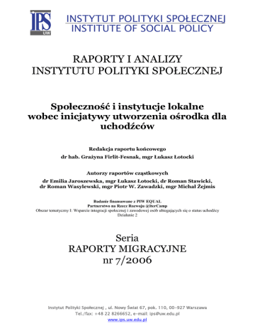RAPORTY I ANALIZY INSTYTUTU POLITYKI SPOŁECZNEJ Społeczność i instytucje lokalne wobec inicjatywy utworzenia ośrodka dla uchodźców Redakcja raportu końcowego dr hab. Grażyna Firlit-Fesnak, mgr Łukasz Łotocki Autorzy raportów cząstkowych dr Emilia Jaroszewska, mgr Łukasz Łotocki, dr Roman Stawicki, dr Roman Wasylewski, mgr Piotr W. Zawadzki, mgr Michał Żejmis Badanie finansowane z PIW EQUAL Partnerstwo na Rzecz Rozwoju @lterCamp Obszar tematyczny I: Wsparcie integracji społecznej i zawodowej osób ubiegających się o status uchodźcy Działanie 2 Seria RAPORTY MIGRACYJNE nr 7/2006 Instytut Polityki Społecznej , ul. Nowy Świat 67, pok. 110, 00-927 Warszawa Tel./fax: +48 22 8266652, e-mail: [email protected] www.ips.uw.edu.pl Społeczność i instytucje lokalne wobec inicjatywy utworzenia ośrodka dla uchodźców Raport końcowy z badań terenowych w Zgierzu – mieście, w którym planowano utworzenie wzorcowego ośrodka adaptacyjnego dla uchodźców Polskiego Czerwonego Krzyża w ramach projektu @lterCamp Badanie finansowane jest z PIW EQUAL Partnerstwo na Rzecz Rozwoju @lterCamp Obszar tematyczny I: Wsparcie integracji społecznej i zawodowej osób ubiegających się o status uchodźcy Działanie 2 Badanie przeprowadzono pod kierunkiem naukowym dr hab. Grażyny Firlit-Fesnak Redakcja raportu końcowego: dr hab. Grażyna Firlit-Fesnak, mgr Łukasz Łotocki Autorzy raportów cząstkowych, w oparciu o które opracowano raport końcowy: dr Emilia Jaroszewska, mgr Łukasz Łotocki, dr Roman Stawicki, dr Roman Wasylewski, mgr Piotr W. Zawadzki, mgr Michał Żejmis © Copyright by Instytut Polityki Społecznej UW Warszawa, grudzień 2006 1 Spis treści WSTĘP ........................................................................................................................................................... 3 CZĘŚĆ I MIEJSCE I METODOLOGIA BADAŃ ....................................................................................... 5 1.1. 1.2. 1.3. PRZEDMIOT, CEL I ZAŁOŻENIA BADAWCZE ....................................................................................... 6 CHARAKTERYSTYKA TERENU BADAŃ ................................................................................................ 8 METODY I NARZĘDZIA BADAWCZE .................................................................................................. 11 CZĘŚĆ II SPOŁECZNOŚĆ LOKALNA WOBEC INICJATYWY UTWORZENIA OŚRODKA DLA UCHODŹCÓW............................................................................................................................................. 13 2.1. 2.2. 2.3. SOCJO-DEMOGRAFICZNA CHARAKTERYSTYKA BADANYCH RESPONDENTÓW .................................. 14 ZGIERZ W OCZACH JEGO MIESZKAŃCÓW ........................................................................................ 15 KONFRONTACJA Z ZAMYSŁEM UTWORZENIA W ZGIERZU OŚRODKA DLA UCHODŹCÓW; „TAK” DLA POMOCY UCHODŹCOM , ALE DLACZEGO „MY”? .......................................................................................... 17 2.4. WIEDZA O UCHODŹCACH ................................................................................................................ 21 2.5. OBECNOŚĆ CUDZOZIEMCÓW W ZGIERZU........................................................................................ 22 2.6. POSTAWY WOBEC OSIEDLANIA SIĘ UCHODŹCÓW W POLSCE I POMOCY WOBEC NICH ZE STRONY PAŃSTWA .................................................................................................................................................... 24 2.7. POTENCJALNA GOTOWOŚĆ/BRAK GOTOWOŚCI BADANYCH DO AKCEPTACJI UCHODŹCÓW W ZGIERZU I WSPÓŁUDZIAŁU W PROGRAMIE INTEGRACJI ............................................................................. 25 2.8. WNIOSKI KOŃCOWE; TRUDNOŚCI ŻYCIA CODZIENNEGO JAKO CZYNNIK DEZINTEGRACJI SPOŁECZNOŚCI LOKALNEJ I OBOJĘTNOŚCI WOBEC UCHODŹCÓW ............................................................... 28 CZĘŚĆ III INSTYTUCJE LOKALNE WOBEC INICJATYWY UTWORZENIA OŚRODKA DLA UCHODŹCÓW............................................................................................................................................. 32 3.1. 3.2. 3.3. 3.4. 3.5. 3.6. 3.7. 3.8. 3.9. 3.10. 3.11. 3.12. 3.13. OŚRODEK SZKOLENIOWY POLSKIEGO CZERWONEGO KRZYŻA...................................................... 34 URZĄD MIASTA ............................................................................................................................... 39 STAROSTWO POWIATOWE ............................................................................................................... 42 POWIATOWE CENTRUM POMOCY RODZINIE .................................................................................. 44 MIEJSKI OŚRODEK POMOCY SPOŁECZNEJ ..................................................................................... 45 POWIATOWY URZĄD PRACY ........................................................................................................... 52 SZKOŁA PODSTAWOWA ................................................................................................................... 56 POWIATOWY ZESPÓŁ OPIEKI ZDROWOTNEJ .................................................................................. 61 KOMENDA POWIATOWA POLICJI .................................................................................................... 67 KOMENDA STRAŻY MIEJSKIEJ .................................................................................................... 70 MIEJSKI DOM KULTURY ............................................................................................................. 92 LOKALNA G AZETA ...................................................................................................................... 99 WNIOSKI KOŃCOWE ........................................................................................................