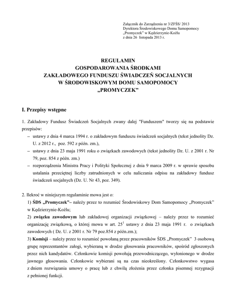 Załącznik do Zarządzenia nr 3/ZFŚS/ 2013 Dyrektora Środowiskowego Domu Samopomocy „Promyczek” w Kędzierzynie-Koźlu z dnia 26 listopada 2013 r. REGULAMIN GOSPODAROWANIA ŚRODKAMI ZAKŁADOWEGO FUNDUSZU ŚWIADCZEŃ SOCJALNYCH W ŚRODOWISKOWYM DOMU SAMOPOMOCY „PROMYCZEK” I. Przepisy wstępne 1. Zakładowy Fundusz Świadczeń Socjalnych zwany dalej "Funduszem" tworzy się na podstawie przepisów: ustawy z dnia 4 marca 1994 r. o zakładowym funduszu świadczeń socjalnych (tekst jednolity Dz. U. z 2012 r., poz. 592 z późn. zm.), ustawy z dnia 23 maja 1991 roku o związkach zawodowych (tekst jednolity Dz. U. z 2001 r. Nr 79, poz. 854 z późn. zm.) rozporządzenia Ministra Pracy i Polityki Społecznej z dnia 9 marca 2009 r. w sprawie sposobu ustalania przeciętnej liczby zatrudnionych w celu naliczania odpisu na zakładowy fundusz świadczeń socjalnych (Dz. U. Nr 43, poz. 349). 2. Ilekroć w niniejszym regulaminie mowa jest o: 1) ŚDS „Promyczek”– należy przez to rozumieć Środowiskowy Dom Samopomocy „Promyczek” w Kędzierzynie-Koźlu; 2) związku zawodowym lub zakładowej organizacji związkowej – należy przez to rozumieć organizację związkową, o której mowa w art. 251 ustawy z dnia 23 maja 1991 r. o związkach zawodowych ( Dz. U. z 2001 r. Nr 79 poz.854 z późn.zm.); 3) Komisji – należy przez to rozumieć powołaną przez pracowników ŚDS „Promyczek” 3 osobową grupę reprezentantów załogi, wybieraną w drodze głosowania pracowników, spośród zgłoszonych przez nich kandydatów. Członkowie komisji powołują przewodniczącego, wyłonionego w drodze jawnego głosowania. Członkowie wybierani są na czas nieokreślony. Członkowstwo wygasa z dniem rozwiązania umowy o pracę lub z chwilą złożenia przez członka pisemnej rezygnacji z pełnionej funkcji. Do zadań komisji należy: zgłaszanie nowych rozwiązań opartych na potrzebach pracowników, zwoływanie przez pracodawcę lub na wniosek każdego z członków komisji spotkań komisji, jednak nie rzadziej niż raz na kwartał, sporządzanie kwartalnych sprawozdań z wydatkowania środków ZFŚS oraz przedstawianie go Dyrektorowi ŚDS „Promyczek”, za pośrednictwem księgowego, celem zatwierdzenia, weryfikowanie poprawności składanych przez pracowników wniosków pod względem formalnym, opiniowanie wniosków w oparciu o Regulamin ZFŚS i zgłaszanie pracodawcy propozycji odrzucenia bądź przyznania świadczenia ze środków socjalnych, co jest odnotowywane na wniosku osoby ubiegającej się o świadczenie, przygotowywanie protokołu ze spotkań komisji, informowanie pracowników o decyzjach dotyczących złożonych przez nich wniosków. 4) dochodzie – należy przez to rozumieć wszelkie przychody brutto po odliczeniu kosztów ich uzyskania oraz po odliczeniu składek na ubezpieczenie społeczne, 5) dochodzie na jedną osobę uprawnioną – należy przez to rozumieć średni miesięczny dochód przypadający na 1 członka rodziny osoby uprawnionej osiągnięty w roku kalendarzowym poprzedzającym rok złożenia wniosku o przyznanie świadczenia z Funduszu. 6) osobie uprawnionej – należy przez to rozumieć: a) pracownika zatrudnionego w ŚDS „Promyczek” w Kędzierzynie-Koźlu na podstawie umowy o pracę; b) emeryta i rencistę – byłego pracownika ŚDS „Promyczek” w Kędzierzynie-Koźlu oraz członka jego rodziny, c) członka rodziny pracownika ŚDS „Promyczek”, w tym pozostające na utrzymaniu pracownika: - dziecko własne, - dziecko przysposobione oraz przyjęte na wychowanie w ramach rodziny zastępczej, - dziecko współmałżonka, - pozostający mocą orzeczenia sądu na utrzymaniu pracownika wnuk i rodzeństwo w wieku do 18 lat, - współmałżonka, w tym również pracującego, 7) dziecku – należy przez to rozumieć pozostającą na utrzymaniu i wychowaniu pracownika osobę, która: a) nie ukończyła 18 lat i nie zawarła związku małżeńskiego, 2 b) ukończyła 18 lat i która nie zawarła związku małżeńskiego oraz: - jest niepełnosprawna w stopniu znacznym lub umiarkowanym - bez względu na wiek, lub - nie pozostaje w stosunku pracy, kontynuuje naukę i nie ukończyła 26 lat. 3. Fundusz tworzy się z corocznego odpisu podstawowego (art. 5 ust. 2 Ustawy), naliczonego w stosunku do przeciętnej liczby zatrudnionych, obciążającego koszty działalności jednostki. 4. Wysokość odpisu podstawowego zwiększa się o 6,25 % przeciętnego wynagrodzenia miesięcznego, o którym mowa w art. 5 ust. 2 Ustawy, na każdą zatrudnioną osobę stosunku do której orzeczono znaczny lub umiarkowany stopień niepełnosprawności. 5. Fundusz zwiększa się o 6,25 % przeciętnego wynagrodzenia miesięcznego, o którym mowa w art. 5 ust. 2 Ustawy na każdego emeryta i rencistę objętego przez ŚDS „Promyczek” opieką socjalną. II. Zasady gospodarowania środkami Socjalnych. Zakładowego Funduszu Świadczeń 1. Podstawą gospodarowania środkami funduszu jest roczny plan dochodów i wydatków, sporządzony zgodnie z załącznikiem nr 1 do regulaminu. 2. Projekt rocznego planu dochodów i wydatków funduszu sporządza księgowy ŚDS „Promyczek:”, który zatwierdza Dyrektor jednostki. 3. Środki Funduszu mogą być zwiększone poprzez : a) darowizny oraz zapisy osób fizycznych oraz prawnych, b) odsetki z oprocentowania pożyczek udzielonych na cele mieszkaniowe, c) inne środki określone w odrębnych przepisach. 4. Środki nie wykorzystane w danym roku kalendarzowym przechodzą na rok następny. 5. Środki Funduszu są gromadzone na odrębnym rachunku bankowym. 6. Środki Funduszu na poszczególne formy pomocy socjalnej są przyznawane w formie pieniężnej. 3 III. Przeznaczenie Zakładowego Funduszu Świadczeń Socjalnych. 1. Środki Funduszu przeznacza się na finansowanie działalności socjalnej organizowanej na rzecz osób uprawnionych do korzystania z Funduszu w tym : a) zapomogi bezzwrotne pieniężne osobom znajdującym się w szczególnie trudn