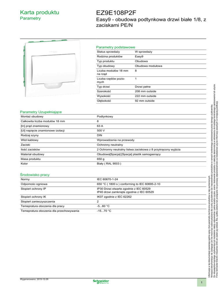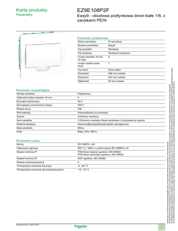Karta produktu Parametry EZ9E108P2F Easy9 - obudowa podtynkowa drzwi białe 1/8, z zaciskami PE/N Status sprzedaży W sprzedaży Rodzina produktów Easy9 Typ produktu Obudowa Typ obudowy Obudowa modułowa Liczba modułów 18 mm na rząd 8 Liczba rzędów poziomych 1 Typ drzwi Drzwi pełne Szerokość 208 mm outside Wysokość 222 mm outside Głębokość 92 mm outside Informacje w tej dokumentacji zawierają ogólne opisy i/lub parametry techniczne produktów w niej wymienionych. Niniejsza dokumentacja nie zastępuje ani nie może być wykorzystywana dla oceny przydatności lub niezawodności produktów w ramach konkretnego zastosowania przez danego użytkownika. Do obowiązków każdego użytkownika lub instalatora należy odpowiednia i pełna analiza ryzyka, ocena i testowanie produktu z należytą starannością w odniesieniu do każdego konkretnego zastosowania lub użycia. Firma Schneider Electric Industries SAS ani żaden jej oddział, filia, spółka zależna lub powiązana nie ponoszą odpowiedzialności za niewłaściwe użycie informacji zawartych w niniejszej publikacji. Parametry podstawowe Parametry Uzupełniające Montaż obudowy Podtynkowy Całkowita liczba modułów 18 mm 8 [In] prąd znamionowy 63 A [Ui] napięcie znamionowe izolacji 500 V Rodzaj szyny DIN Wlot kablowy Wprowadzenia na przewody Zaciski Ochronny neutralny Ilość zacisków 2 Ochronny neutralny listwa zaciskowa z 8 przykręcony wyjścia Materiał obudowy Obudowa[Spacja]:[Spacja] plastik samogasnący Masa produktu 650 g Kolor Biały ( RAL 9003 ) Środowisko pracy Normy IEC 60670-1-24 Odpornośc ogniowa 650 °C ( 1800 s ) conforming to IEC 60695-2-10 Stopień ochrony IP IP30 Drzwi otwarte zgodnie z IEC 60529 IP40 drzwi zamknięte zgodnie z IEC 60529 Stopień ochrony IK IK07 zgodnie z IEC 62262 Stopień zanieczyszczenia 2 Temepratura otoczenia dla pracy -5...60 °C Temepratura otoczenia dla przechowywania -15...70 °C Wygenerowano: 2015-12-29 1