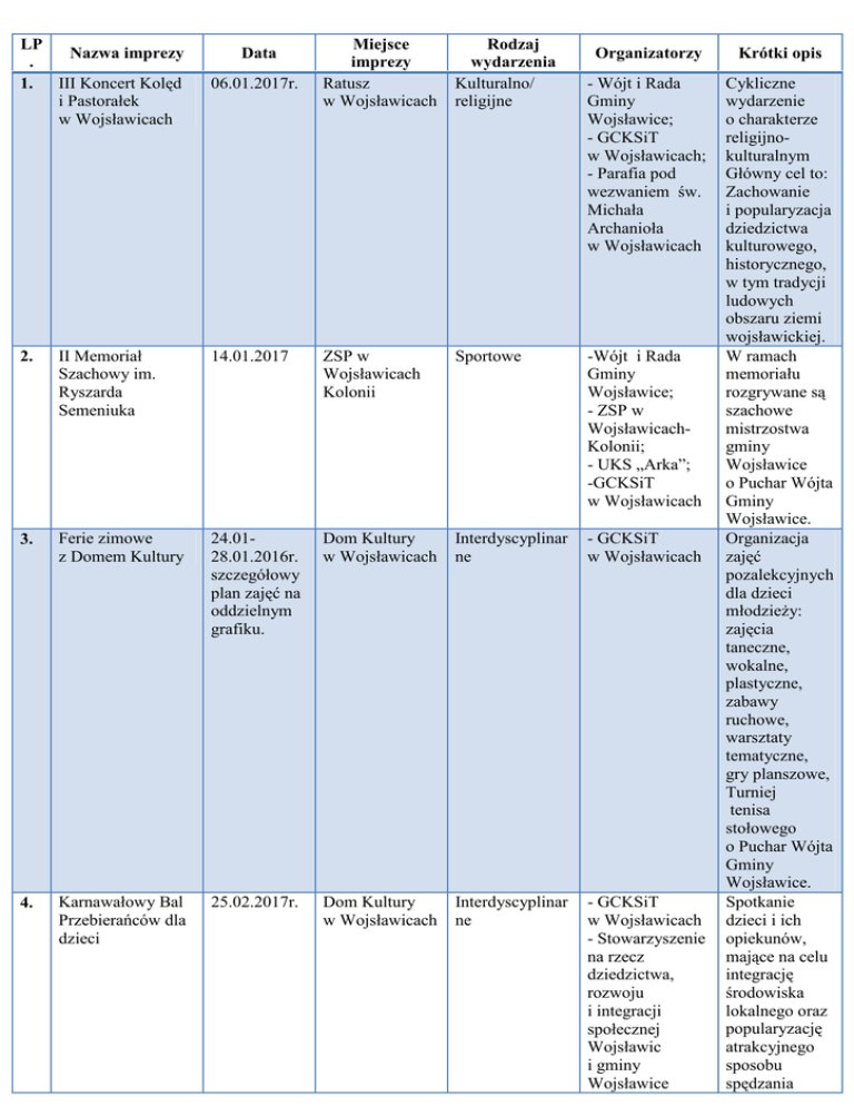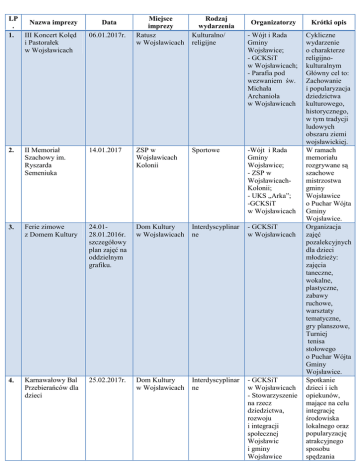 LP Nazwa imprezy . 1. III Koncert Kolęd i Pastorałek w Wojsławicach Data 06.01.2017r. Miejsce imprezy Ratusz w Wojsławicach Rodzaj wydarzenia Kulturalno/ religijne Organizatorzy Krótki opis - Wójt i Rada Gminy Wojsławice; - GCKSiT w Wojsławicach; - Parafia pod wezwaniem św. Michała Archanioła w Wojsławicach Cykliczne wydarzenie o charakterze religijnokulturalnym Główny cel to: Zachowanie i popularyzacja dziedzictwa kulturowego, historycznego, w tym tradycji ludowych obszaru ziemi wojsławickiej. W ramach memoriału rozgrywane są szachowe mistrzostwa gminy Wojsławice o Puchar Wójta Gminy Wojsławice. Organizacja zajęć pozalekcyjnych dla dzieci młodzieży: zajęcia taneczne, wokalne, plastyczne, zabawy ruchowe, warsztaty tematyczne, gry planszowe, Turniej tenisa stołowego o Puchar Wójta Gminy Wojsławice. Spotkanie dzieci i ich opiekunów, mające na celu integrację środowiska lokalnego oraz popularyzację atrakcyjnego sposobu spędzania 2. II Memoriał Szachowy im. Ryszarda Semeniuka 14.01.2017 ZSP w Wojsławicach Kolonii Sportowe -Wójt i Rada Gminy Wojsławice; - ZSP w WojsławicachKolonii; - UKS „Arka”; -GCKSiT w Wojsławicach 3. Ferie zimowe z Domem Kultury 24.0128.01.2016r. szczegółowy plan zajęć na oddzielnym grafiku. Dom Kultury w Wojsławicach Interdyscyplinar ne - GCKSiT w Wojsławicach 4. Karnawałowy Bal Przebierańców dla dzieci 25.02.2017r. Dom Kultury w Wojsławicach Interdyscyplinar ne - GCKSiT w Wojsławicach - Stowarzyszenie na rzecz dziedzictwa, rozwoju i integracji społecznej Wojsławic i gminy Wojsławice „Szansa” 5. Koncert z okazji Dnia Kobiet 05.03.2017 Dom Kultury w Wojsławicach 6. Wiosna nasza radosna! 25.03.2017 Dom Kultury w Wojsławicach wolnego czasu. Zabawy plastyczne, gry ruchowe i integracyjne, prezentacje grup tanecznych i wokalnych działających przy GCKSiT w Wojsławicach, zabawa taneczna, poczęstunek Kulturalno/rozry - Wójt i Rada Część w-kowe Gminy artystyczna, Wojsławice; prezentacje - GCKSiT grup w Wojsławicach wokalnych i tanecznych działających przy GCKSiT w Wojsławicach, okolicznościow e życzenia, słodkości…. Interdyscyplinar - GCKSiT Spotkanie ne w Wojsławicach; dzieci i ich - Stowarzyszenie opiekunów, na rzecz mające na celu dziedzictwa, integrację rozwoju środowiska i integracji lokalnego oraz społecznej popularyzację Wojsławic atrakcyjnego i gminy sposobu Wojsławice spędzania „Szansa” wolnego czasu. Zabawy plastyczne, gry ruchowe i integracyjne, prezentacje grup tanecznych i wokalnych działających przy GCKSiT w Wojsławicach, poczęstunek. 7. Uroczyste Obchody 73 Rocznicy Bitwy pod Wojsławicami 20.04.2016r. Dom Kultury w Wojsławicach Kulturalno/patriotyczne - Wójt i Rada Gminy Wojsławice; - ZSP w WojsławicachKolonii; - GCKSiT w Wojsławicach 8. Jubileusz 70-lecia działalności artystycznej Zofii Sulikowskiej 27.04.2017r. Dom Kultury w Wojsławicach Kulturalno/rozrywkowe 9. Ultramaraton 29.04.2017r. „Piękny Wschód” – zawody kolarskie o zasięgu międzynarodowym Plac przed Ratuszem Sportowe - Starostwo Powiatowe w Chełmie - Wójt i Rada Gminy Wojsławice; - GCKSiT w Wojsławicach - Wójt i Rada Gminy Wojsławice; - GCKSiT w Wojsławicach 10. Obchody święta uchwalenia Konstytucji 3 Maja 03.05.2017r. Dom Kultury w Wojsławicach Kulturalno/patriotyczne - Wójt i Rada Gminy Wojsławice; - ZSP w WojsławicachKolonii; - GCKSiT w Wojsławicach 11. Dzień Strażaka 04.05.2017r. Plac przed Ratuszem w Wojsławicach Rozrywkowe - Wójt i Rada Gminy Wojsławice; - OSP z terenu gminy Wojsławice; - GCKSiT w Wojsławicach 12. Światowy Dzień Inwalidy i Osób Niepełnosprawnych 18.05.2017r. Dom Kultury w Wojsławicach Interdyscyplinar ne - Wójt i Rada Gminy Wojsławice, Msza św. w kościele parafialnym w Wojsławicach, uroczystości patriotyczne: złożenie wieńców pod pomnikiem Poległych w Bitwie pod Wojsławicami, akademia. Jubileusz pracy twórczej, występy artystyczne Punkt kontrolny na trasie wyścigu rowerowego „Piękny Wschód”. Msza św. w kościele parafialnym w Wojsławicach, uroczystości patriotyczne: złożenie wieńców pod pomnikiem Tadeusza Kościuszki w Wojsławicach, akademia Część artystyczna na palcu przed Ratuszem w Wojsławicach, Msza św. w kościele parafialnym w Wojsławicach. Spotkanie integracyjne, część artystyczna, - WTZ w Wojsławicach - Oddział Rejonowy PZERiI w Wojsławicach - GCKSiT w Wojsławicach 13. IV Powiatowy Festiwal Piosenki Dziecięcej „Dziecięce Nutki” 21.05.2017r. Dom Kultury w Wojsławicach Kulturalno/rozrywkowe 14. Dzień Dziecka nad stawem 28.05.2017r. Teren przyległy do zbiornika wodnego w Wojsławicach Interdyscyplinar ne - Starostwo Powiatowe w Chełmie; - Stowarzyszenie na rzecz dziedzictwa, rozwoju i integracji społecznej Wojsławic i gminy Wojsławice „Szansa”; - GCKSiT w Wojsławicach - Wójt i Rada Gminy Wojsławice; - GCKSiT w Wojsławicach; - WOPR oddział w Chełmie prezentacje WTZ w Wojsławicach oraz grup wokalnych działających przy GCKSiT w Wojsławicach. Festiwal piosenki w wykonaniu dzieci w wieku przedszkolnym , z terenu powiatu chełmskiego, zabawy integracyjne dla uczestników festiwalu. Spotkanie dzieci i ich opiekunów, mające na celu integrację środowiska lokalnego oraz popularyzację atrakcyjnego sposobu spędzania wolnego czasu. Zabawy plastyczne, gry ruchowe i integracyjne, prezentacje grup tanecznych i wokalnych działających przy GCKSiT w Wojsławicach, poczęstunek, możliwość korzystania ze sprzętu wodnego (kajaki, rowery wodne). 15. XVI Powiatowy Festiwal Pieśni i Piosenki Religijnej 18.06.2017r. Kościół p.w. św. Kulturalno/reliArchanioła gijne Michała w Wojsławicach 16. Turniej Gmin ,,Między nami sąsiadami" 02.07.2017r. Gmina Dorohusk 17. XI edycja Spotkania Trzech Kultur 09.07.2017r. 18. XII Dni Jakuba Wędrowycza 21-23. 07.2017r. Interdyscyplinar ne Wojsławice Kulturalno/rozrywkowe ZSP w WojsławicachKolonii, Dom Kultury w Wojsławicach Interdyscy