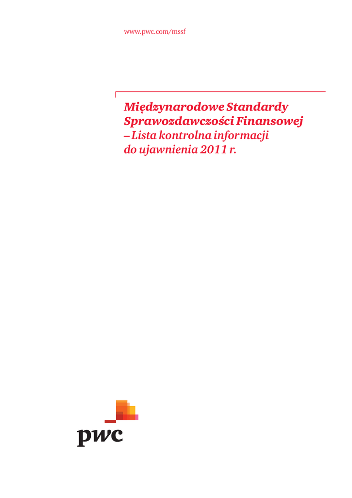 www.pwc.com/mssf Międzynarodowe Standardy Sprawozdawczości Finansowej – Lista kontrolna informacji do ujawnienia 2011 r. Mi´dzynarodowe Standardy SprawozdawczoÊci Finansowej – Lista kontrolna informacji do ujawnienia 2011 Wprowadzenie Lista kontrolna informacji do ujawnienia wg MSSF została uaktualniona aby uwzgl´dniç standardy i interpretacje obowiàzujàce dla lat obrotowych rozpoczynajàcych si´ w styczniu 2011 r.. Nowe i zmienione standardy i interpretacje obowiàzujàce od 2011 r. obejmujà: • MSR 24 „Ujawnienie dot. stron powiàzanych” • KIMSF 19 „Regulowanie zobowiàzaƒ finansowych przy pomocy instrumentów kapitałowych” • KIMSF 14 „Przedpłaty zwiàzane z minimalnymi wymogami finansowania” • Zmiana do MSR 32 „Klasyfikacja praw poboru” • Zmiany do MSSF 1 „Ograniczone zwolnienie z prezentacji danych porównawczych zgodnie z MSSF 7” • Poprawki do MSSF 2010 (projekt corocznych poprawek) Data wydania Data wejÊcia w ˝ycie listopad 2009 r. 1 stycznia 2011 r. listopad 2009 r. 1 lipca 2010 r.* listopad 2009 r. 1 stycznia 2011 r.* paêdziernik 2009 r. 1 lutego 2010 r.* styczeƒ 2010 r. maj 2010 r. 1 lipca 2010 r.* (ró˝nie, w wi´kszoÊci styczeƒ 2011 r.) Obszary, w których wymogi ujawnienia uległy zmianie w porównaniu do 2010 zostały zaznaczone szarym tłem Lista kontrolna nie zajmuje si´ wymogami MSSF w zakresie ujmowania i wyceny. Aby je poznaç, konieczna jest uwa˝na lektura standardów i interpretacji, które majà zastosowanie dla danej jednostki sprawozdawczej. Niniejsza lista kontrolna informacji do ujawnienia nie obejmuje MSR 34 - Âródroczna sprawozdawczoÊç finansowa. Wymogi dotyczàce ujawniania informacji oparte na standardach i interpretacjach, które zostały wydane i obowiàzujà dla okresów rocznych rozpoczynajàcych si´ 1 stycznia 2011 r. lub póêniej w 2011, sà zamieszczone w Cz´Êci A. Sporzàdzajàc sprawozdanie finansowe zgodnie z MSSF, jednostka powinna nale˝ycie uwzgl´dniç właÊciwe wymogi lokalne i regulacyjne. Ta lista kontrolna ujawnieƒ wg MSSF nie uwzgl´dnia ˝adnych wymogów konkretnych jurysdykcji. Niniejsza lista kontrolna słu˝y wyłàcznie ogólnej orientacji co do wymogów w zakresie ujawniania informacji i nie zastàpi lektury samych standardów czy interpretacji ani fachowej oceny, czy osiàgni´to cel rzetelnej prezentacji. W zale˝noÊci od okolicznoÊci, dla osiàgni´cia celu rzetelnej prezentacji stosownie do MSSF, mogà byç wymagane dodatkowe specyficzne informacje. Ponadto lista kontrolna nie obejmuje informacji, których ujawnienie wymagane jest przez krajowe przepisy, krajowe standardy sprawozdawczoÊci finansowej i/lub regulacje giełdowe PwC 1 Mi´dzynarodowe Standardy SprawozdawczoÊci Finansowej – Lista kontrolna informacji do ujawnienia 2011 Struktura listy kontrolnej informacji do ujawnienia Cz´Êç A Cz´Êç B Cz´Êç C Cz´Êç D Cz´Êç E Cz´Êç F Cz´Êç G Wymogi informacyjne do rozwa˝enia przez wszystkie jednostki Wymogi informacyjne obowiàzujàce wszystkie jednostki, lecz tylko w niektórych sytuacjach Bran˝owe wymogi informacyjne Dodatkowe wymogi informacyjne obowiàzujàce spółki notowane na giełdzie Dodatkowe wymogi informacyjne obowiàzujàce ubezpieczycieli Wymogi informacyjne programów Êwiadczeƒ emerytalnych Sugerowane informacje do ujawnienia w analizie finansowej niewchodzàcej w skład sprawozdania finansowego Układ listy kontrolnej informacji do ujawnienia Lista kontrolna informacji do ujawnienia przedstawiona jest w układzie majàcym ułatwiaç gromadzenie i przeglàd informacji, których ujawnienie wymagane jest w odniesieniu do ka˝dej cz´Êci składowej sprawozdania finansowego. Tam, gdzie to byto właÊciwe, wymogi informacyjne pogrupowane zostały według tematów. Dodatkowe informacje i objaÊnienia do listy kontrolnej przedstawione sà kursywà. Odsyłacze zamieszczone po lewej stronie oznaczajà punkty standardów, w których pojawia si´ dany wymóg ujawnienia informacji; i tak np. „8p40” oznacza par. 40 MSR 8. „UN” ujawnienie nieobowiàzkowe”) oznacza, ˝e dany MSSF zach´ca do ujawnienia odnoÊnych informacji, lecz tego nie wymaga. Dodatkowe informacje i objaÊnienia przedstawione sà kursywà. Wymogi dotyczàce ujawnienia informacji oparte na standardach i interpretacjach, które zostały wydane, ale jeszcze nie weszły w ˝ycie, zamieszczono w odpowiedniej cz´Êci razem z wymaganiami, które oparte sà na standardach i interpretacjach wcià˝ obowiàzujàcych. Kolumny po prawej cz´Êci strony pomagaç majà w wypełnianiu listy kontrolnej. W lewej kolumnie (oznaczonej T-ND-N) wpisaç nale˝y jedno z poni˝szych oznaczeƒ w odniesieniu do ka˝dej informacji do ujawnienia: • T („Tak”) – ujawniono wymagane informacje; • ND („Nie dotyczy”) – wymóg nie ma zastosowania do jednostki sprawozdawczej; • N („Nieistotne”) – danà pozycj´ uznaje si´ za nieistotnà z punktu widzenia sprawozdania finansowego jednostki sprawozdawczej. Poj´cie „istotnoÊci” zdefiniowane jest w par. 11 MSR 1 oraz w par. 29 i 30 „Zało˝eƒ koncepcyjnych sporzàdzania i prezentacji sprawozdaƒ finansowych”. Par. 31 MSR 1 stwierdza, ˝e nie ma obowiàzku spełniania danego wymogu informacyjnego standardu lub interpretacji, je˝eli odnoÊne informacje nie sà istotne. W prawej kolumnie (oznaczonej „ODS.”) zamieÊciç mo˝na odsyłacz do odpowiedniej cz´Êci sprawozdania finansowego (np. nota 7) w odniesieniu do wszystkich pozycji oznaczonych literà „T” w lewej kolumnie. 2 PwC Mi´dzynarodowe Standardy SprawozdawczoÊci Finansowej – Lista kontrolna informacji do ujawnienia 2011 Spis treÊci Cz´Êç A Wymogi informacyjne do rozwa˝enia przez wszystkie jednostki 5 A1 Ogólne informacje do ujawnienia 1. Ogólne informacje do ujawnienia 2. Waluta prezentacji i waluta funkcjonalna 3. Pozostałe informacje do ujawnienia 7 7 8 8 A2 Zasady (polityka) rachunkowoÊci 1. Ogólne informacje do ujawnienia 2. Sz