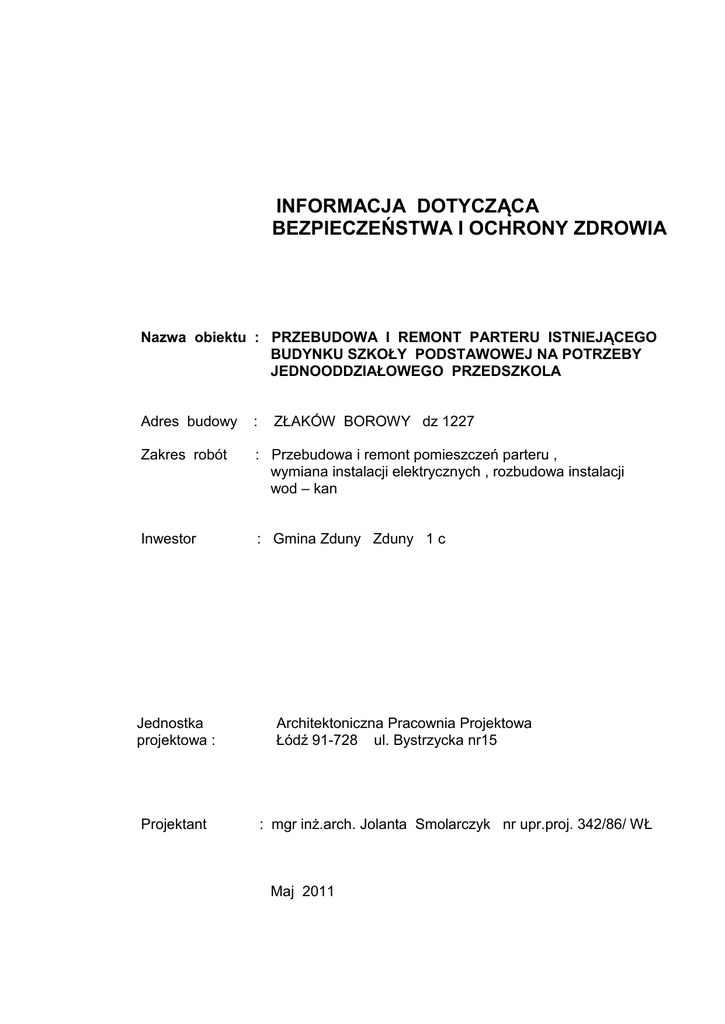 INFORMACJA DOTYCZĄCA BEZPIECZEŃSTWA I OCHRONY ZDROWIA Nazwa obiektu : PRZEBUDOWA I REMONT PARTERU ISTNIEJĄCEGO BUDYNKU SZKOŁY PODSTAWOWEJ NA POTRZEBY JEDNOODDZIAŁOWEGO PRZEDSZKOLA Adres budowy : Zakres robót : Przebudowa i remont pomieszczeń parteru , wymiana instalacji elektrycznych , rozbudowa instalacji wod – kan Inwestor : Gmina Zduny Zduny 1 c Jednostka projektowa : Projektant ZŁAKÓW BOROWY dz 1227 Architektoniczna Pracownia Projektowa Łódź 91-728 ul. Bystrzycka nr15 : mgr inż.arch. Jolanta Smolarczyk nr upr.proj. 342/86/ WŁ Maj 2011 INFORMACJA DOTYCZĄCA BEZPIECZEŃSTWA I OCHRONY ZDROWIA PRZEBUDOWA I REMONT POMIESZCZEŃ PARTERU BUDYNKU SZKOŁY PODSTAWOWEJ NA POTRZEBY JEDNOODDZIAŁOWEGO PRZEDSZKLA Adres budowy : ZŁAKÓW BOROWY dz nr 1227 1. Zakres robót - przebudowa i remont pomieszczeń parteru istniejącego budynku Szkoły Podstawowej w Złakowie Borowym - przebudowa schodów zewnętrznych - budowa pochylni dla niepełnosprawnych 2. Wykaz istniejących obiektów budowlanych - istniejący budynek Szkoły Podstawowej w Złakowie Borowym - istniejące przyłącze wody - istniejące przyłącze kanalizacji sanitarnej do zbiorników - istniejące przyłącze energetyczne napowietrzne do wymiany na izolowane 3. Elementy zagospodarowania mogące stwarzać zagrożenie - istniejący budynek szkoły - istniejące przyłącza 4. Wykaz przewidywanych zagrożeń podczas realizacji robót budowlanych : 4.1 roboty ziemne - budowa schodów wejściowych i pochylni 4.2 roboty murowe - prace prowadzone na wysokości do 3,0 m 4.3 roboty ciesielskie - brak 4.4 roboty betonowe i żelbetowe - podawanie masy betonowej - używanie sprzętu zmechanizowanego i pomocniczego 4.5 roboty montażowe - montaż nowych przewodów wodnych i kanalizacji sanitarnej - montaż nowej instalacji elektrycznej - wymiana przyłącza energetycznego na nowe izolowane 4.6 roboty izolacyjne i antykorozyjne - przygotowywanie mieszanek w odpowiednich urządzeniach grzewczych 4.7 roboty wykończeniowe - wykonywanie prac na wysokości do 3,0 m - wykonywanie powłok malarskich - montaż okładzin ściennych i podłogowych 4.8 roboty wykończeniowe zewnętrzne - wykonywanie nawierzchni schodów i pochylni - montaż nowych balustrad schodów i pochylni - montaż nawierzchni z kostki betonowej przed wejściami do obiektu 5. Wskazanie sposobu przeprowadzenia instruktażu pracowników Bezpośrednio przed przystąpieniem do prac ze zwróceniem szczególnej uwagi na elementy zagrożenia wymienione w punkcie 4. 6. Wskazanie środków technicznych i organizacyjnych zapewniających bezpieczne wykonywanie robót : 6.1 roboty ziemne - wykopy do głębokości 1,0 m ppt 6.2 prace na wysokościach - brak 6.3 prace ciesielskie - brak 6.4 prace zbrojarskie - brak 6.5 betonowanie - pojemniki z betonem lub podawanie mieszanki przy użyciu rurowych podajników prowadzić równomiernie aby nie doprowadzić do przeciążenia szalunków i deskowań . Bezpieczna wysokość podawania < 1,0 m . 6.6 prace izolacyjne - urządzenia grzewcze powinny być dostosowane do rodzaju wykonywanych prac i powinny być eksploatowane zgodnie z instrukcją producenta 6.7 prace wykończeniowe - do prac na wysokości stosować odpowiednie rusztowania i pomosty z zabezpieczeniami od poziomu powyżej 2,0 m w barierki ochronne o h= 1,10 m i odbojnice - prace malarskie na wysokości prowadzone z drabin przestawnych dozwolone do h= 4,0 m , drabiny powinny być zabezpieczone przed rozsunięciem . - w trakcie prowadzenia prac malarskich należy odłączyć instalacje elektryczne - obróbkę kamienia lub płytek podłogowych prowadzić przy użyciu sprawnego sprzętu mechanicznego . Stosować sprzęt ochronny . 6.8 prace zewnętrzne wokół budynku - prowadzić przy użyciu sprawnego sprzętu mechanicznego - teren oznakować i odizolować od dostępu osób postronnych 6.9 prace prowadzone przy użyciu sprzętu zmechanizowanego - maszyny , urządzenia i sprzęt które podlegają dozorowi technicznemu powinny posiadać dokumenty uprawniające do ich eksploatacji - przestrzegać należy dopuszczalnych parametrów takich jak : nośność , udźwig, ciśnienie , temperatura . - ruchome części mechanizmów sprzętu zmechanizowanego muszą być wyposażone w osłony zapobiegające wypadkom . 7. Informacje dodatkowe - prace mogą wykonywać wyłącznie pracownicy posiadający aktualne badania zdrowotne - poszczególne prace mogą wykonywać pracownicy posiadający odpowiednie kwalifikacje i uprawnienia do obsługi sprzętu . - przed przystąpieniem do realizacji prac szczególnie niebezpiecznych należy odpowiednio przeszkolić pracowników ze szczególnym uwzględnieniem stosowania bezpiecznych metod pracy . - pracownicy powinni być wyposażeni odzież roboczą i sprzęt ochronny oraz kaski ochronne - sprzęt ochronny powinien posiadać atesty i instrukcję określającą sposób użytkowania i konserwacji . - przy wykonywaniu prac należy używać : masek ochronnych z pochłaniaczami , okularów ochronnych , masek przeciwpyłowych , szelek bezpieczeństwa itp stosownie do poszczególnych stanowisk pracy . W obiekt należy wbudowywać materiały posiadające atesty , aprobaty dopuszczające do stosowania w budownictwie . W/w roboty należy prowadzić również w oparciu o warunki techniczne wykonania i odbioru robót budowlano-montażowych wyd. Arkady zgodnie z przepisami bezpieczeństwa i higieny pracy Dz. U. nr47 z 2003 r. Realizacja robót pod nadzorem osób uprawnionych w oparciu o obowiązujące w tym zakresie przepisy i normy na podstawie uzyskanej decyzji o pozwoleniu na budowę. Ewentualne zmiany przyjętych rozwiązań konstrukcyjno materiałowych po uzyskaniu zgody autora projektu i kierownika budowy powinny być potwierdzone wpisem do Dziennika Budowy. Odbiór techniczny zgodnie z PN-85/B-10702 oraz w/w warunkami technicznymi . opracowała : arch. J.Smolarczyk
