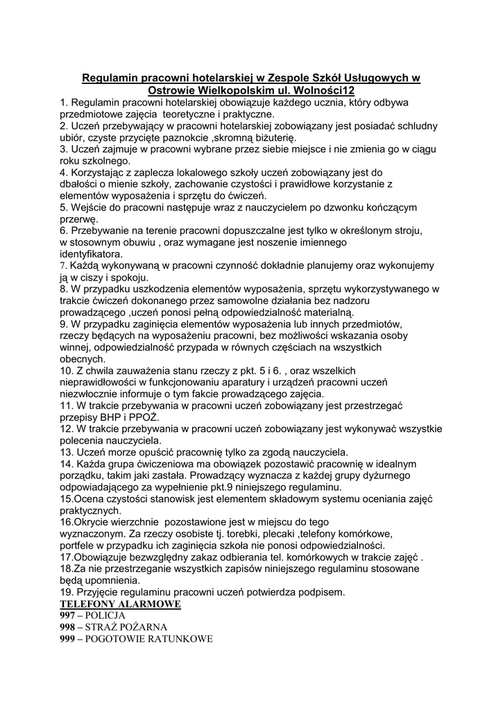 Regulamin pracowni hotelarskiej w Zespole Szkół Usługowych w Ostrowie Wielkopolskim ul. Wolności12 1. Regulamin pracowni hotelarskiej obowiązuje każdego ucznia, który odbywa przedmiotowe zajęcia teoretyczne i praktyczne. 2. Uczeń przebywający w pracowni hotelarskiej zobowiązany jest posiadać schludny ubiór, czyste przycięte paznokcie ,skromną biżuterię. 3. Uczeń zajmuje w pracowni wybrane przez siebie miejsce i nie zmienia go w ciągu roku szkolnego. 4. Korzystając z zaplecza lokalowego szkoły uczeń zobowiązany jest do dbałości o mienie szkoły, zachowanie czystości i prawidłowe korzystanie z elementów wyposażenia i sprzętu do ćwiczeń. 5. Wejście do pracowni następuje wraz z nauczycielem po dzwonku kończącym przerwę. 6. Przebywanie na terenie pracowni dopuszczalne jest tylko w określonym stroju, w stosownym obuwiu , oraz wymagane jest noszenie imiennego identyfikatora. 7. Każdą wykonywaną w pracowni czynność dokładnie planujemy oraz wykonujemy ją w ciszy i spokoju. 8. W przypadku uszkodzenia elementów wyposażenia, sprzętu wykorzystywanego w trakcie ćwiczeń dokonanego przez samowolne działania bez nadzoru prowadzącego ,uczeń ponosi pełną odpowiedzialność materialną. 9. W przypadku zaginięcia elementów wyposażenia lub innych przedmiotów, rzeczy będących na wyposażeniu pracowni, bez możliwości wskazania osoby winnej, odpowiedzialność przypada w równych częściach na wszystkich obecnych. 10. Z chwila zauważenia stanu rzeczy z pkt. 5 i 6. , oraz wszelkich nieprawidłowości w funkcjonowaniu aparatury i urządzeń pracowni uczeń niezwłocznie informuje o tym fakcie prowadzącego zajęcia. 11. W trakcie przebywania w pracowni uczeń zobowiązany jest przestrzegać przepisy BHP i PPOŻ. 12. W trakcie przebywania w pracowni uczeń zobowiązany jest wykonywać wszystkie polecenia nauczyciela. 13. Uczeń morze opuścić pracownię tylko za zgodą nauczyciela. 14. Każda grupa ćwiczeniowa ma obowiązek pozostawić pracownię w idealnym porządku, takim jaki zastała. Prowadzący wyznacza z każdej grupy dyżurnego odpowiadającego za wypełnienie pkt.9 niniejszego regulaminu. 15.Ocena czystości stanowisk jest elementem składowym systemu oceniania zajęć praktycznych. 16.Okrycie wierzchnie pozostawione jest w miejscu do tego wyznaczonym. Za rzeczy osobiste tj. torebki, plecaki ,telefony komórkowe, portfele w przypadku ich zaginięcia szkoła nie ponosi odpowiedzialności. 17.Obowiązuje bezwzględny zakaz odbierania tel. komórkowych w trakcie zajęć . 18.Za nie przestrzeganie wszystkich zapisów niniejszego regulaminu stosowane będą upomnienia. 19. Przyjęcie regulaminu pracowni uczeń potwierdza podpisem. TELEFONY ALARMOWE 997 – POLICJA 998 – STRAŻ POŻARNA 999 – POGOTOWIE RATUNKOWE