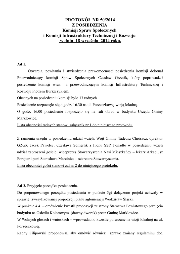 PROTOKÓŁ NR 50/2014 Z POSIEDZENIA Komisji Spraw Społecznych i Komisji Infrastruktury Technicznej i Rozwoju w dniu 18 września 2014 roku. Ad 1. Otwarcia, powitania i stwierdzenia prawomocności posiedzenia komisji dokonał Przewodniczący komisji Spraw Społecznych Czesław Grzesik, który poprowadził posiedzenie komisji wraz z przewodniczącym komisji Infrastruktury Technicznej i Rozwoju Piotrem Burszczykiem. Obecnych na posiedzeniu komisji było 13 radnych. Posiedzenie rozpoczęło się o godz. 16.30 na ul. Porzeczkowej wizją lokalną. O godz. 16.00 posiedzenie rozpoczęło się na sali obrad w budynku Urzędu Gminy Marklowice. Lista obecności radnych stanowi załącznik nr 1 do niniejszego protokołu. Z ramienia urzędu w posiedzeniu udział wzięli: Wójt Gminy Tadeusz Chrószcz, dyrektor GZGK Jacek Pawelec, Czesława Somerlik z Pionu SSP. Ponadto w posiedzeniu wzięli udział zaproszeni goście: wiceprezes Stowarzyszenia Nasi Mieszkańcy – lekarz Arkadiusz Forajter i pani Stanisława Marciniec – sekretarz Stowarzyszenia. Lista obecności gości stanowi zał nr 2 do niniejszego protokołu. Ad 2. Przyjęcie porządku posiedzenia. Do proponowanego porządku posiedzenia w punkcie 5g) dołączono projekt uchwały w sprawie: zweryfikowanej propozycji planu aglomeracji Wodzisław Śląski. W punkcie 4.4 – omówienie kwestii propozycji ze strony Starostwa Powiatowego przejęcia budynku na Osiedlu Kolorowym (dawny dworek) przez Gminę Marklowice. W Wolnych głosach i wnioskach – wprowadzono kwestie poruszane na wizji lokalnej na ul. Porzeczkowej. Radny Filipowski proponował, aby omówić również sprawę zmiany regulaminu dot. dofinansowania do pieców i kotłów grzewczych. Taki wniosek złożył były radny Michał Cyroń. Wójt Tadeusz Chrószcz powiedział,że rozmawiał z panem Cyroniem na ten temat i zaproponował mu, aby złożył stosowny wniosek i sprawa zostanie wkrótce omówiona. Radni zaproponowali, aby tą sprawę omówić na następnym posiedzeniu komisji w miesiącu październiku b.r. Ad 3. Protokół z posiedzenia komisji ITR Nr 49/2014 z dnia 21 sierpnia 2014r. - został przyjęty pozytywnie „jednogłośnie”. Tematy komisji Spraw Społecznych: Ad 4. 2. Przeciwdziałanie narkomanii i alkoholizmowi – sprawozdanie złożyła Czesława Somerlik, insp. w Pionie SSP. W ramach środków pozyskanych z koncesji alkoholowych, które wpłynęły do budżetu gminy organizowano zimowe ferie w: − SP-1: zajęcia świetlicowe, na sali, dzieci otrzymały ciepły posiłek (40 dzieci). − W SP-2 – zorganizowano wyjazdy do Fikolandii i różne zabawy, naukę jazdy na łyżwach, ciepły poczęstunek dla wszystkich uczestniczących 29 dzieci). − Gimnazjum – wyjazdy do kina, na lodowisko, basen, poczęstunek otrzymały 21 uczestniczących dzieci. − Ponadto organizowano festyny rodzinne, różne zajęcia profilaktyczne. Codziennie dożywianych jest 13 dzieci z rodzin biedniejszych i w trudnej sytuacji życiowej. − W ramach wakacyjnych półkolonii dzieci jeździły na basen (2 godziny basenu codziennie) i zwiedzały region (okolice Raciborza i Żor). − Prenumerowane są ponadto poradniki: Antidotum i Fenix. − Organizowane były biegi uliczne o tytułach profilaktycznych. − Gminna Komisja współpracuje z Ośrodkiem Pomocy Społecznej, Gminnym Zespołem Interdyscyplinarnym, Policją oraz pedagogami szkolnymi. W 2014 roku Komisja spotkała się 12 razy i wezwała w sumie 36 osób. Szczegółowe: Sprawozdanie z realizacji Gminnego Programu Profilaktyki i Rozwiązywania Problemów Alkoholowych - stanowi załącznik nr 3 do niniejszego protokołu. Ad 4. 1. Tworzenie hospicjum na terenie Powiatu Wodzisławskiego – problematykę związaną z tworzeniem hospicjum domowego na terenie powiatu wodzisławskiego przedstawiła pani Stanisława Marciniec, sekretarz stowarzyszenia „Nasi Mieszkańcy” i lekarz Arkadiusz Forajter, wiceprezes. Pani Stefania Marciniec poinformowała, że każdego roku 400 osób z terenu powiatu wodzisławskiego choruje na raka. Powstało zatem stowarzyszenie Nasi Mieszkańcy, które ma zająć się tworzeniem hospicjum na terenie powiatu. Hospicjum będzie się opierało na pracy wolontariuszy. Organizacyjnie polegać ma na odwiedzaniu chorych w domach. Organizowana jest wypożyczalnia sprzętu. Stowarzyszenie pozyskało łóżka z Francji. Organizatorzy chcą świadczyć usługi na rzecz najbardziej potrzebujących. Współpracują z hospicjum w Żorach. W hospicjum działać będą lekarze i pielęgniarki przygotowane do opieki paliatywnej. Problem śmierci dotyka każdego z nas. W stowarzyszeniu podejmowane będą kroki w kierunku uśmierzania bólu ludzi terminalnie chorych, dawania nadziei, dobrych uczuć i pozytywnych emocji. Problematyka dotyczy nie tylko samych chorych, ale także ich małżonków, dzieci i krewnych. Obecnie sprowadzono z Francji łóżka, które będą bezpłatnie wypożyczane do domów chorych. Są to łózka lepsze niż w okolicznych szpitalach. Rozprowadzane są korzenie żonkili symbolizujące, że jesień zamyka pewien etap życia, ale na wiosnę znowu z korzenia wyrasta zielony liść i radosne żółte kwiaty. Chętnie młodzież angażuje się w działania fundacji. Także z nimi trzeba o tym rozmawiać, a także rozmawiać o śmierci. Hospicjum ma za zadanie spełniać marzenia chorych. Mało mówimy o dodatkowych potrzebach, może ostatnich w życiu chorego. Trzeba zadbać także o sprawy duchowe. Dlatego potrzebna jest współpraca osób duchownych, psychologów i potrzeba każdych rąk, wolontariuszy. Także kosmetyczki, fryzjerki itp. umiejętności. Będzie niedługo wydana publikacja, która „pięknie o śmierci traktuje”. Na zakończenie pani Stefania rozdała ulotki i korzenie żonkili z numerami konta fundacji. Lekarz Arkadiusz Forajter wskazał, że hospicjum zajmie się opieką nad terminalnie chorymi. Będzie to bezpłatna opieka, ponieważ chory i jego rodzina najczęściej już jest zdr