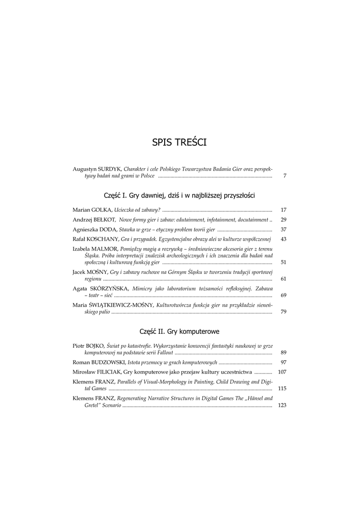 SPIS TREŚCI Augustyn SURDYK, Charakter i cele Polskiego Towarzystwa Badania Gier oraz perspektywy badań nad grami w Polsce ................................................................................... 7 Część I. Gry dawniej, dziś i w najbliŜszej przyszłości Marian GOLKA, Ucieczka od zabawy? ................................................................................ 17 Andrzej BEŁKOT, Nowe formy gier i zabaw: edutainment, infotainment, docutainment .. 29 Agnieszka DODA, Stawka w grze – etyczny problem teorii gier ........................................ 37 Rafał KOSCHANY, Gra i przypadek. Egzystencjalne obrazy alei w kulturze współczesnej 43 Izabela MALMOR, Pomiędzy magią a rozrywką – średniowieczne akcesoria gier z terenu Śląska. Próba interpretacji znalezisk archeologicznych i ich znaczenia dla badań nad społeczną i kulturową funkcją gier ................................................................................ 51 Jacek MOŚNY, Gry i zabawy ruchowe na Górnym Śląsku w tworzeniu tradycji sportowej regionu ........................................................................................................................... 61 Agata SKÓRZYŃSKA, Mimicry jako laboratorium toŜsamości refleksyjnej. Zabawa – teatr – sieć ................................................................................................................... 69 Maria ŚWIĄTKIEWICZ-MOŚNY, Kulturotwórcza funkcja gier na przykładzie sieneńskiego palio ..................................................................................................................... 79 Część II. Gry komputerowe Piotr BOJKO, Świat po katastrofie. Wykorzystanie konwencji fantastyki naukowej w grze komputerowej na podstawie serii Fallout ....................................................................... 89 Roman BUDZOWSKI, Istota przemocy w grach komputerowych ....................................... 97 Mirosław FILICIAK, Gry komputerowe jako przejaw kultury uczestnictwa ............. 107 Klemens FRANZ, Parallels of Visual-Morphology in Painting, Child Drawing and Digital Games ....................................................................................................................... 115 Klemens FRANZ, Regenerating Narrative Structures in Digital Games The „Hänsel and Gretel” Scenario ............................................................................................................. 123 6 Spis treści Jarosław JASIŃSKI, Uczestnicy masowych gier internetowych „cyfrową awangardą” współczesnego społeczeństwa informatycznego ............................................................. 131 Marta JUZA, RóŜnorodne formy internetowych zabaw typu „agon” ................................... 143 Piotr KONIECZNY, Symbole, interfejs uŜytkownika i agenci interfejsu w dialogu pomiędzy uŜytkownikiem a komputerem na przykładzie komputerowych ekonomicznych gier strategicznych ......................................................................................................... 151 Marta MIKLICZ, Rzeczywistość gry, gra w rzeczywistości. Alternate Reality Games ....... 161 Casey O’DONNELL, The Utility of Science and Technology Studies in the Emerging Discipline of Game Studies ............................................................................................ 173 Krzysztof OKOŃSKI, Neonazizm w Niemczech a treść, przesłanie dydaktyczne i dystrybucja gier komputerowych ............................................................................................. 181 Piotr SITARSKI, Historia, załoŜenia i praktyka klasyfikacji (ratingu) gier komputerowych w Europie i na świecie ................................................................................................... 189 Jan STASIEŃKO, Kategoria mimesis a gry komputerowe ................................................... 201 Magdalena SZPUNAR, Społeczna percepcja gier komputerowych ..................................... 211 Dominika URBAŃSKA-GALANCIAK, Czy damy radę? O walorach gier edukacyjnych dla dzieci w wieku przedszkolnym ................................................................................. 221 Zbigniew WAŁASZEWSKI, Audiowizualność gier komputerowych ................................. 227 Wojciech WIŚNIEWSKI, Prawdziwe Ŝycie w nierzeczywistym świecie. MUD-y jako zjawisko społeczne ......................................................................................................... 235 Część III. Narracyjne gry fabularne Dorota CHMIELEWSKA-ŁUCZAK, Cezar MATKOWSKI, Archetypiczna podróŜ bohatera w grach fabularnych ........................................................................................ 247 Ewa GALIŃSKA, Odgrywana postać a własne „ja” graczy RPG ....................................... 255 Diana KRYSIŃSKA, Role-Playing Games a rozwój moralny graczy .................................. 269 Krzysztof LESZCZYŃSKI, Problematyka granicy w symulacji i grze ................................ 277 Jadwiga A. PRZYBYŁOWSKA, Psychodrama. Gra jako forma terapii ............................. 287 Agata ZARZYCKA, Paladyn u babci, księŜniczka na zakupach. Kreacja postaci w narracyjnych grach fabularnych a wzorce osobowe we współczesnej kulturze zachodniej ..... 291 Noty o autorach ................................................................................................................... 301