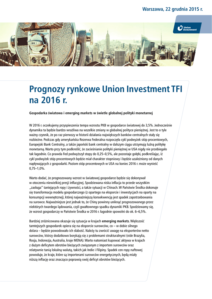 Prognozy rynkowe Union Investment TFI na 2016 r.