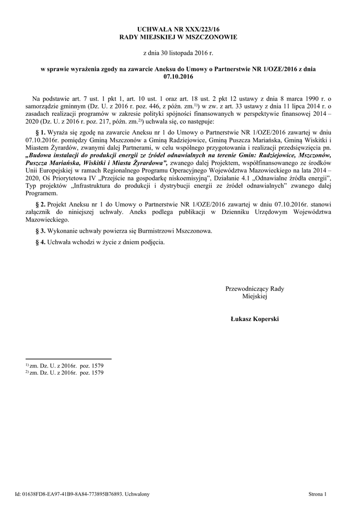UCHWAŁA NR XXX/223/16 RADY MIEJSKIEJ W MSZCZONOWIE z dnia 30 listopada 2016 r. w sprawie wyrażenia zgody na zawarcie Aneksu do Umowy o Partnerstwie NR 1/OZE/2016 z dnia 07.10.2016 Na podstawie art. 7 ust. 1 pkt 1, art. 10 ust. 1 oraz art. 18 ust. 2 pkt 12 ustawy z dnia 8 marca 1990 r. o samorządzie gminnym (Dz. U. z 2016 r. poz. 446, z późn. zm.1)) w zw. z art. 33 ustawy z dnia 11 lipca 2014 r. o zasadach realizacji programów w zakresie polityki spójności finansowanych w perspektywie finansowej 2014 – 2020 (Dz. U. z 2016 r. poz. 217, późn. zm.2)) uchwala się, co następuje: § 1. Wyraża się zgodę na zawarcie Aneksu nr 1 do Umowy o Partnerstwie NR 1/OZE/2016 zawartej w dniu 07.10.2016r. pomiędzy Gminą Mszczonów a Gminą Radziejowice, Gminą Puszcza Mariańska, Gminą Wiskitki i Miastem Żyrardów, zwanymi dalej Partnerami, w celu wspólnego przygotowania i realizacji przedsięwzięcia pn. „Budowa instalacji do produkcji energii ze źródeł odnawialnych na terenie Gmin: Radziejowice, Mszczonów, Puszcza Mariańska, Wiskitki i Miasta Żyrardowa”, zwanego dalej Projektem, współfinansowanego ze środków Unii Europejskiej w ramach Regionalnego Programu Operacyjnego Województwa Mazowieckiego na lata 2014 – 2020, Oś Priorytetowa IV „Przejście na gospodarkę niskoemisyjną”, Działanie 4.1 „Odnawialne źródła energii”, Typ projektów „Infrastruktura do produkcji i dystrybucji energii ze źródeł odnawialnych” zwanego dalej Programem. § 2. Projekt Aneksu nr 1 do Umowy o Partnerstwie NR 1/OZE/2016 zawartej w dniu 07.10.2016r. stanowi załącznik do niniejszej uchwały. Aneks podlega publikacji w Dzienniku Urzędowym Województwa Mazowieckiego. § 3. Wykonanie uchwały powierza się Burmistrzowi Mszczonowa. § 4. Uchwała wchodzi w życie z dniem podjęcia. Przewodniczący Rady Miejskiej Łukasz Koperski 1) zm. 2) zm. Dz. U. z 2016r. poz. 1579 Dz. U. z 2016r. poz. 1579 Id: 01638FD8-EA97-41B9-8A84-773895B76893. Uchwalony Strona 1 Załącznik do Uchwały Nr XXX/223/16 Rady Miejskiej w Mszczonowie z dnia 30 listopada 2016 r. Aneks nr 1 z dnia 01.12.2016 do Umowy o Partnerstwie NR 1/OZE/2016 Zawartej w dniu 07.10.2016 w Radziejowicach w sprawie wspólnego przygotowania i realizacji przedsięwzięcia pn. „Budowa instalacji do produkcji energii ze źródeł odnawialnych na terenie Gmin: Radziejowice, Mszczonów, Puszcza Mariańska, Wiskitki i Miasta Żyrardowa” finansowanego ze środków Partnerów i środków Regionalnego Programu Operacyjnego Województwa Mazowieckiego na lata 2014-2020, Oś priorytetowa IV „Przejście na gospodarkę niskoemisyjną”, Działanie 4.1 „Odnawialne źródła energii”, Typ projektów „Infrastruktura do produkcji i dystrybucji energii ze źródeł odnawialnych”, pomiędzy Partnerami: GMINĄ RADZIEJOWICE, 96-325 Radziejowice, NIP 838-14-26-414, w imieniu której działa: ul. Kubickiego 10, REGON 750148414, Urszula Ciężka – Wójt Gminy, przy kontrasygnacie Teresy Jaworskiej - Skarbnika Gminy; będący Partnerem Wiodącym zwanym dalej Liderem, a GMINĄ MSZCZONÓW, 96-320 Mszczonów, Plac Piłsudskiego 1, REGON 750148609, NIP 838-14-26420, w imieniu której działa: Józef Grzegorz Kurek – Burmistrz Mszczonowa, przy kontrasygnacie Jadwigi Barbulant - Skarbnika Gminy; GMINĄ PUSZCZA MARIAŃSKA, 96-330 Puszcza Mariańska, ul. Stanisława REGON 750148390, NIP 836 15 14 865, w imieniu której działa: Papczyńskiego 1, Michał Staniak – Wójt Gminy, przy kontrasygnacie Joanny Skrockiej - Skarbnika Gminy; GMINĄ WISKITKI, 96-315 Wiskitki, ul. Kościuszki 1, REGON 750148549, NIP 8381426466, w imieniu której działa: Franciszek Grzegorz Miastowski – Wójt Gminy, przy kontrasygnacie Danuty Taras - Skarbnika Gminy; MIASTEM ŻYRARDÓW, 96-300 Żyrardów, NIP 8381464722, w imieniu którego działa: Plac Jana Pawła II 1, REGON 750148650, Prezydent Miasta Żyrardowa Wojciech Jasiński, przy kontrasygnacie Anny Krupy - Skarbnika Miasta; zwani dalej każdy z osobna Partnerem, a łącznie Partnerami, o następującej treści: § 1. W umowie o Partnerstwie NR 1/OZE/2016 z dnia 7.10.2016r., zmianie ulegają zapisy § 5, które otrzymują brzmienie: „§5 Id: 01638FD8-EA97-41B9-8A84-773895B76893. Uchwalony Strona 2 1. Planowany całkowity koszt Projektu wynosi 9 241 785,98 zł netto (słownie: dziewięć milionów dwieście czterdzieści jeden tysięcy siedemset osiemdziesiąt pięć złotych i dziewięćdziesiąt osiem groszy netto) + podatek VAT w wysokości 1 033 484,78 zł (słownie; jeden milion trzydzieści trzy tysiące czterysta osiemdziesiąt cztery złote i siedemdziesiąt osiem groszy) co stanowi kwotę 10 275 270,76 brutto (słownie: dziesięć milionów dwieście siedemdziesiąt pięć tysięcy dwieście siedemdziesiąt złotych i siedemdziesiąt sześć groszy brutto) . 2. Planowany koszt zadań realizowanych przez Lidera, Gminę Radziejowice 1 699 585,28 zł netto + podatek VAT w wysokości 190 150,62 zł co stanowi kwotę brutto 1 889 735,90 zł. 3. Planowany koszt zadań realizowanych przez Gminę Mszczonów + podatek VAT w wysokości 258 919,44 zł co stanowi kwotę brutto 2 639 047,44 zł. 2 380 128,00 zł netto 4. Planowany koszt zadań realizowanych przez Gminę Puszcza Mariańska 3 103 296,57 zł netto + podatek VAT w wysokości 355 552,21 zł co stanowi kwotę brutto 3 458 848,78 zł. 5. Planowany koszt zadań realizowanych przez Gminę Wiskitki + podatek VAT w wysokości 129 785,38 zł co stanowi kwotę brutto 1 249 265,31 zł. 1 119 479,93 zł netto 939 296,20 zł netto 6. Planowany koszt zadań realizowanych przez Miasto Żyrardów + podatek VAT w wysokości 99 077,13 co stanowi kwotę brutto 1 038 373,33 zł.” § 2. Zmianie ulega treść Załącznika nr 1 do Umowy o Partnerstwie NR 1/OZE/2016 z dnia 07.10.2016r., który otrzymuje brzmienie zgodne z Załącznikiem nr 1 do Aneksu nr 1 z dnia 01.12.2016r. do Umowy o Partnerstwie Nr 1/OZE/2016 z dnia 07.10.2016. § 3. Pozostałe zapisy Umowy o Partn