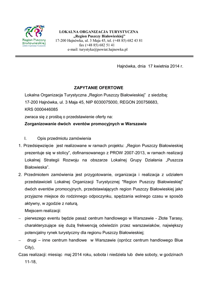 LOKALNA ORGANIZACJA TURYSTYCZNA „Region Puszczy Białowieskiej” 17-200 Hajnówka, ul. 3 Maja 45, tel. (+48 85) 682 43 81 fax (+48 85) 682 51 41 e-mail: [email protected] Hajnówka, dnia 17 kwietnia 2014 r. ZAPYTANIE OFERTOWE Lokalna Organizacja Turystyczna „Region Puszczy Białowieskiej” z siedzibą: 17-200 Hajnówka, ul. 3 Maja 45, NIP 6030075000, REGON 200756683, KRS 0000446085 zwraca się z prośbą o przedstawienie oferty na: Zorganizowanie dwóch eventów promocyjnych w Warszawie Opis przedmiotu zamówienia I. 1. Przedsięwzięcie jest realizowane w ramach projektu: „Region Puszczy Białowieskiej prezentuje się w stolicy”, dofinansowanego z PROW 2007-2013, w ramach realizacji Lokalnej Strategii Rozwoju na obszarze Lokalnej Grupy Działania „Puszcza Białowieska”. 2. Przedmiotem zamówienia jest przygotowanie, organizacja i realizacja z udziałem przedstawicieli Lokalnej Organizacji Turystycznej "Region Puszczy Białowieskiej" dwóch eventów promocyjnych, przedstawiających region Puszczy Białowieskiej jako przyjazne miejsce do rodzinnego odpoczynku, spędzania wolnego czasu w sposób aktywny, w zgodzie z naturą. Miejscem realizacji: pierwszego eventu będzie pasaż centrum handlowego w Warszawie - Złote Tarasy, charakteryzujące się dużą frekwencją odwiedzin przez warszawiaków, największy potencjalny rynek turystyczny dla regionu Puszczy Białowieskiej; drugi – inne centrum handlowe w Warszawie (oprócz centrum handlowego Blue City), Czas realizacji: miesiąc maj 2014 roku, sobota i niedziela lub dwie soboty, w godzinach 11-18, 3. Wykonawca zapewni: 1) Prowadzenie dwóch eventów przez konferansjera. 2) Projekt i wykonanie scenografii, aranżacja przestrzeni w postaci np. dużego ażurowego drzewa, przyciągającego uwagę odbiorców. 3) Aranżacja przestrzenna będzie miała charkter „do wielokrotnego użytku” i zostanie przekazana w całości Zamawiającemu. 4) Zapewnienie 4 animatorów działań z dziećmi (stylizacja kostiumów dla 4 osób). 5) Przeprowadzenie eko - zabaw dla dzieci, eko- konkursów, zapewnienie eko gadżetów dla dzieci, wykorzystanie balonów wypełnionych helem do rozdawania500 szt. 6) Wyposażenie stoisk w lokalne artykuły spożywcze (4 asortymenty wraz z transportem, noclegami i wyżywieniem 4 osób do obsługi, artykuły: np. sery, miody, miody pitne, herbatki i przyprawy, marcinek, wędliny i inne) 7) Zapewnienie programu artystycznego (występ zespołu, teatru, itp.) 8) Wykonanie poligrafii promocyjnej, projekt i nadzór, ulotki - DL, dwustronne, full kolor; 1000 szt. 9) Zapewnienie animatorów do dystrybucji ulotek. 10) Zapewnienie techniki audio, montaż i demontaż scenografii, transport scenografii i ludzi. 11) Zapewnienie pomocy Zamawiającemu w zakupie przestrzeni do realizacji eventów. Koszty zakupu przestrzeni: 10mX10m znajdują się po stronie Zamawiającego. 4. Odbiorcami eventu będą dorośli z dziećmi oraz osoby nastawione na aktywną turystykę, w otoczeniu przyrody. 5. Przedsięwzięcie będzie składało się z kilku płaszczyzn: 1) Działania wizualne – scenografia, która będzie związana z regionem Puszczy Białowieskiej (np. duże drzewo przyciągające uwagę odbiorców), stanowiąca element wielofunkcyjnej dekoracji oddziałującej sensualnie: audio - dźwięki natury; wzrokowo – duża, intrygująca kształtem forma; motorycznie – możliwość dotknięcia, animacji elementów dekoracyjnych). Będzie miejscem centralnym, wokół którego skoncentrowane będą pozostałe działania. 2) Działania informacyjne – prowadzone w sposób bezpośredni przez członków LOT, animatorów roznoszących ulotki i na bieżąco zapraszających do aktywnego udziału w działaniach. udzielających informacji, 3) Działania promocyjne – skupione na aktywnej, niestandardowej prezentacji najciekawszych elementów stanowiących o atrakcyjności regionu. Stanowiska prezentacyjne i degustacyjne z udziałem członków LOT „Region Puszczy Białowieskiej”, np. ekspozycja przykładowych możliwości aktywnego wypoczynku, atrakcji regionu; degustacja lokalnych specjałów, dla dzieci – animacje prowadzone przez animatorów angażujące dzieci do zabaw integracyjnych, w trakcie których będą poznawać ciekawostki o regionie. 4) Działania artystyczne – zapewnienie obsługi technicznej i występ zespołu z regionu Puszczy Białowieskiej, o wysokim poziomie artystycznym, posiadającym w swoim repertuarze piosenki z regionu Puszczy Białowieskiej, doświadczenie w występach poza granicami województwa, posiadający który w sposób atrakcyjny zaprezentuje bogactwo artystyczne regionu lub spektakl teatralny przedstawiający w sposób interaktywny i niestandardowy charakterystyczne melodie i historie regionu. 6. Program eventu powinien być przygotowany w sposób interesujący, z odniesieniem do specyfiki regionu, w oparciu o atrakcje regionu Puszczy Białowieskiej, z wykorzystaniem walorów kulturowych, produktów lokalnych, ofert turystycznych i tradycyjnej kuchni. 7. Przygotowanie i organizacja eventu powinna odbywać się w ścisłej współpracy z beneficjentem. 8. Działania powinny być wsparte poligrafią z treściami informacyjno-merytorycznymi oraz gadżetami, które stanowić będą pamiątkę - przypomnienie o regionie. 9. Ubezpieczenie uczestników eventu. II . 1.Złożona oferta powinna zawierać co najmniej: a) Nazwę i adres oferenta. b) Opis przedsięwzięcia przedstawionego w pkt. I wraz ze szcegółowym scenariuszem eventów zawierajacym między innymi opis lub/i szkice pogladowe realizacji pkt I ust.3. 3), scenariusze ekozabaw, projekt gadżetów, ilościowy i rodzajowy opis artykułów spożywczych, program artystyczny, projekt ulotki itp. c) Wykaz organizacji podobnych działań promocyjnych. c) Wartość oferty (netto oraz brutto) oraz budżet oferty w podziale na zadania. d) Termin ważności oferty 30 dni od daty złożenia oferty. 2. Wskazane jest, by oferta zawierała również inne d